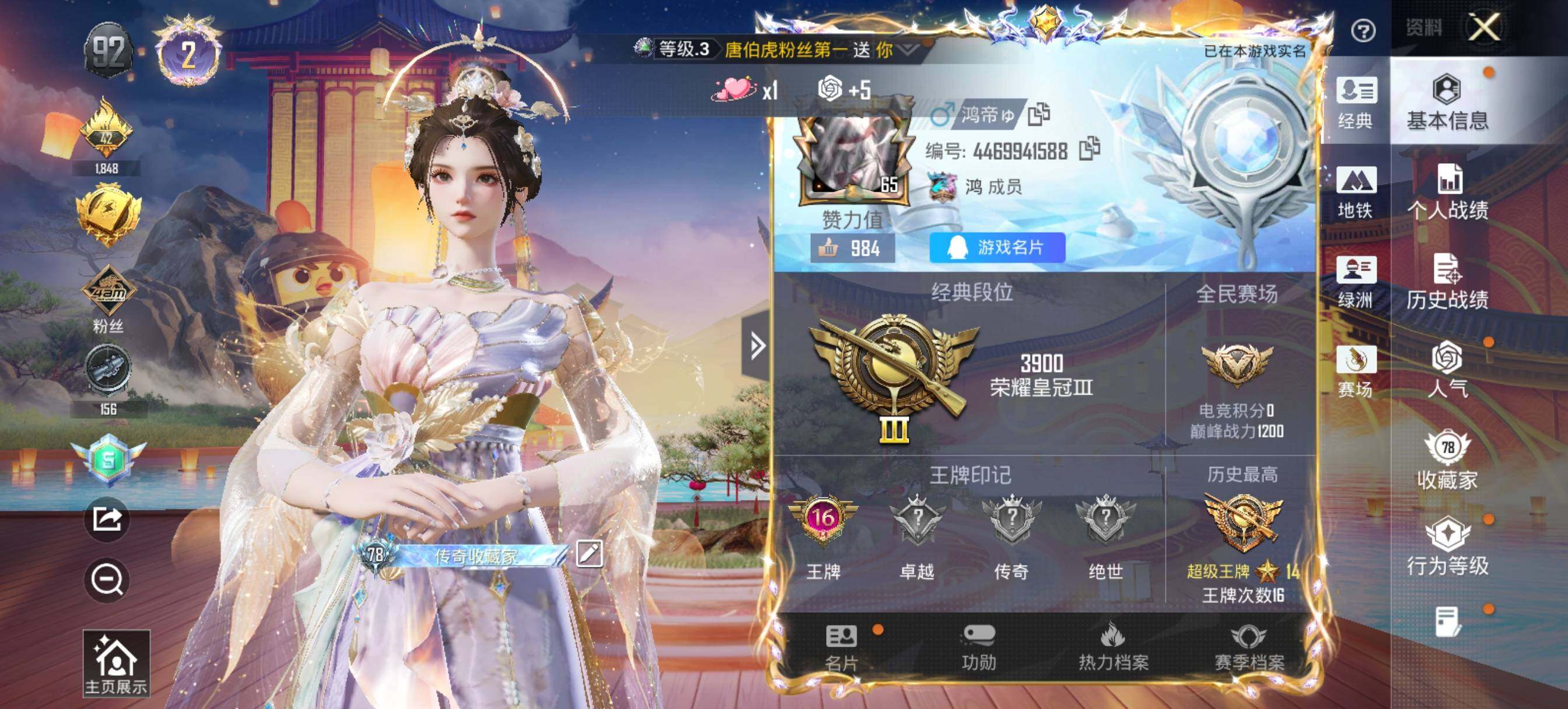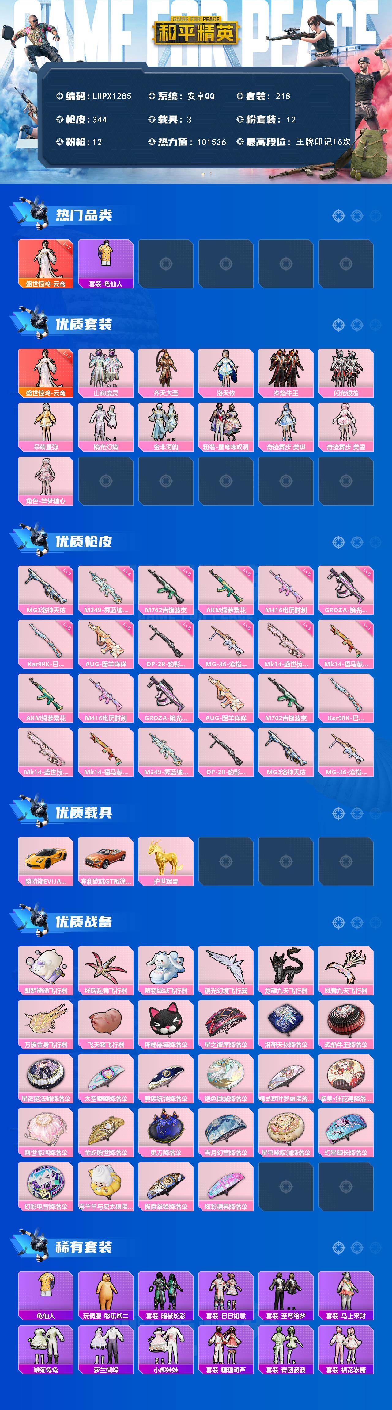 【特价出售/店主推荐】安卓 手Q-1神装-12粉装-12特效枪-3载具-8粉色飞行器-101536热力值-16王牌印记-218套装-344枪皮
