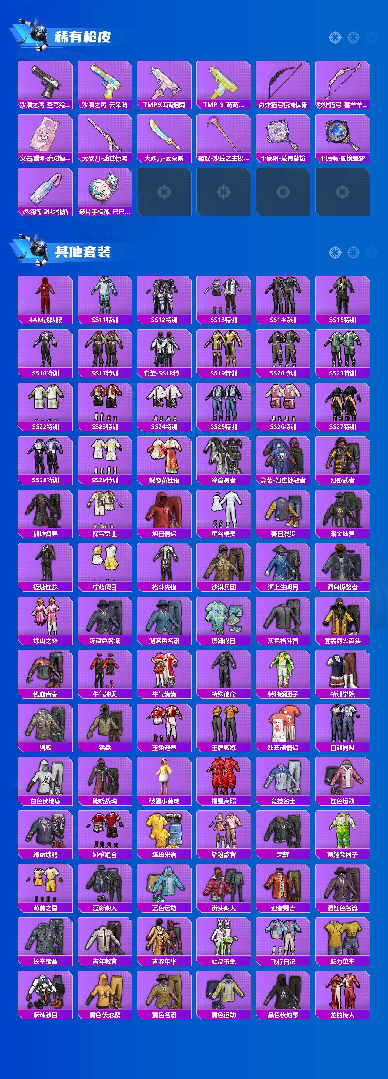 【粉色套装】:粉装-山涧鹿灵,粉装-齐天大圣,角色-洛天依,粉装-炙焰牛王,粉装-闪光银龙,角色-呆萌星弥,粉装-镜光幻境,粉装-金丰海韵,粉装-星穹