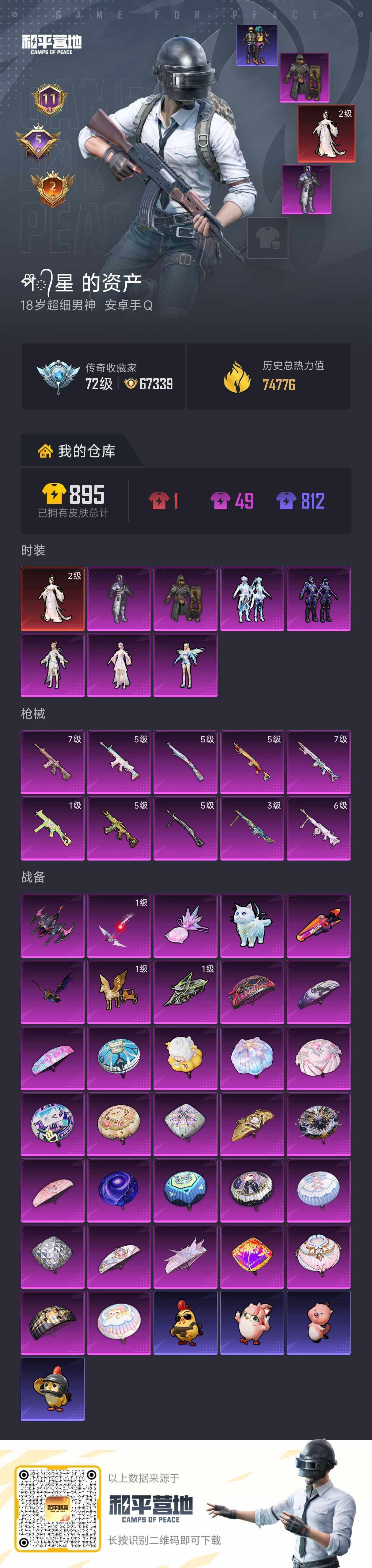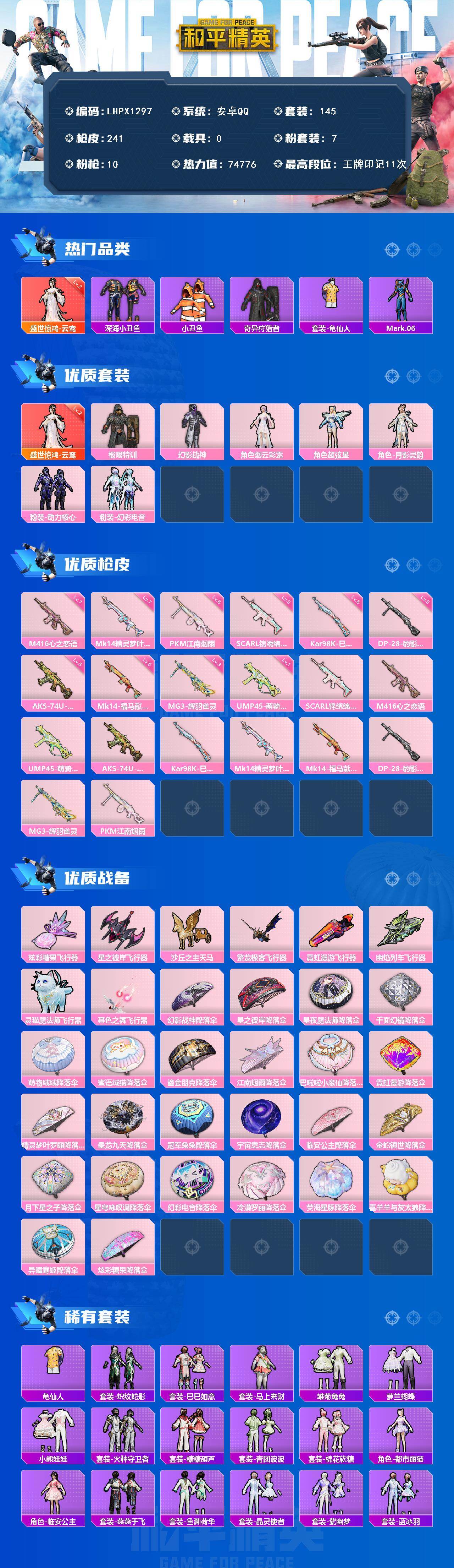 【特价出售/店主推荐】安卓 手Q-1神装-7粉装-10特效枪-0载具-8粉色飞行器-74776热力值-11王牌印记-145套装-241枪皮