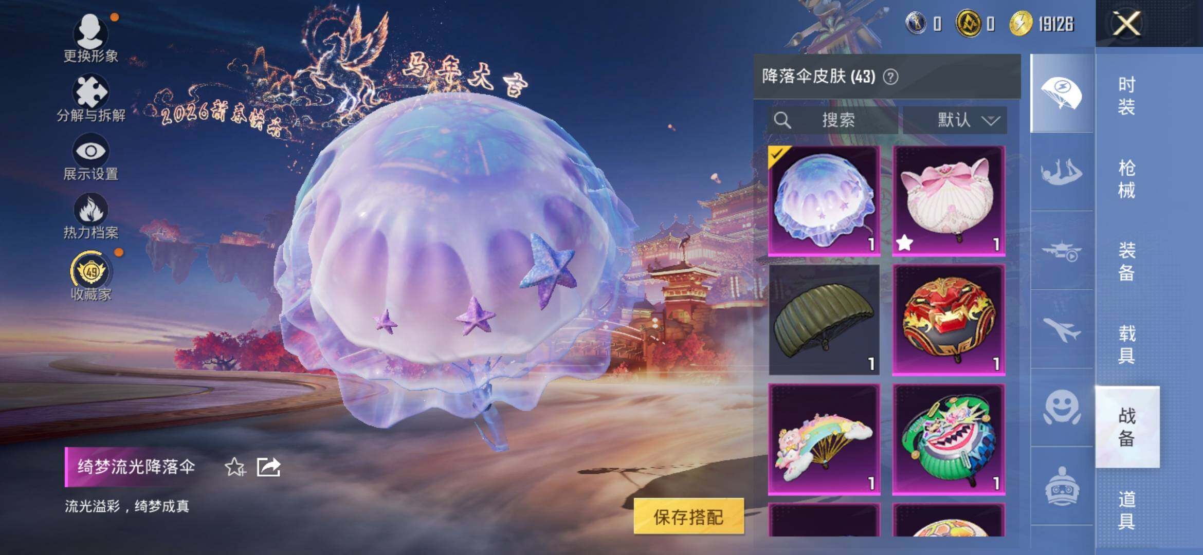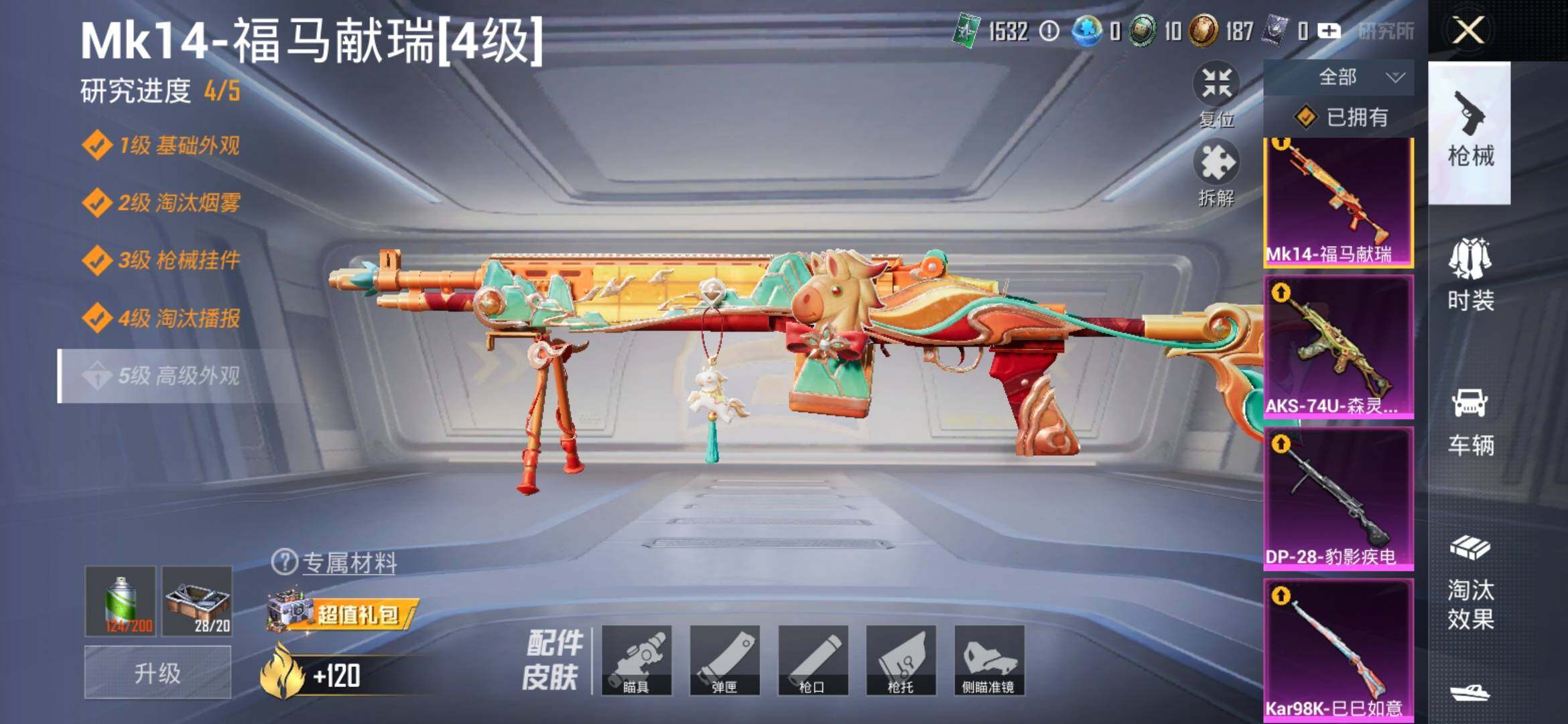 【8特效枪】 AKS-74U-森灵之息 (3级) Kar98K-巳巳如意 (2级) DP-28-豹影疾电 (5级) Mk14-福马献瑞 (4级) AA12-G-萌骑幻想 (2级) PKM-萌骑夺宝 (3级) UMP45