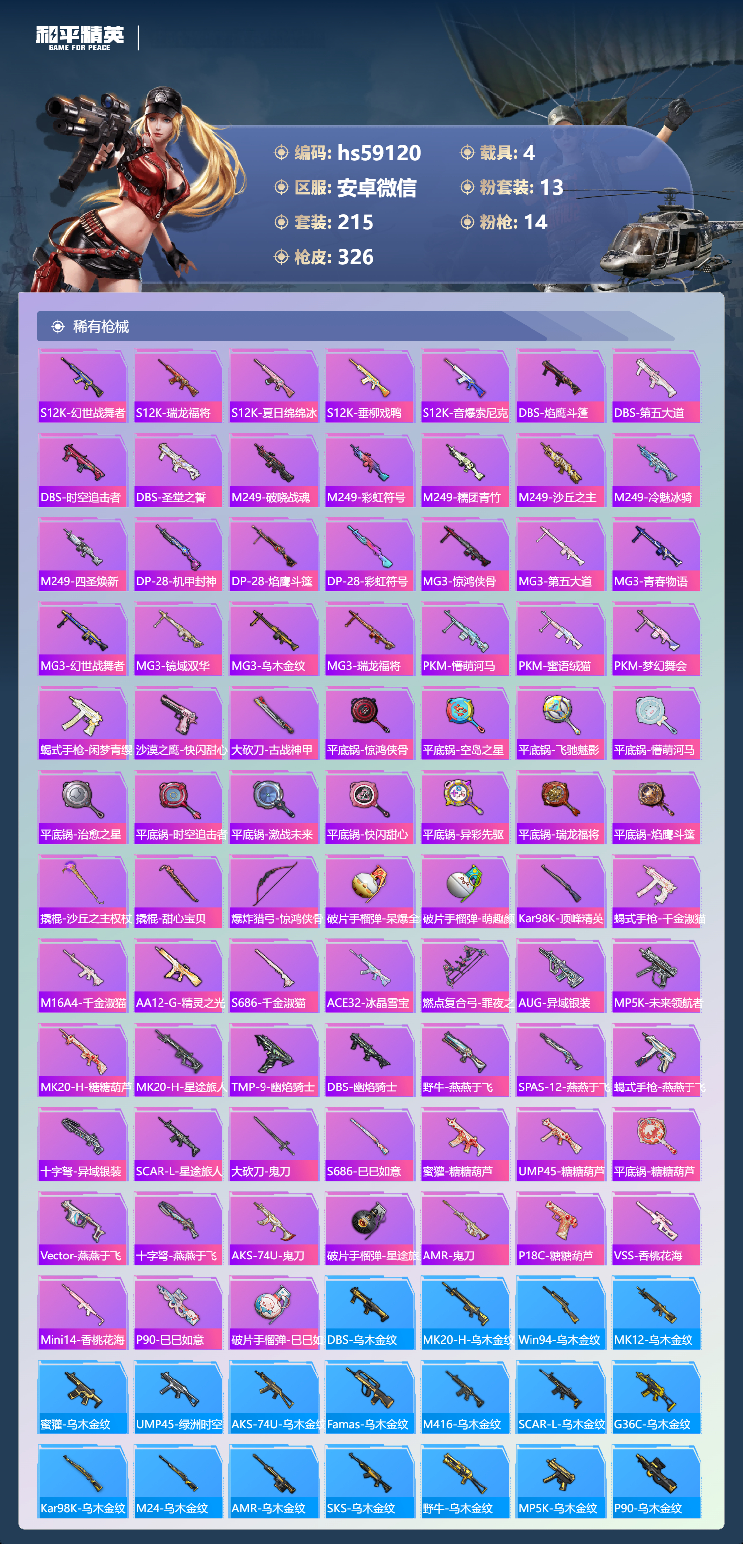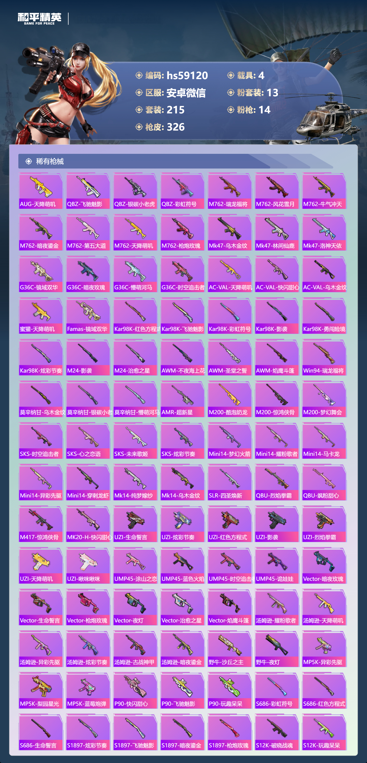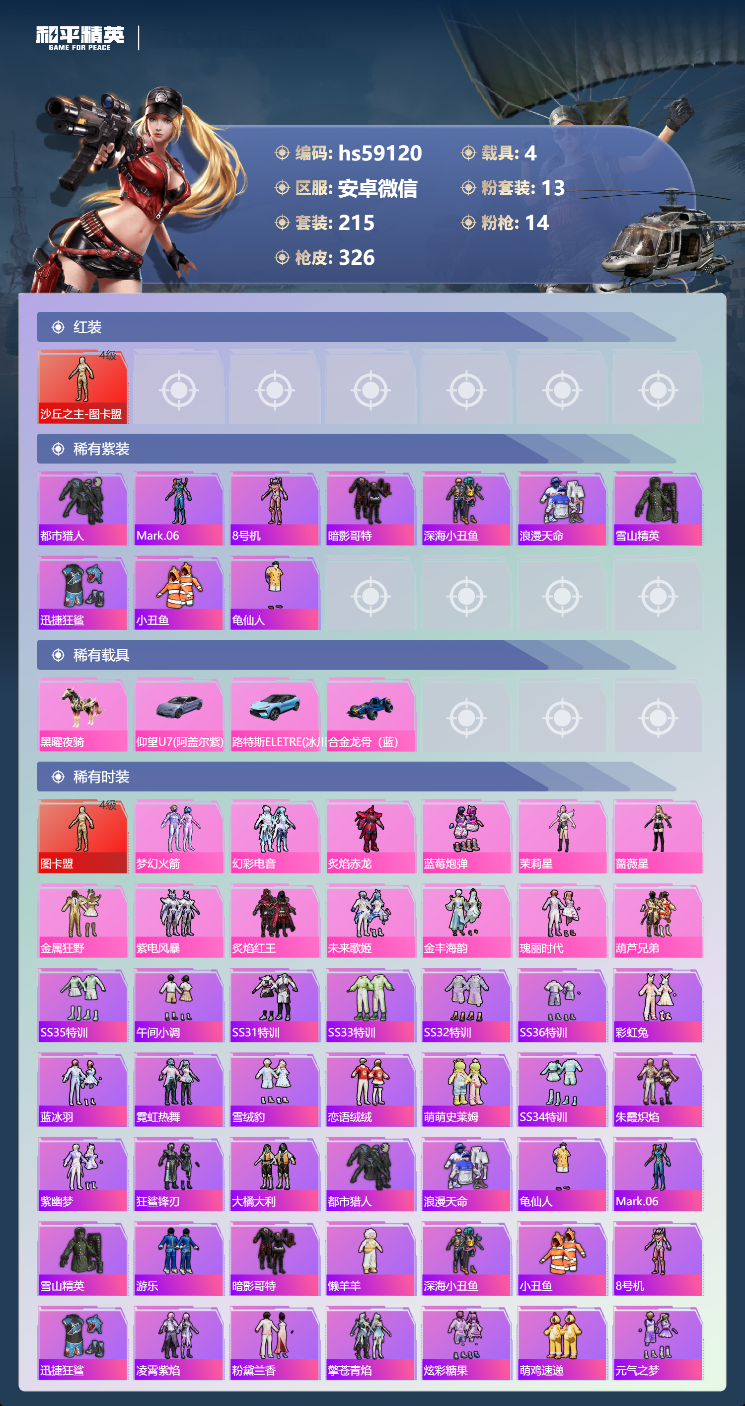 hs59120 安卓微信-21王牌印记-有战神框-1红装-13粉装-14特效枪-4载具-热力值-215套装-326枪皮-10卓越印记-7传奇印记