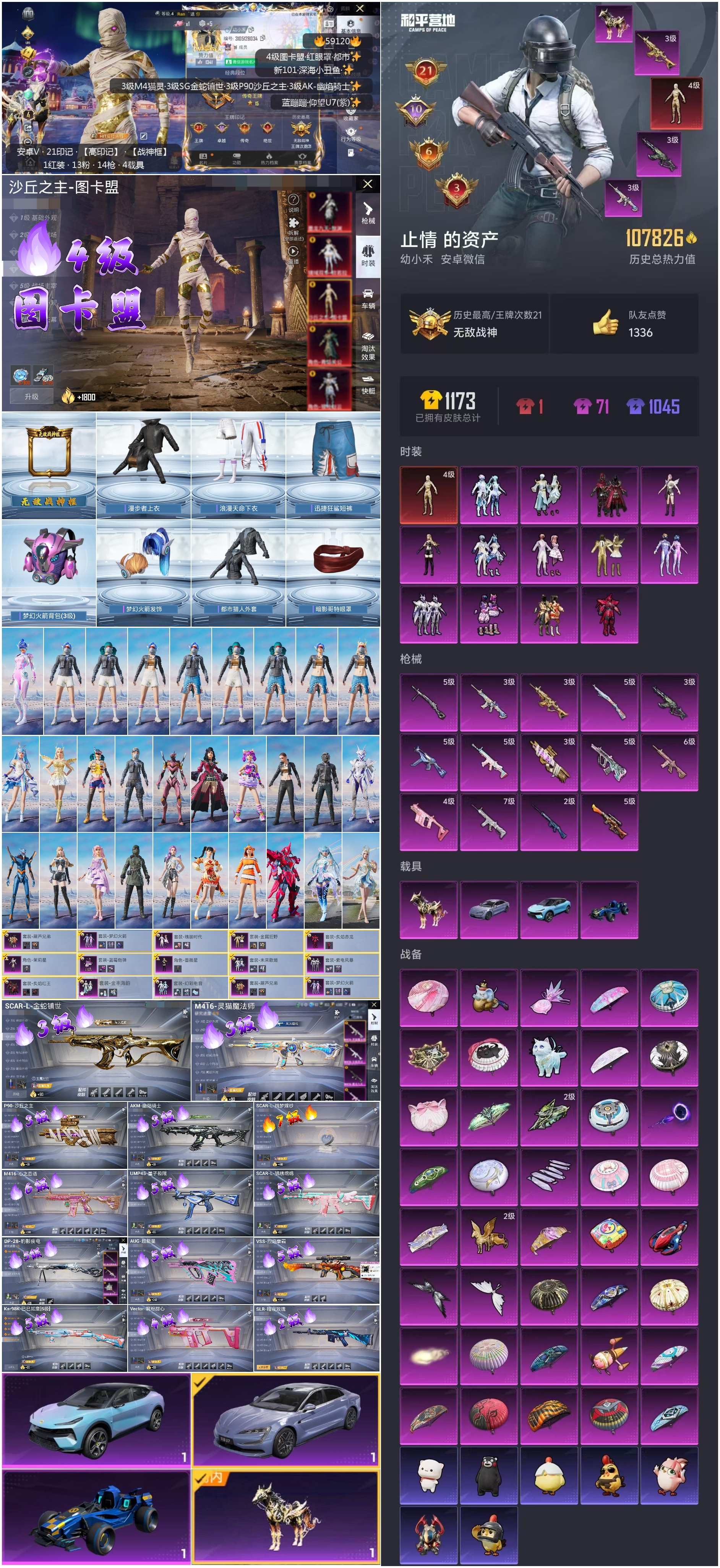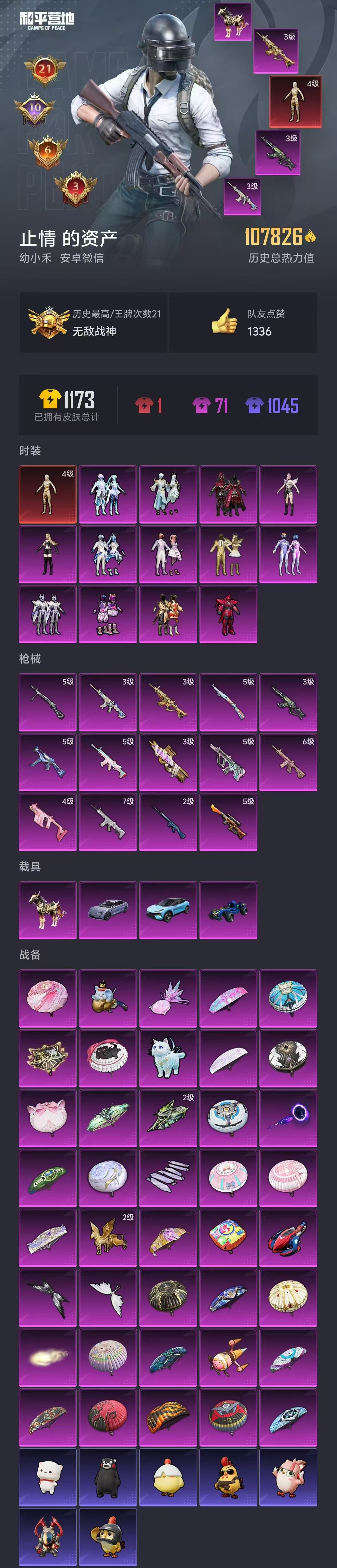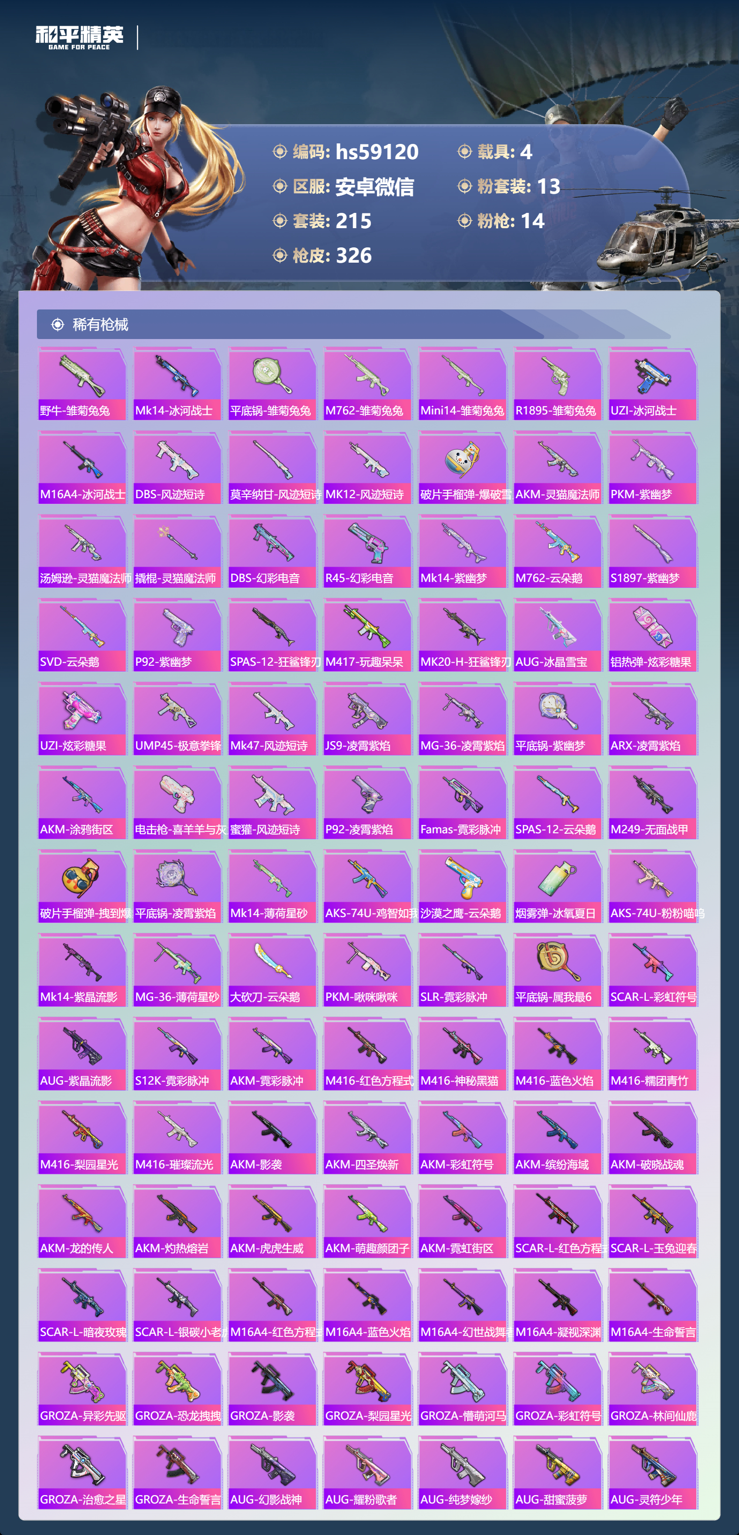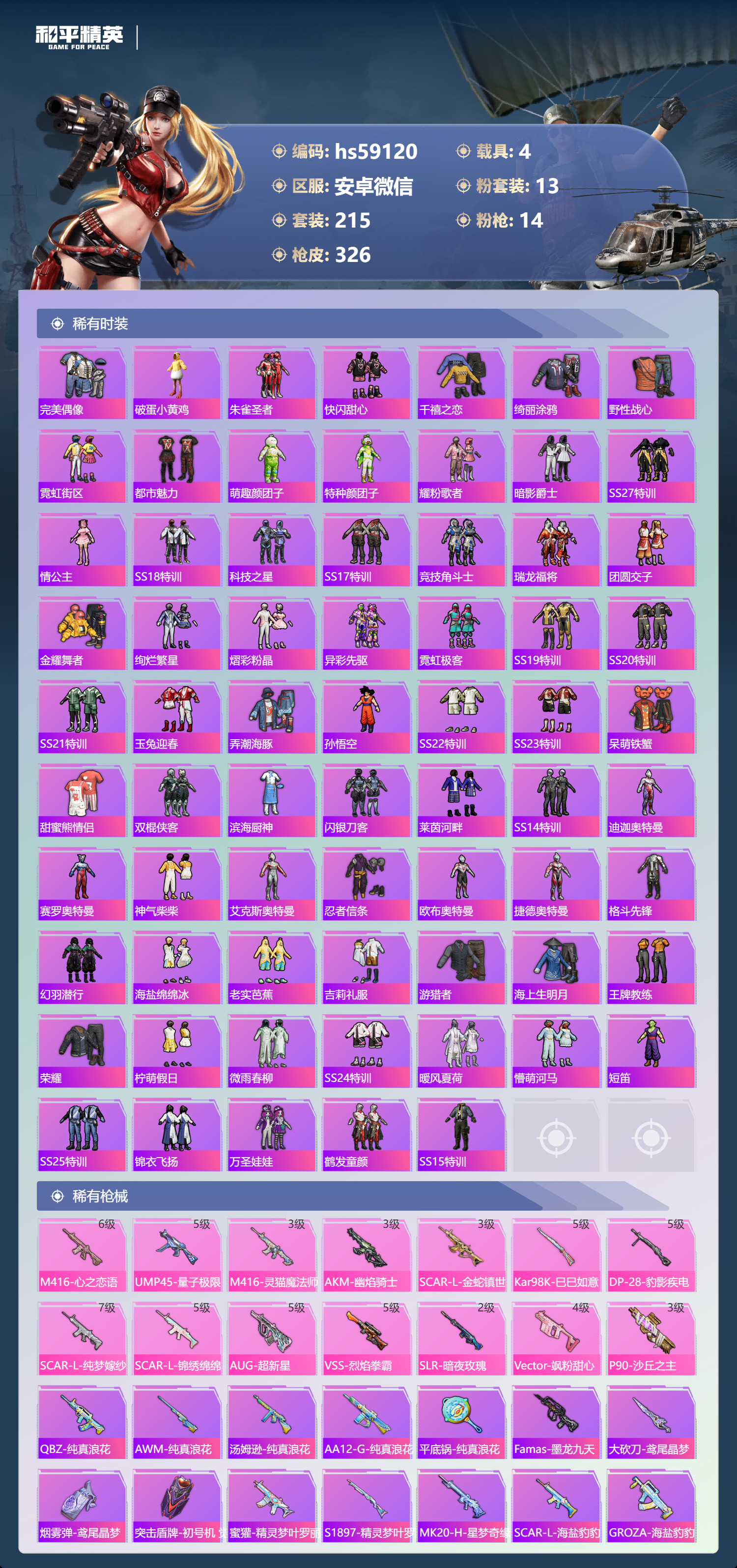 hs59120 安卓微信-21王牌印记-有战神框-1红装-13粉装-14特效枪-4载具-热力值-215套装-326枪皮-10卓越印记-7传奇印记