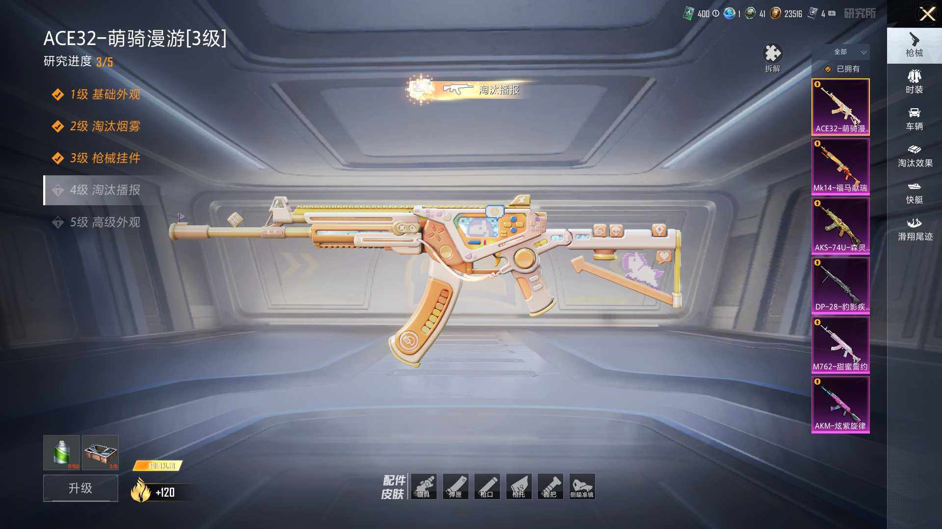 【粉色枪皮等级】:AKM-炫紫旋律(六级),M762-甜蜜誓约(七级),ACE32-萌骑漫游(三级),AKS-74U-森灵之息(三级),Mk14-福马献瑞(四级),DP-28-豹影疾电(三级)