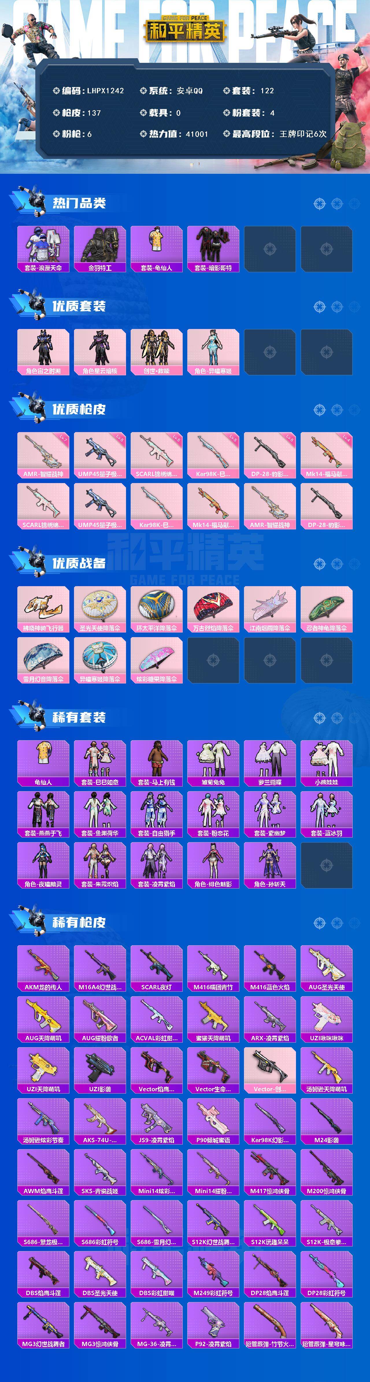 【特价出售/店主推荐】安卓 手Q-4粉装-6特效枪-0载具-1粉色飞行器-41001热力值-6王牌印记-122套装-137枪皮【热门品类】:套装-浪漫天命,套装-金羽特工,套装-龟仙人,套装-暗影哥特【粉色套装】:角色-宙之时溯,角色-星云暗核,套装-创世·救赎,角色-异瞳寒姬【粉色枪皮等级】:SCAR-L-锦绣绵绵(五级),UMP45-量子极限(五级),Kar98K-巳巳如意(五级),Mk14-福马献瑞(四级),AMR-智耀战神(七级),DP-28-豹影疾电(五级)【粉色枪皮】:SCAR-L-