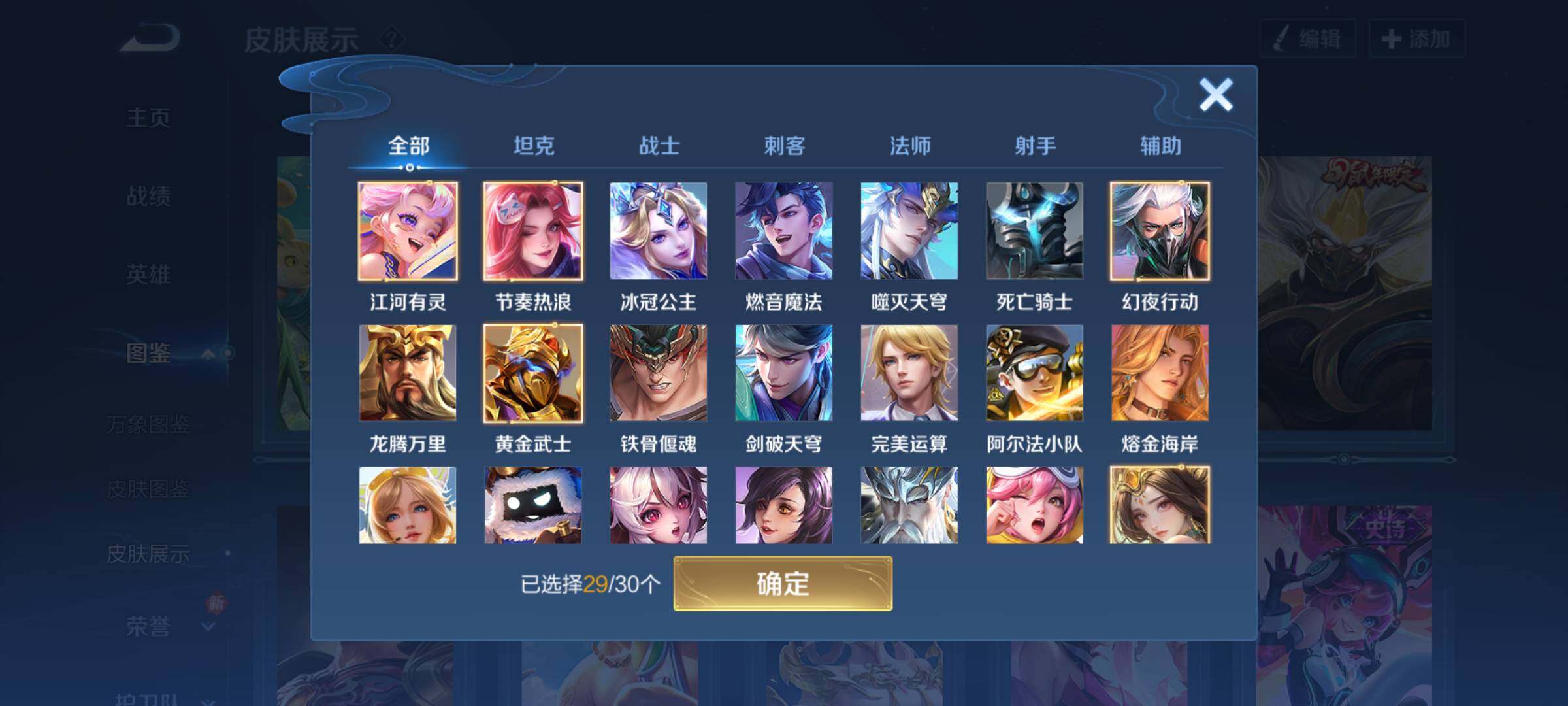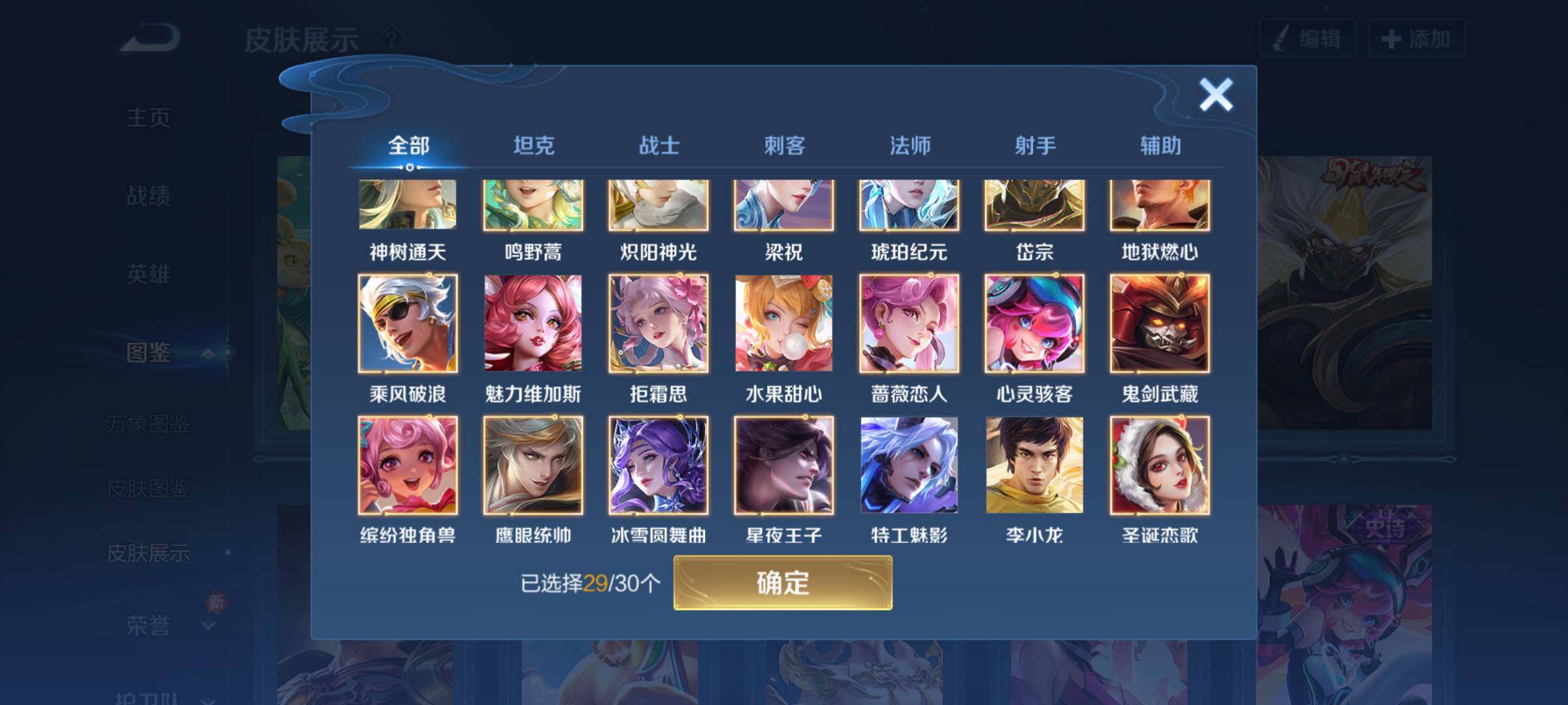 【限定皮肤】:姜子牙天穹之誓,狄仁杰阴阳师,孙尚香蔷薇恋人,典韦岱宗,项羽海滩派对,裴擒虎李小龙,上官婉儿梁祝,嫦娥拒霜思,艾琳流音漫舞,司空震地狱燃心,阿古朵江河有灵,张良古海寻踪,高渐离燃音魔法,妲己灵卜魔法,鬼谷子天穹