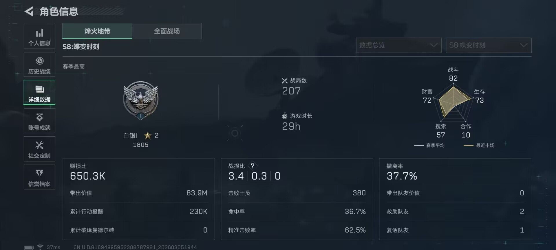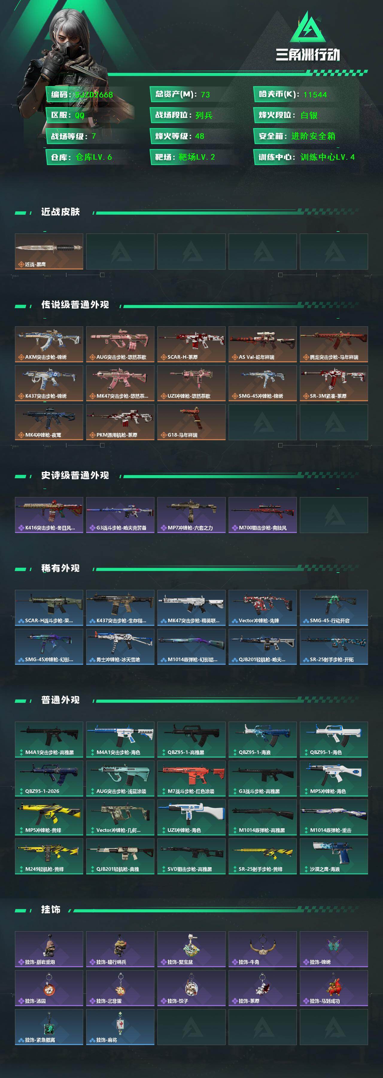 【SJZD2668】总资产(M):73M/哈夫币(K):11544K/哈夫币(K):11544K/传说枪皮数:13/全面战场等级:7_段位:列兵/烽火地带等级:48_段位:白银/近战-黑鹰/AKM突击步枪-锦绣/AUG突击步枪-悠然茶歇/SCAR-H战斗步枪-荼蘼/AS Val突击步枪-蛇年祥瑞/腾龙突击步枪-马年祥瑞/K437突击步枪-锦绣/MK47突击步枪-悠然茶歇/UZI冲锋枪-悠然茶歇/SMG-45冲锋枪-锦绣/SR-3M紧凑突击步枪-荼蘼/MK4冲锋枪-夜莺/PKM通用机枪-荼蘼/G1