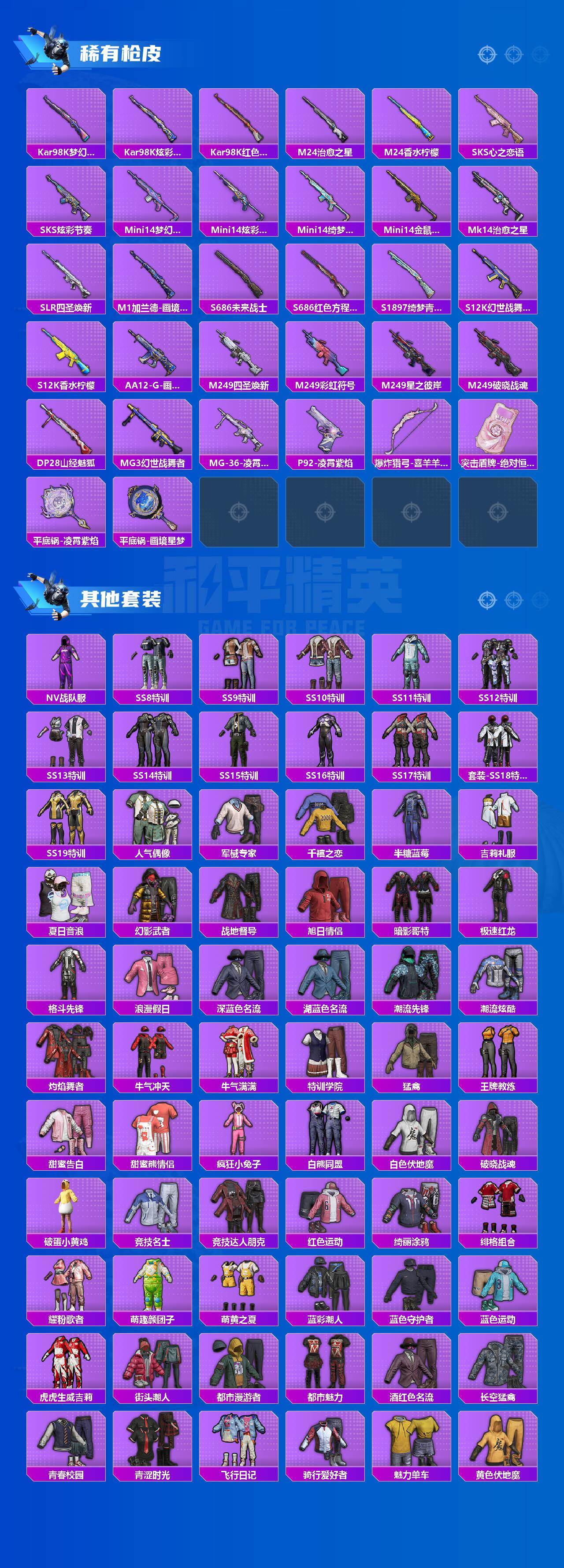 【粉色枪皮等级】:ACE32-萌骑漫游(五级),UZI-绮梦青鸾(七级),AKS-74U-森灵之息(五级),Mk14-福马献瑞(三级