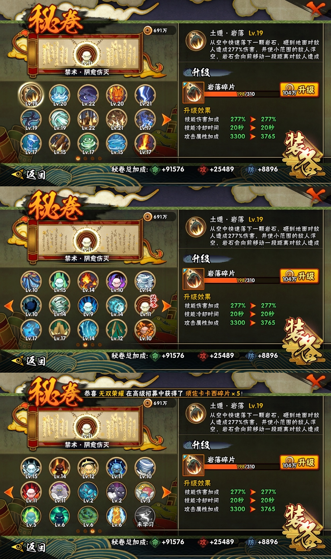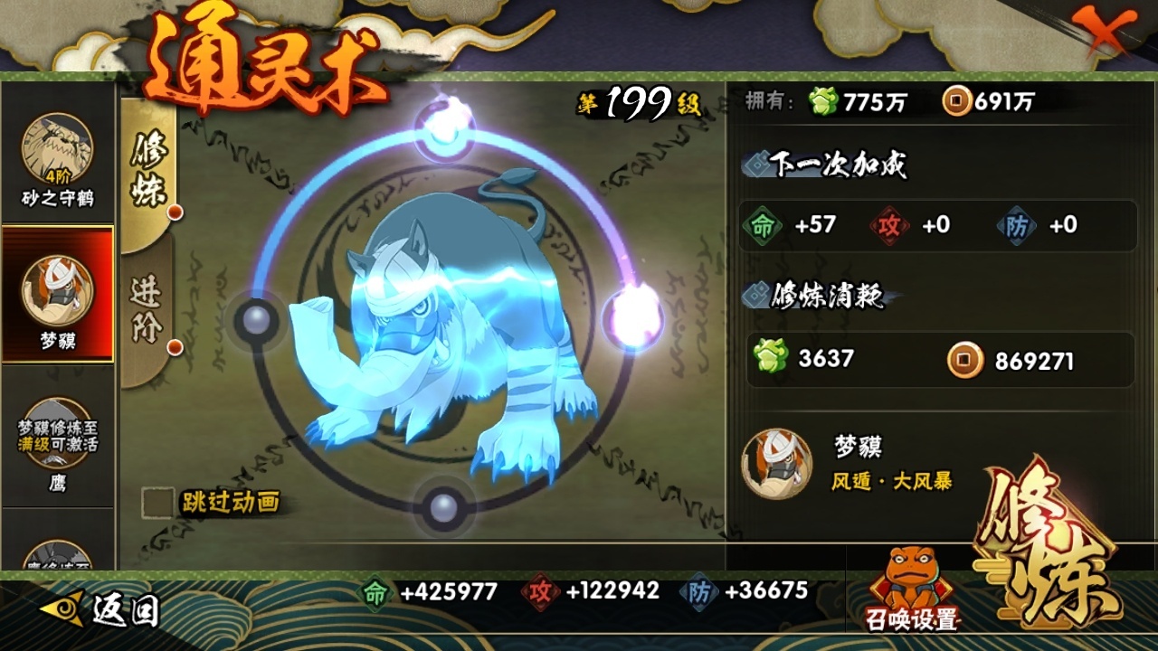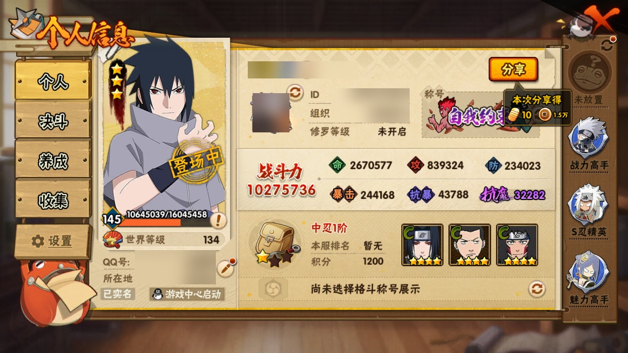 【7038931】贵族等级: V10 S忍数: 18 A忍数: 24 战力值(万): 1027 S级忍者: 药师兜「仙人模式」,千手扉间,佩恩「天道」,大蛇丸,波风水门,纲手,猿飞日斩,迈特凯「死门」,大野木 「忍界大战」,自来也 「舞之豪杰」,漩涡鸣人 「九喇嘛连结」,大筒木金式「博人传」,春野樱 「忍界大战」,神秘面具男 「红夜之刃」,宇智波佐助「永恒万花筒」,千手柱间·木叶创立,宇智波斑「秽土转生·解」,旗木卡卡西「须佐能乎」 通灵兽: 忍犬,忍龟,蛤蟆吉,蓝蛇,猿魔,蛞蝓,蛤蟆仙人,镰鼬