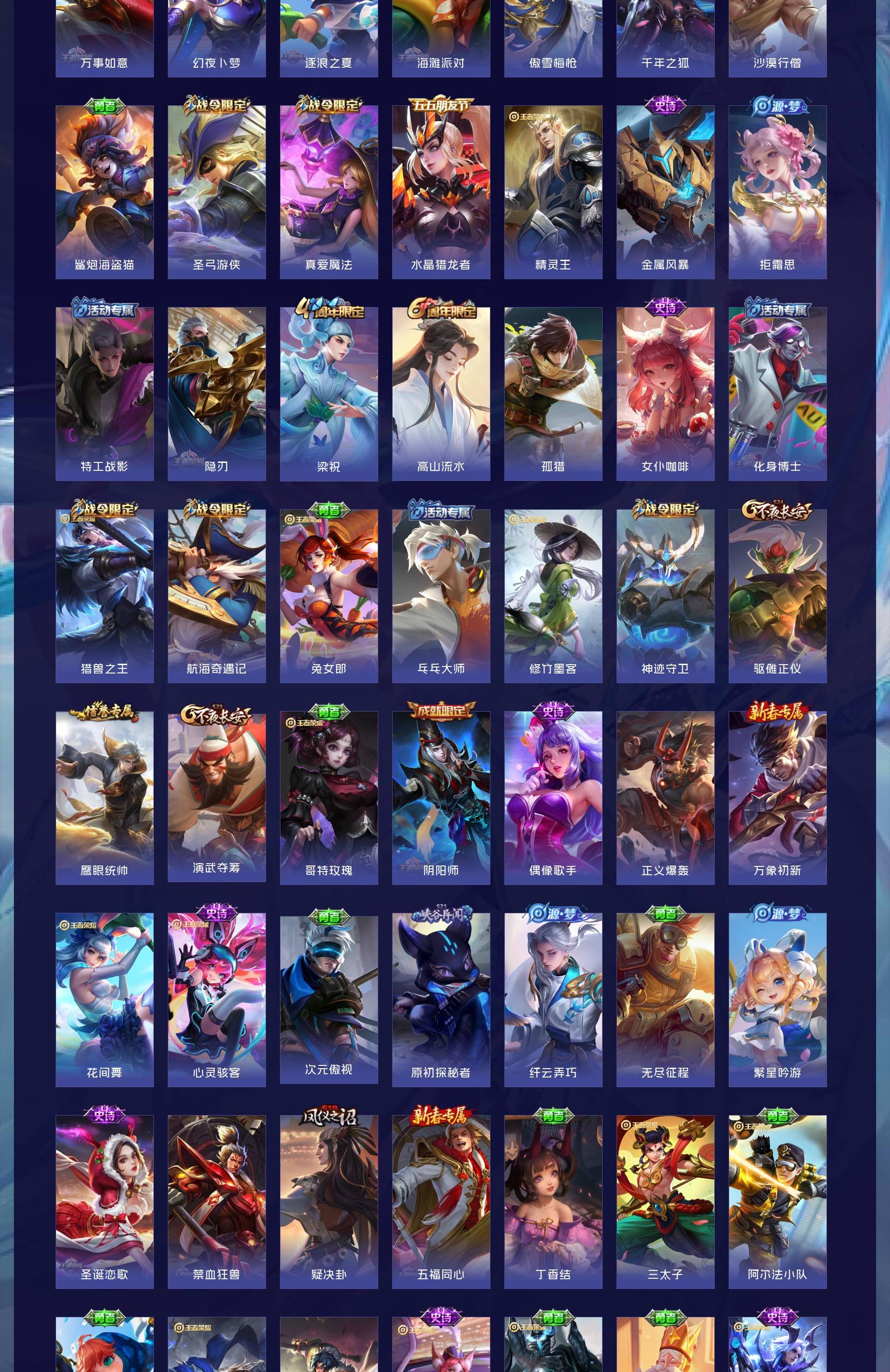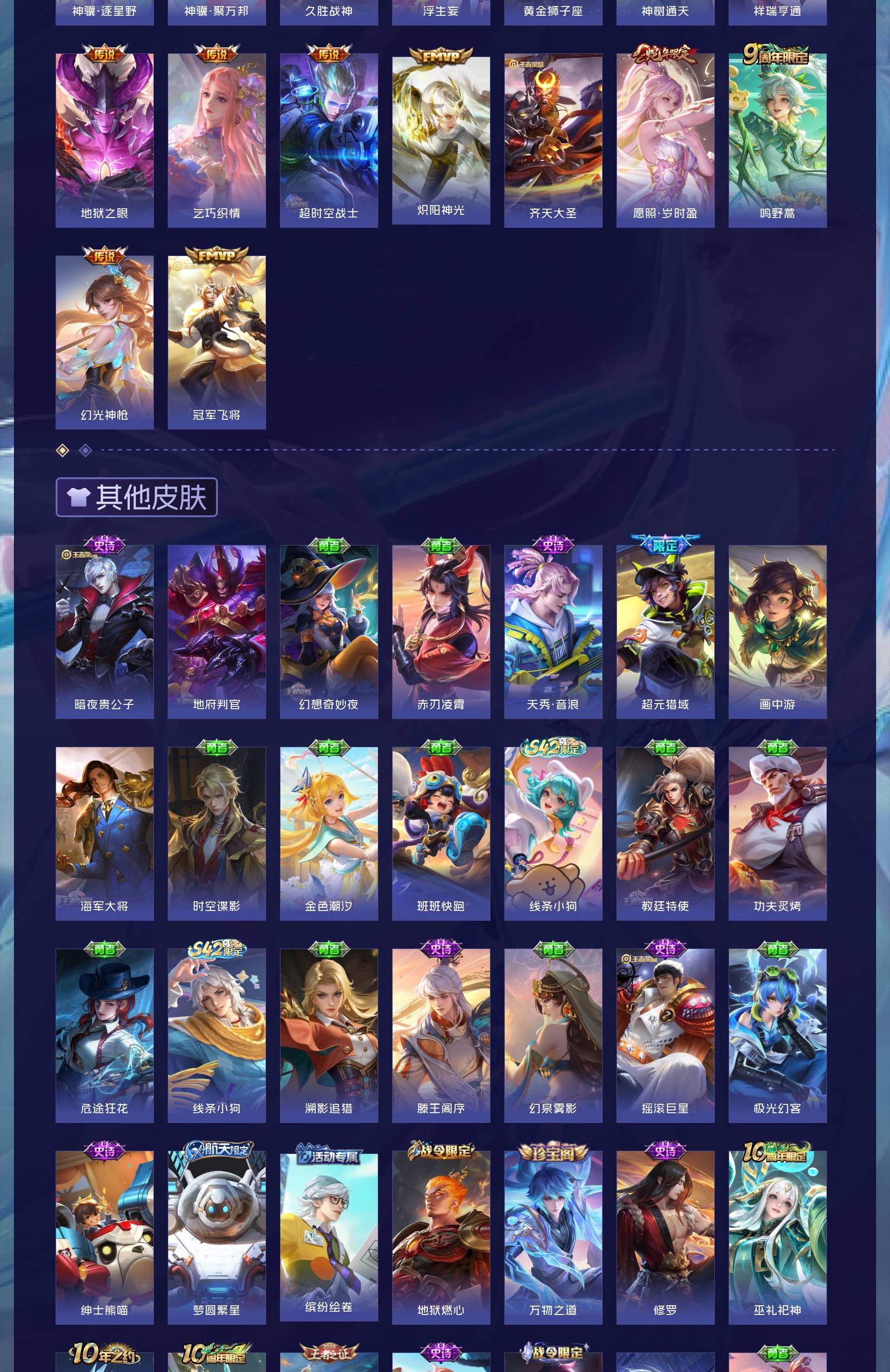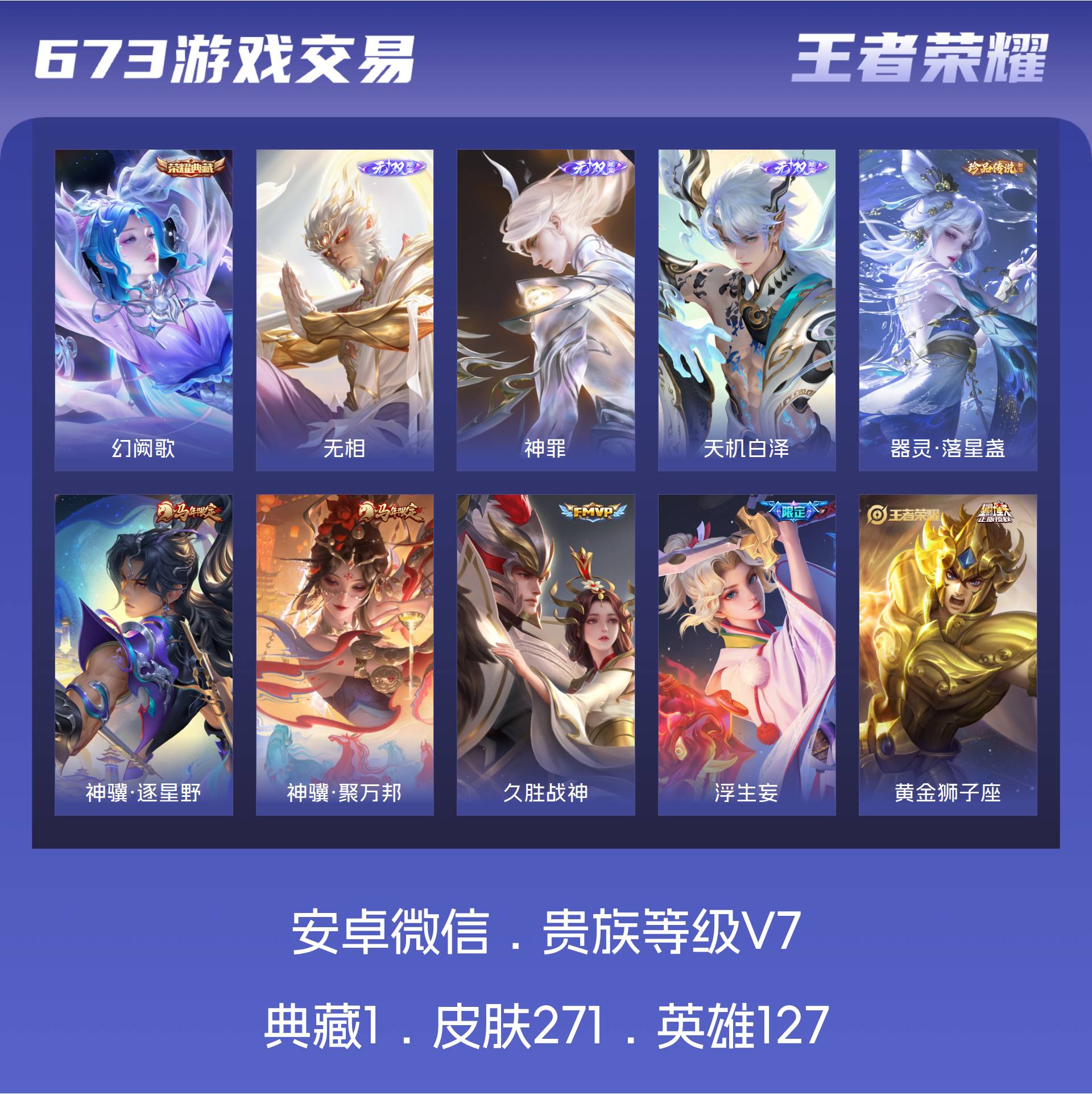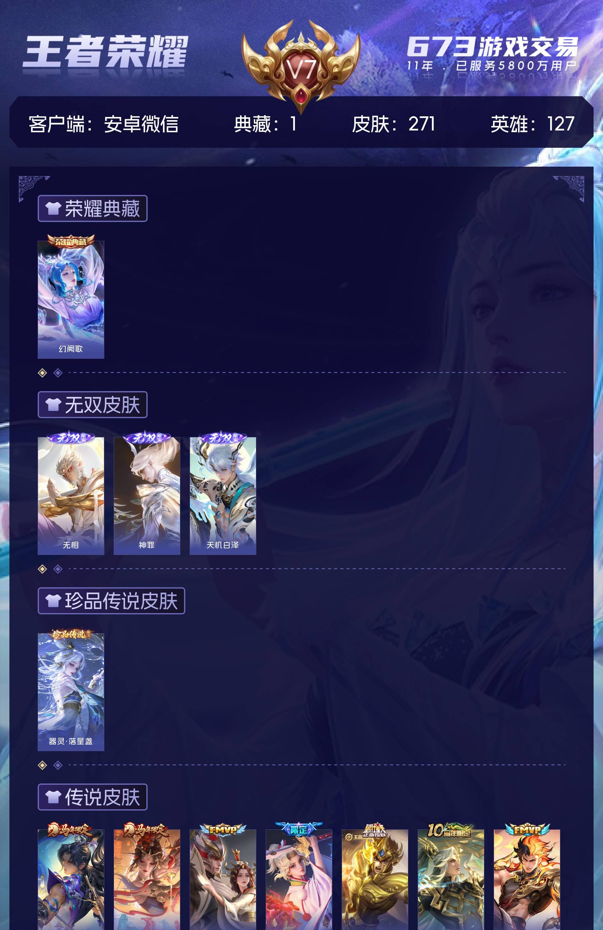 V7 皮肤271 英雄127 至圣王者 荣耀典藏1 无双皮肤3 珍品传说1 星传说1 传说16 其他皮肤256