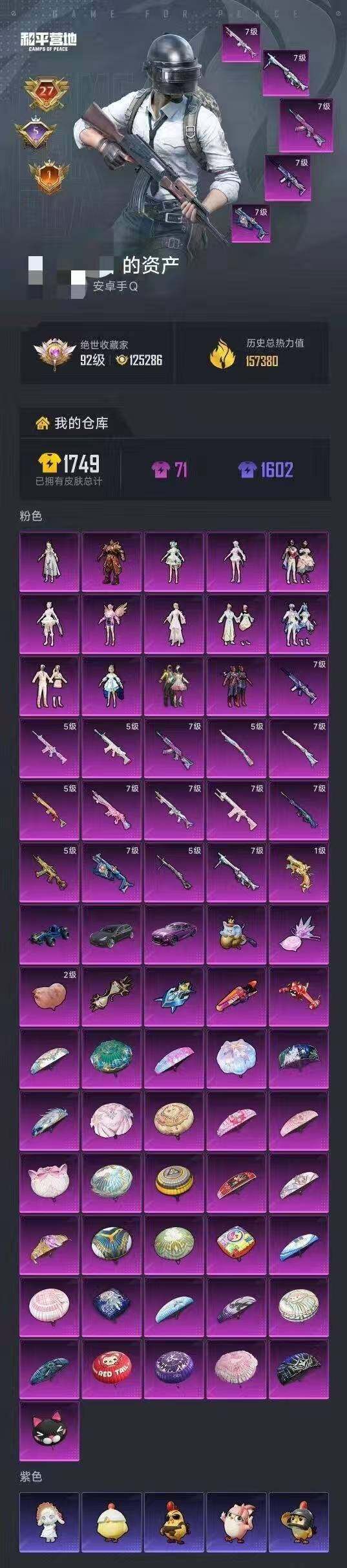 【KP249】安卓 手Q-14粉装-16特效枪-3载具-7粉色飞行器-157380热力值-27王牌印记-343套装-433枪皮