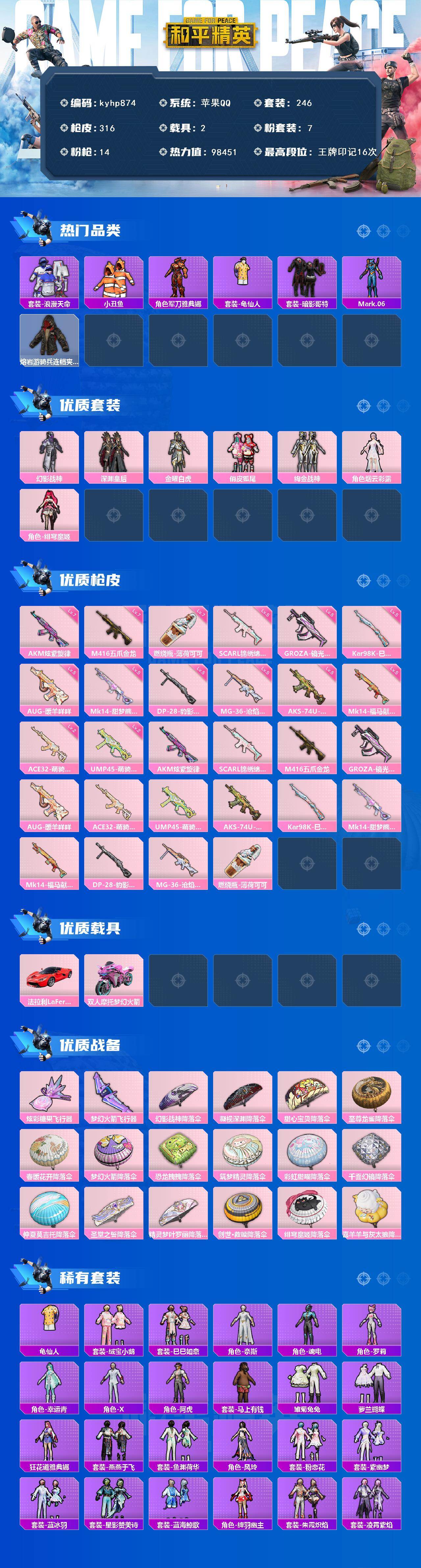 苹果 手Q-7粉装-14特效枪-2载具-2粉色飞行器-98451热力值-16王牌印记-246套装-316枪皮