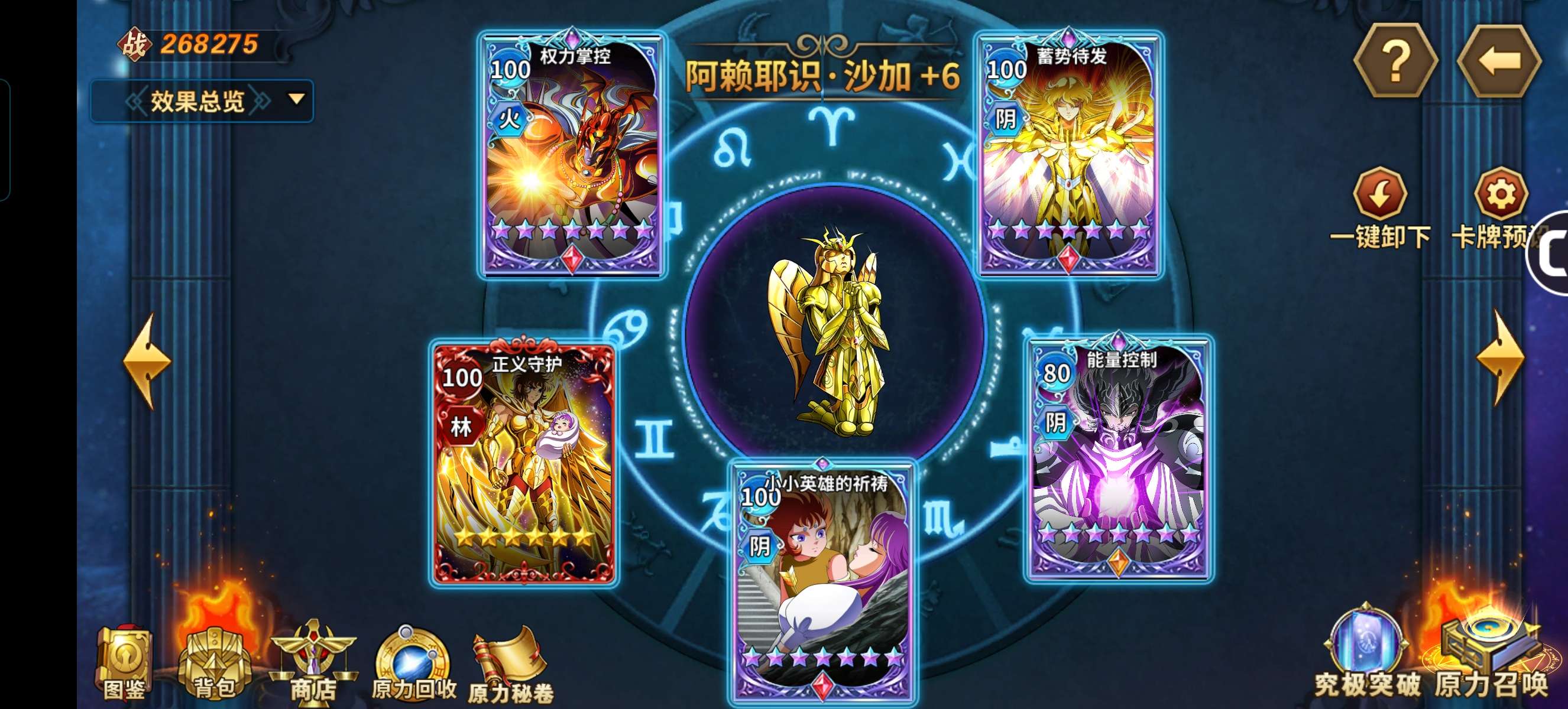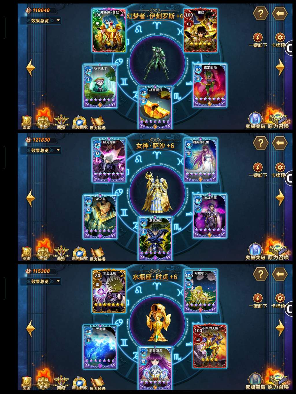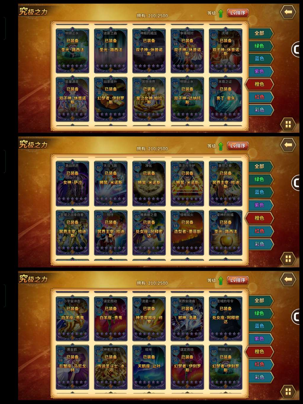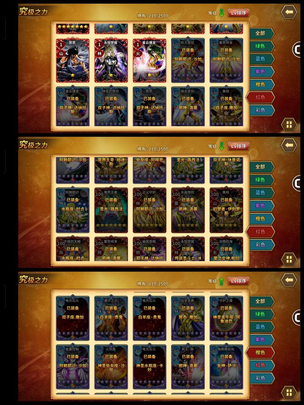 六觉死神,邪神,赖沙。基础多数都接近满,原力很强。三突红卡橙卡一堆,彩卡也有。守护神星神辉神瞬全满
