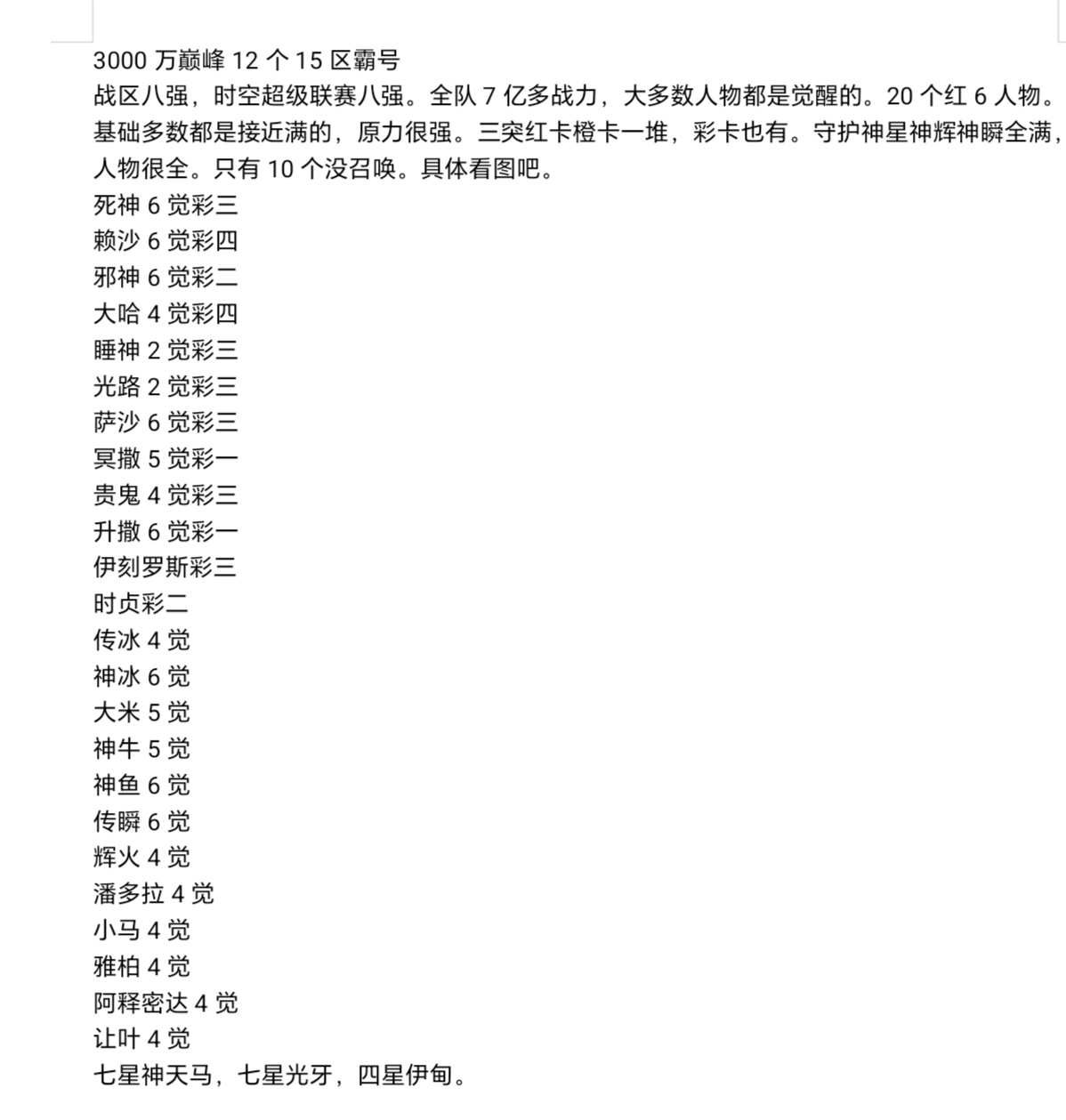 区霸3000万巅峰12个15战区八强,时空超级联赛八强。全队7亿多战力,多数人物觉醒,20个红6人物