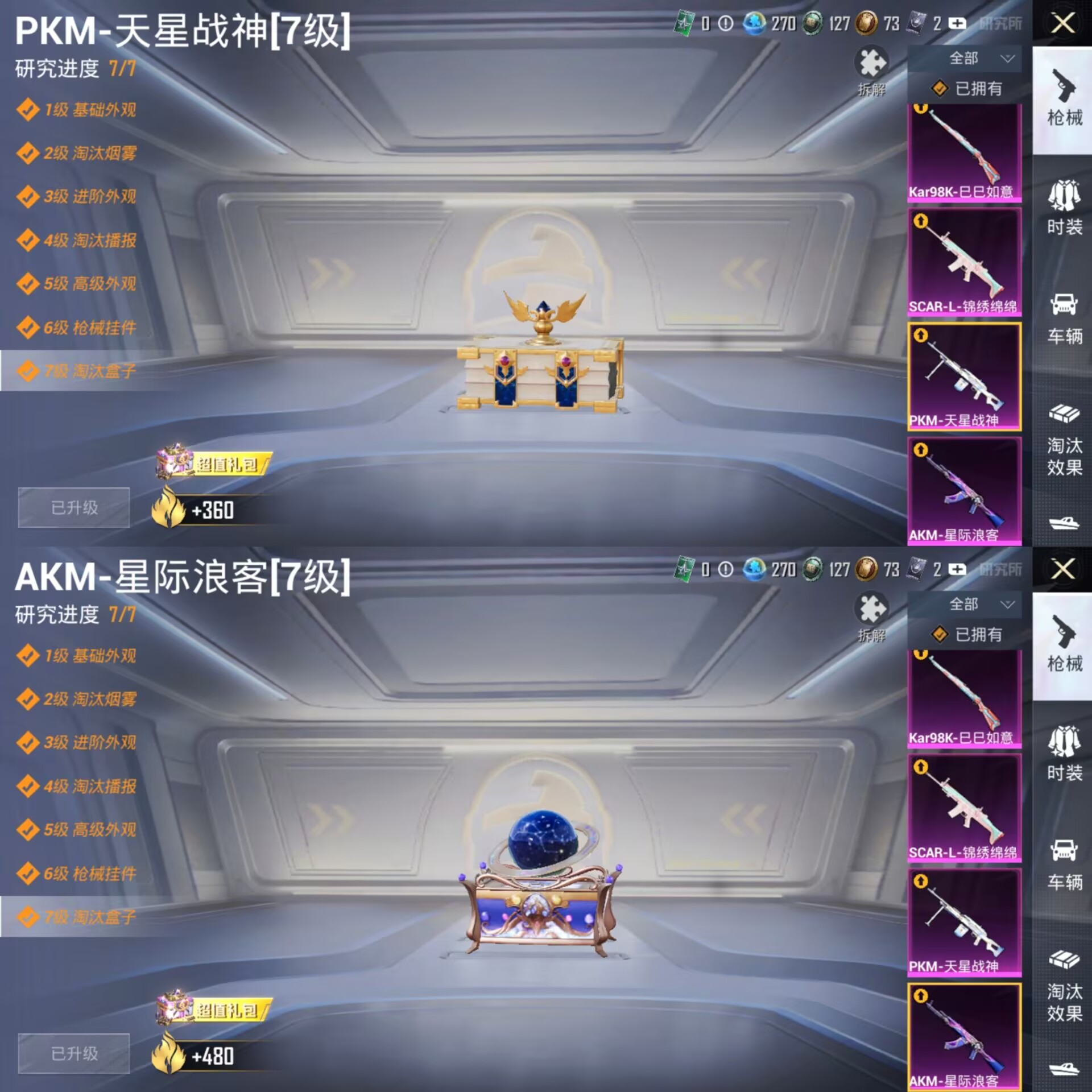 1稀有3载具5粉装8特效枪6热门164套装240枪皮 74238热力值 13印记 历史传奇王牌14星