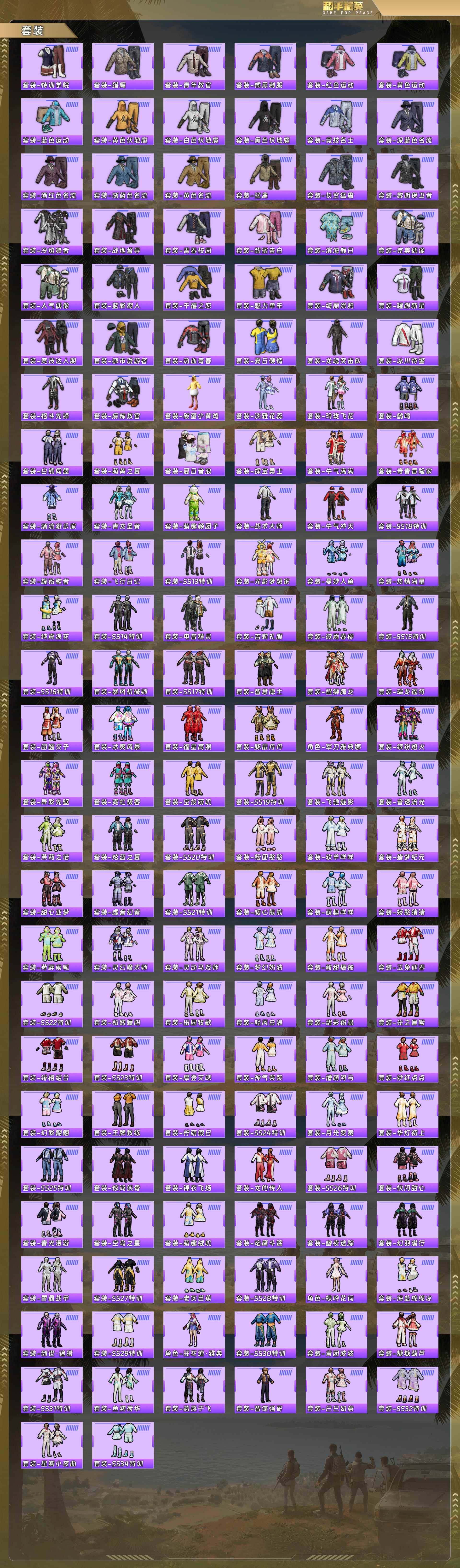 【粉色套装】:粉装-炙焰红王,粉装-蓝莓炮弹,粉装-青空秋雨,粉装-音爆索尼克,粉装-蜜语绒猫,角色-萨利娅