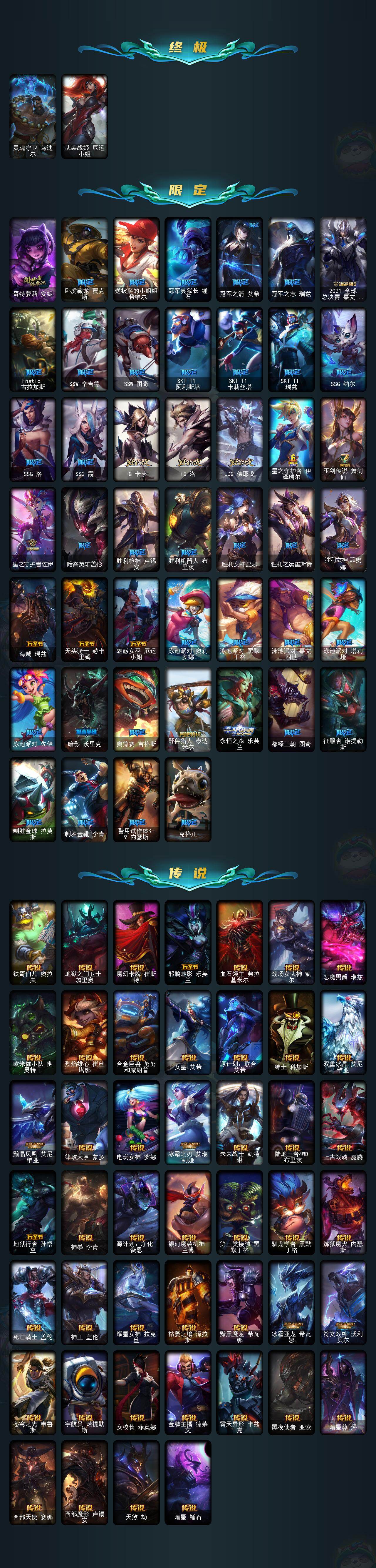 【神话皮肤】:十周年纪念安妮,源代码乐芙兰,神凰行者瑞羽圣凰艾尼维亚,黎明使者卡尔玛,永恒之森奥恩,海克斯科技卡萨丁,海克斯科技克格莫,海克斯科技雷克顿,海克斯科技斯维因,恐惧新星德莱厄斯,摄魂使者薇恩,至臻真实伤害赛娜,至臻真实伤害亚索,至臻暗星墨菲特,至臻黑夜使者凯隐,至臻黑夜使者李青,至臻黑夜使者李青2022,至臻KDA阿卡丽,至臻KDA阿卡丽2022,至臻KDAALLOUT卡莎,至臻灵魂莲