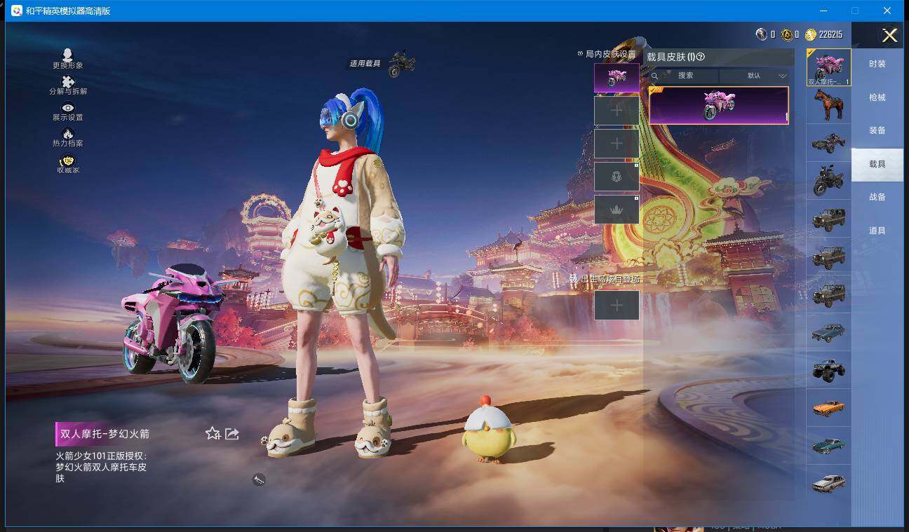 实名: 可修改 时装数: 65 载具数: 1 枪械数: 70 战备数: 78 热门装扮: 梦幻火箭(新101),梦魇先生,雪月幻音 载具: 双人摩托-梦幻火箭 稀有枪皮:五级Kar98K-巳巳如意,五级DP-28-豹影疾电