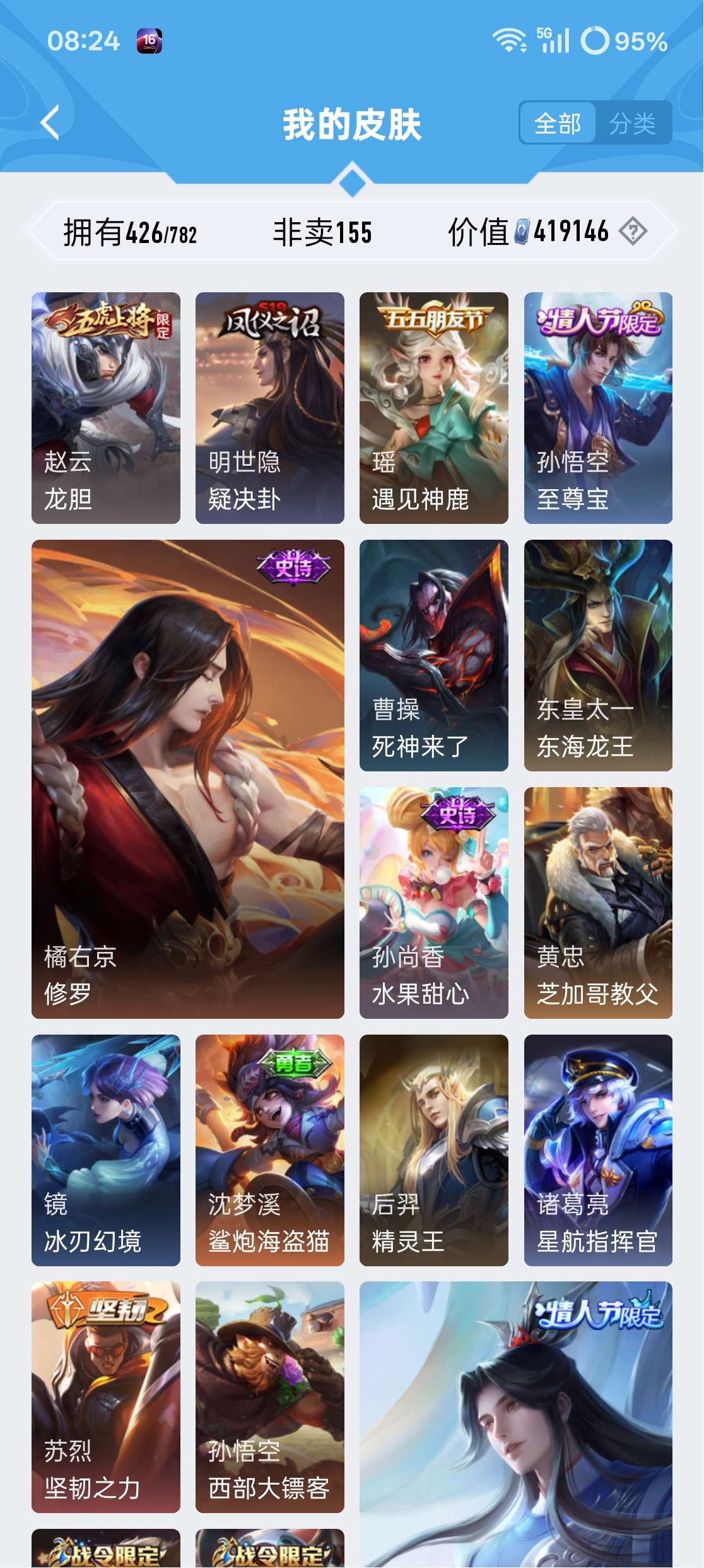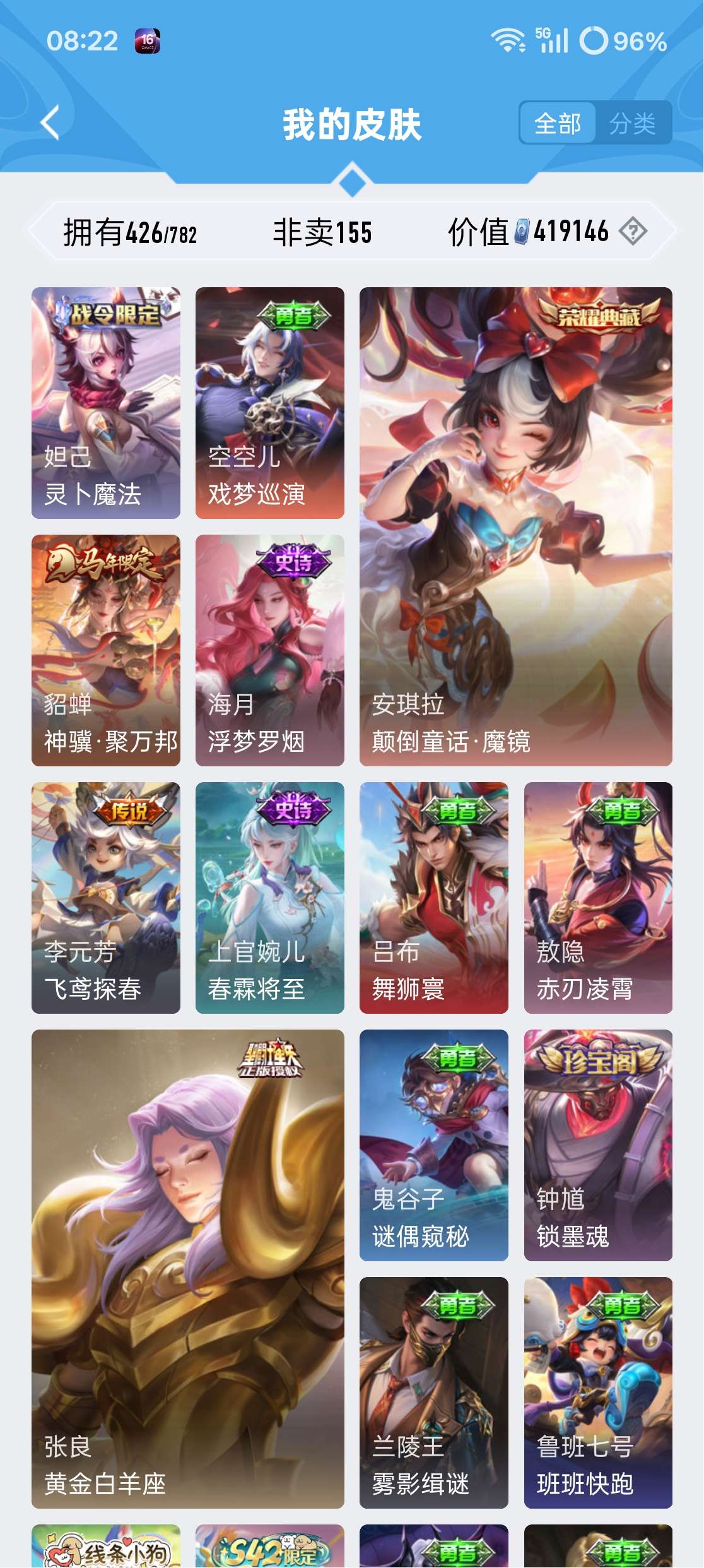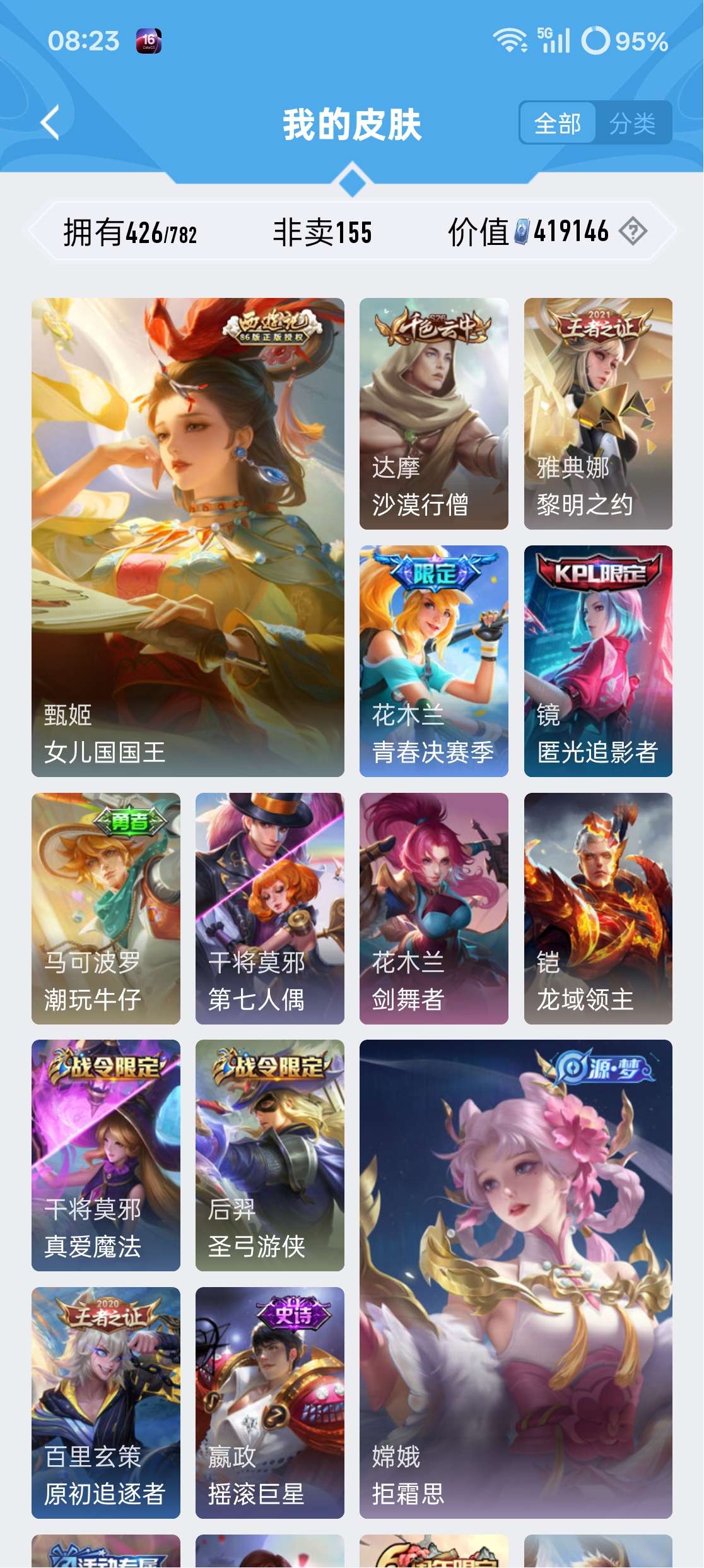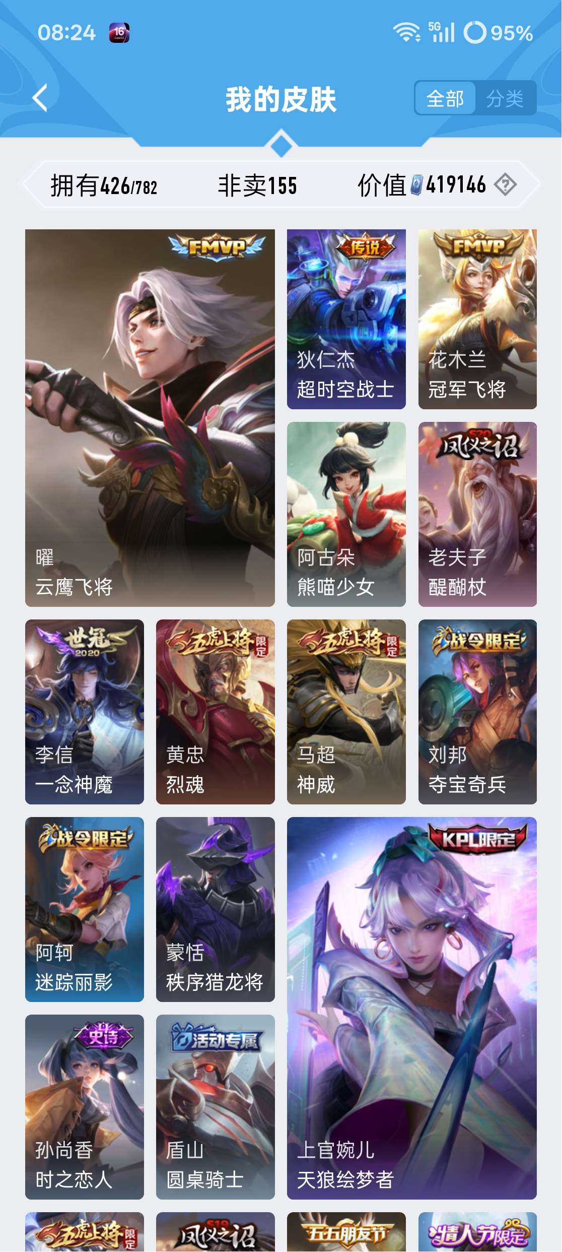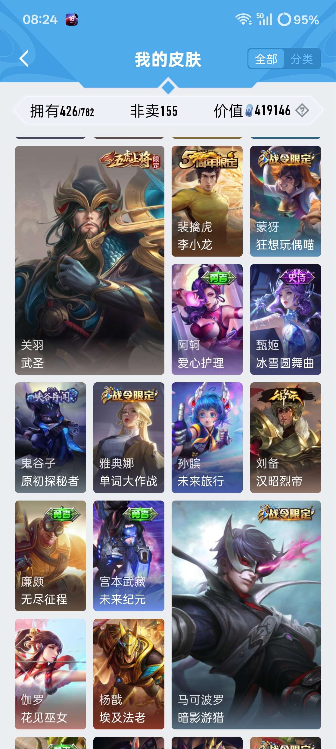100%包赔,安琪拉典藏V10 7荣耀典藏水晶5星元32传说142史诗426皮肤3