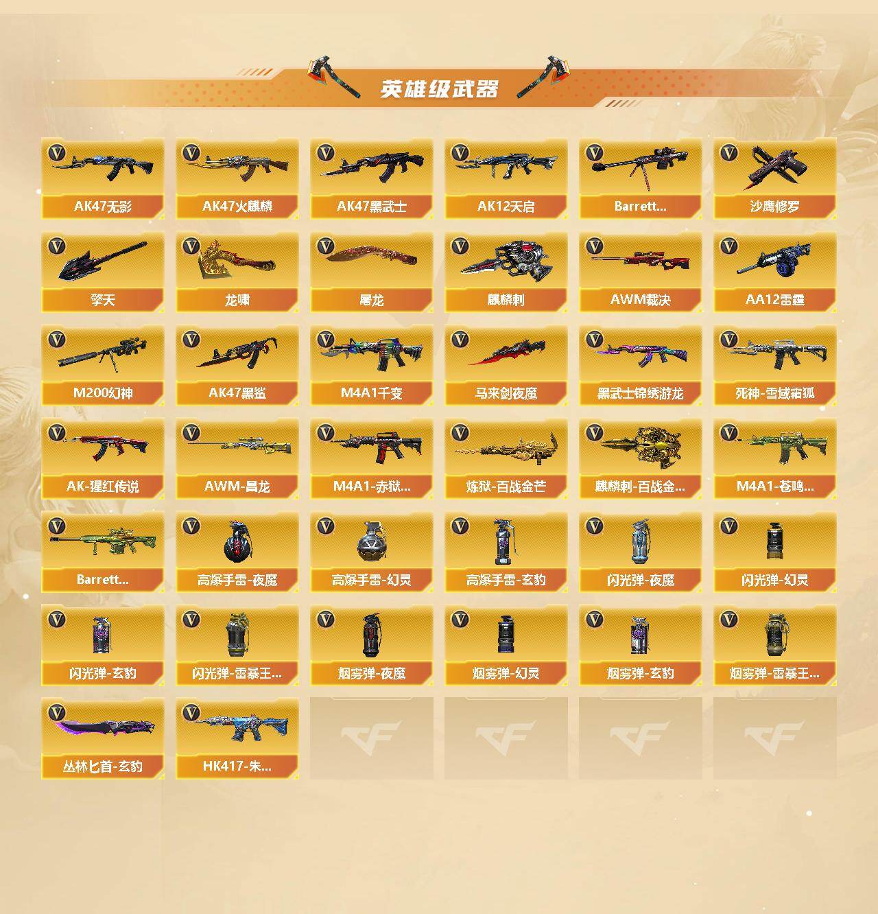 【热门武器】:传说光耀,QBZ03-金色蔷薇,M200-幻神,死亡之眼,M4A1-黑骑士*2,汤姆逊-烈龙*6,沙鹰-修罗*5