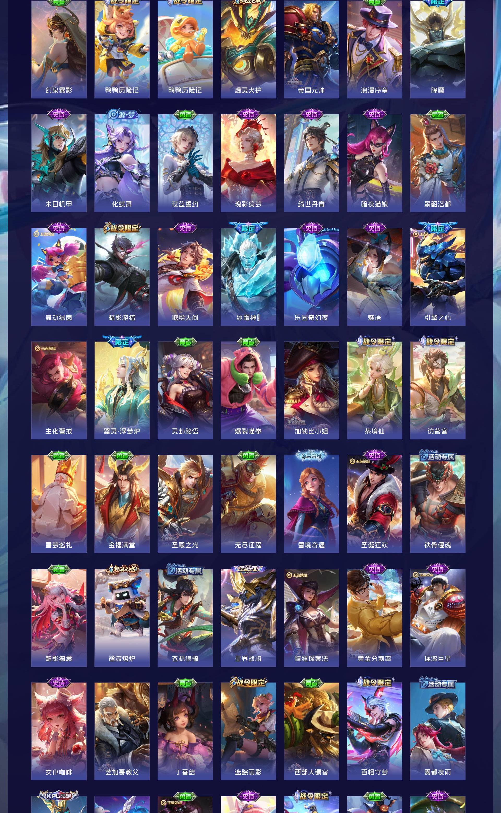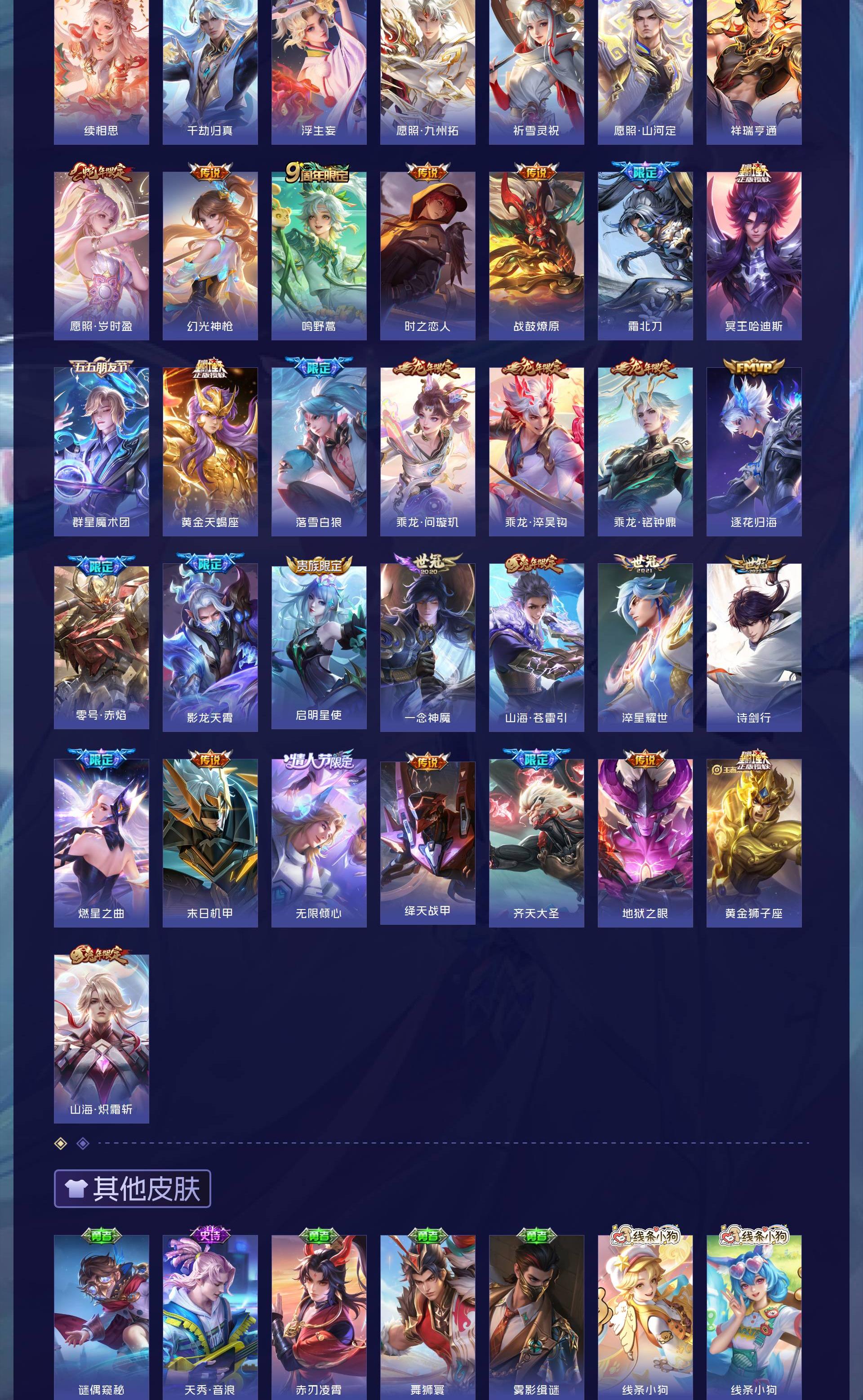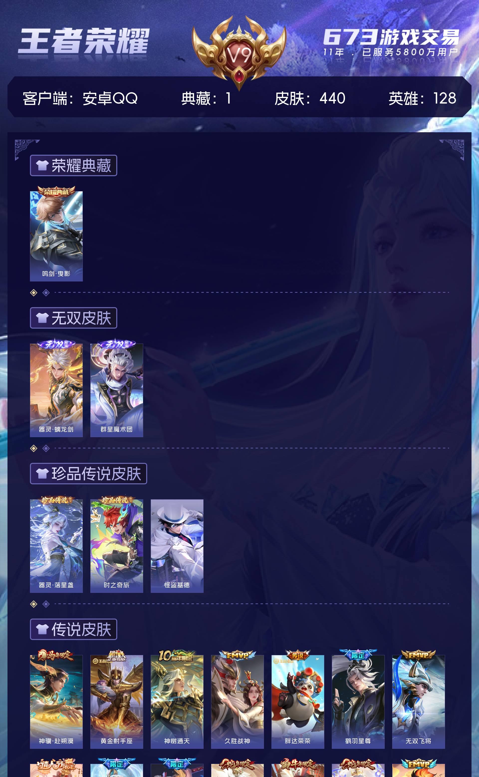 V9 皮肤440 英雄128 荣耀王者 荣耀典藏1 无双皮肤2 珍品传说3 星传说1 传说43 其他