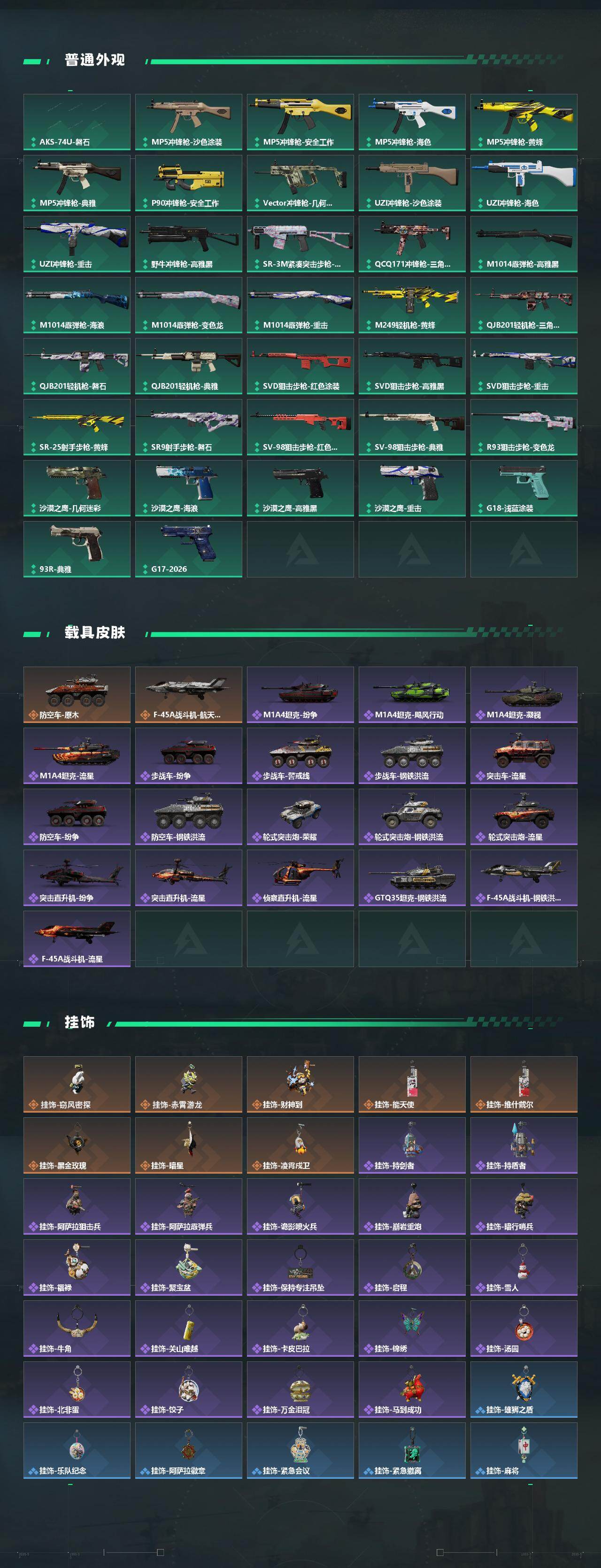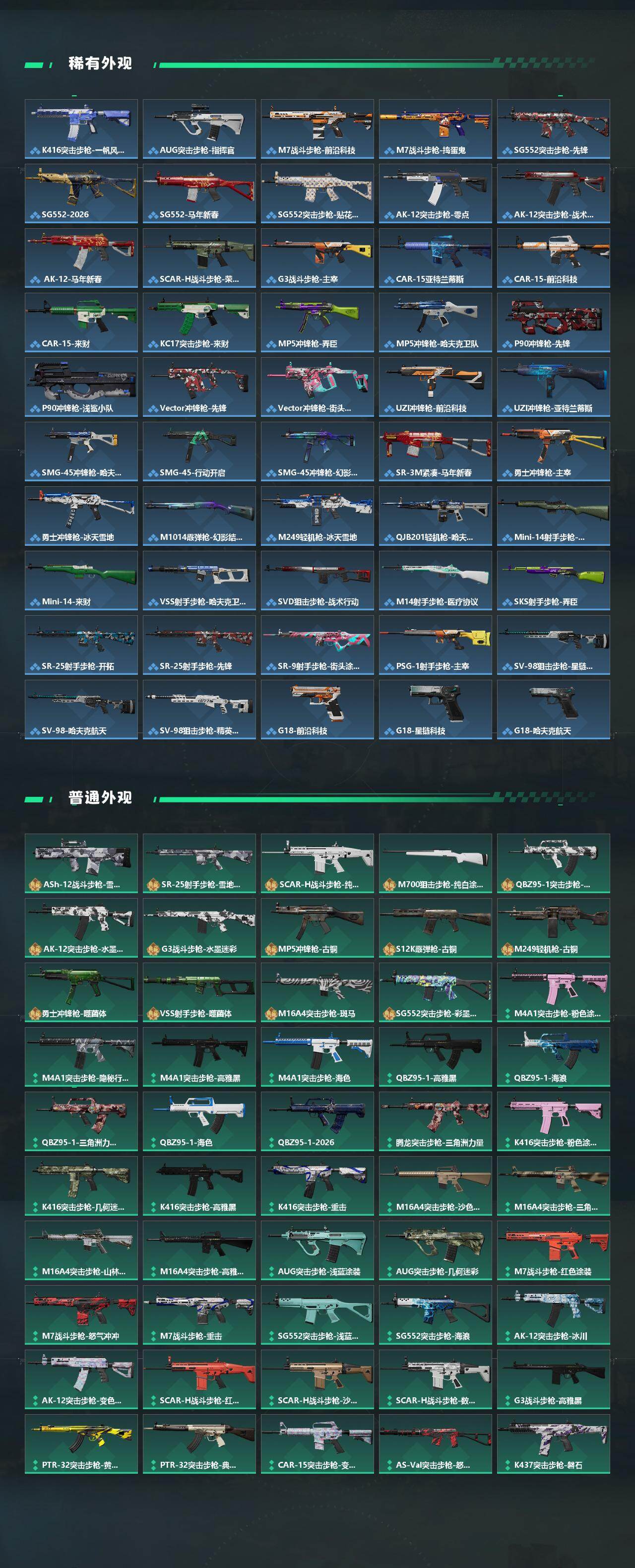 【传说外观】:M4A1突击步枪-蚀金玫瑰,AKM突击步枪-锦绣,QBZ95-1突击步枪-破军,K416突击步枪-白鹰军团,K416突击步枪-行动记录,SG552突击步枪-运动员,SCAR-H战斗步枪-启航,腾龙突击步枪-马年祥瑞,腾龙突击步枪-万金泪冠,K43