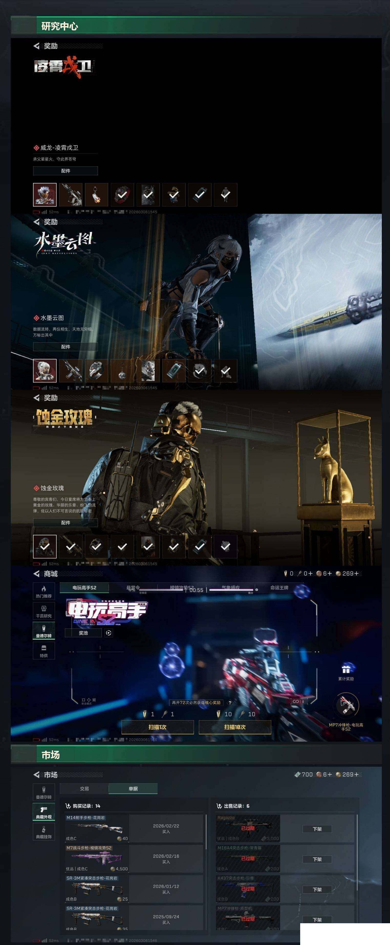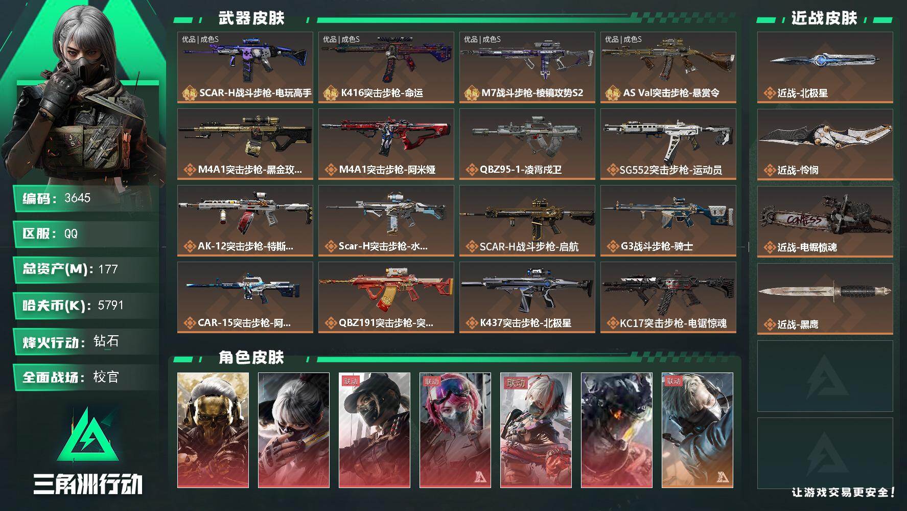 【sjs8935】总资产285m 红狼 露娜 信条 北极星 黑海 影锋 彦祖 烽火地带段位: 黑鹰 全面战场段位: 列兵 总资产: 285000000 哈夫币: 3093000 sjs8935 干员外观: 红狼-蚀金玫瑰,牧羊人-街头之王(S2),威龙-壮志凌云(S3),无名-夜鹰(S4),威龙-飞虎,蜂医-送葬人·无题密令(S5),露娜-黑·天际线,深蓝-不破誓约(S6),红狼-电锯惊魂,露娜-金牌射手(S7) 传说武器皮肤: M4A1突击步枪-蚀金玫瑰,M7战斗步枪-维京,SCAR-H战