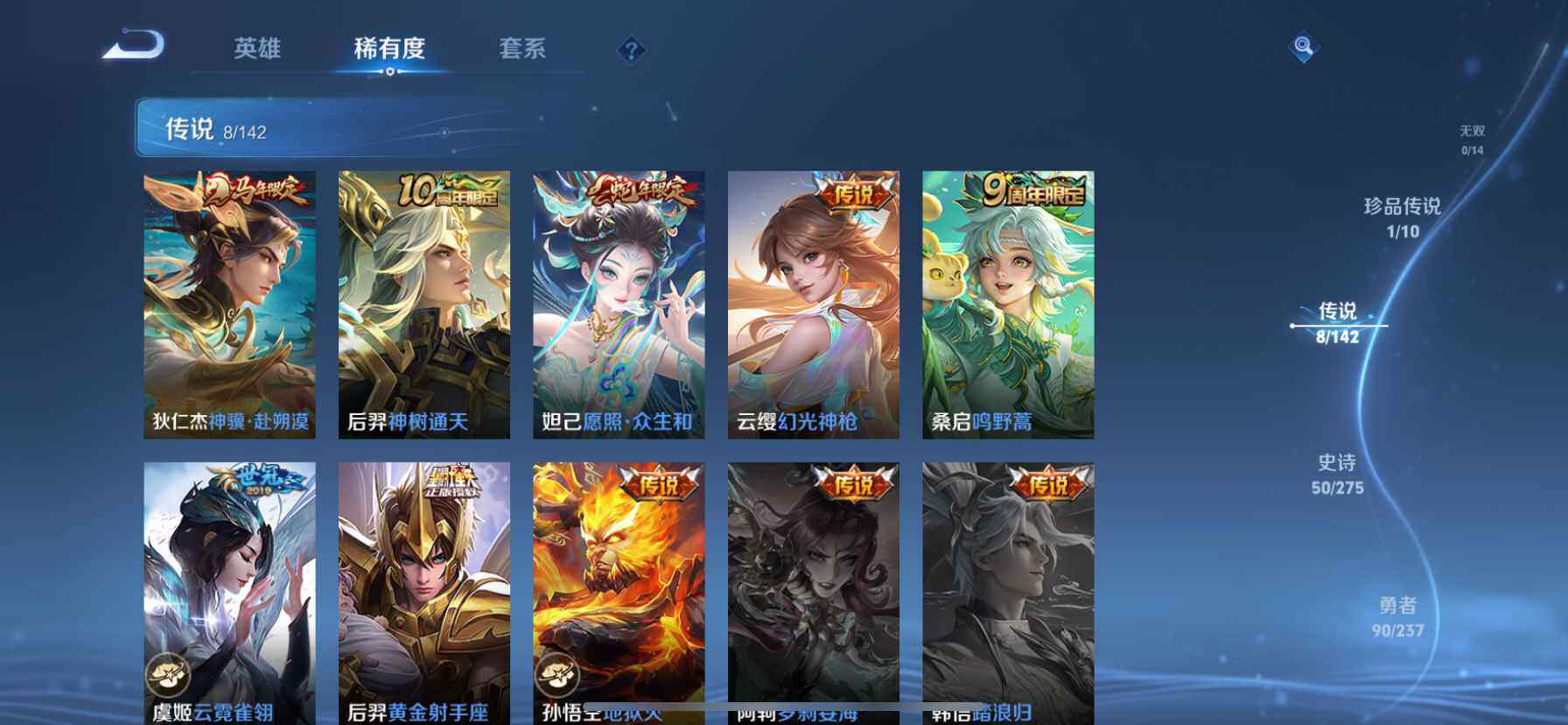 【传说皮肤】:狄仁杰神骥赴朔漠,后羿神树通天,妲己愿照众生和,云缨幻光神枪,桑启鸣野蒿,虞姬云霓雀翎,后羿黄金射手座,孙悟空地狱火