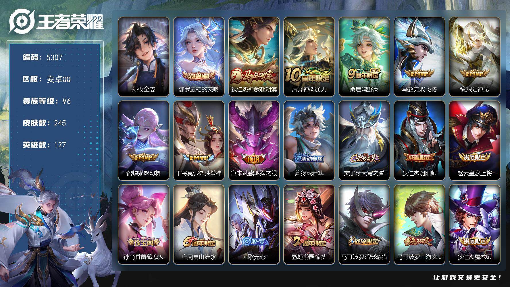 356-[17376220]可二次贵族6-245皮-1典藏-8传说-2全皮-星传说时之思念-幽冥之眼安卓手Q370区245皮1典藏8传说0无双V6 营地ID1875110986绝世王者【荣耀典藏】:最初的交响【优质限定皮肤】:无双飞将【传说皮肤】:神骥·赴朔漠,神树通天,久胜战神,地狱之眼,炽阳神光,无双飞将,猫影幻舞,鸣野蒿【史诗皮肤】:无限星赏官,猫狗日记,九幽镇关,心灵战警,紫霞仙子,光弋星穹,罗小黑战记,巫礼祀神,万物之道,万灵启世,涂山容容,百相守梦,特工魅影,顽岩魄,魔术师,曙光守护