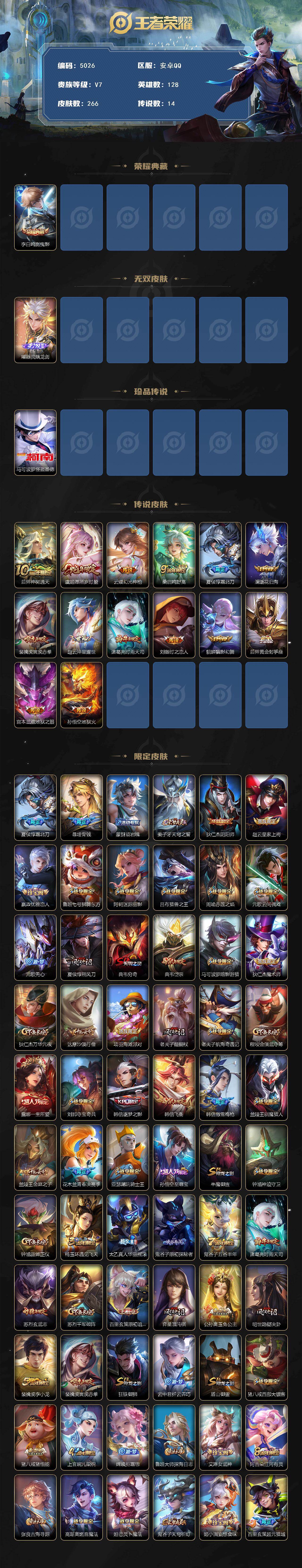 129-[17376411]贵族7-贵族积分44460-266皮1典藏14传说1无双1珍品传说-3个英雄全皮 安卓手Q39区266皮1典藏14传说1无双1珍品传说V7 营地ID476205243无双王者【珍品传说皮肤】:怪盗基德【无双皮肤】:器灵·螭龙剑【荣耀典藏】:鸣剑·曳影【优质限定皮肤】:至尊宝【传说皮肤】:黄金射手座,地狱之眼,神树通天,时之恋人,时雨天司,地狱火,霜北刀,愿照·岁时盈,鸣野蒿,猫影幻舞,逐花归海,淬星耀世,幻光神枪,寅虎·赤拳【史诗皮肤】:航海奇遇记,百晓客,九幽镇