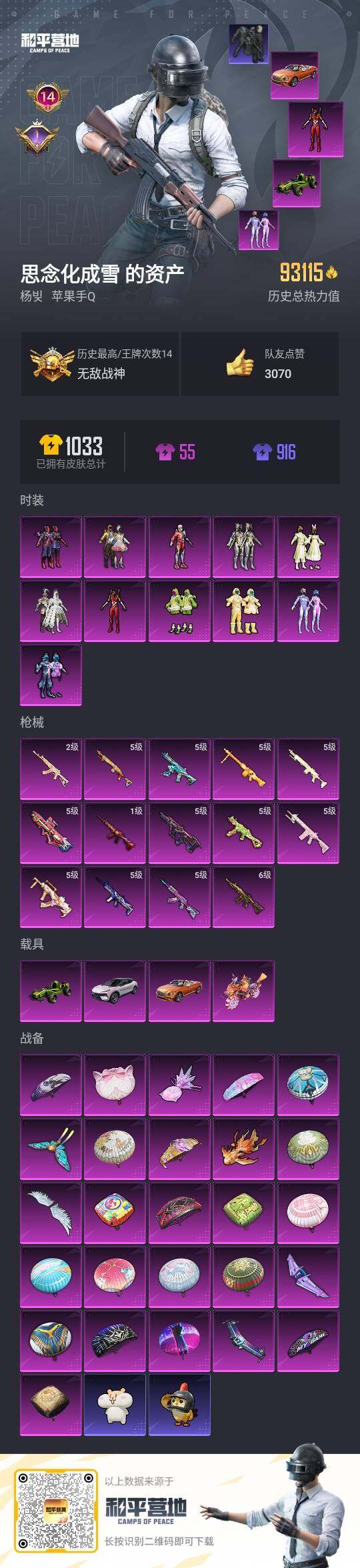 苹果 手Q-无敌战神框-11粉装-14特效枪-4载具-6粉色飞行器-93115热力值-14王牌印记-207套装-289枪皮