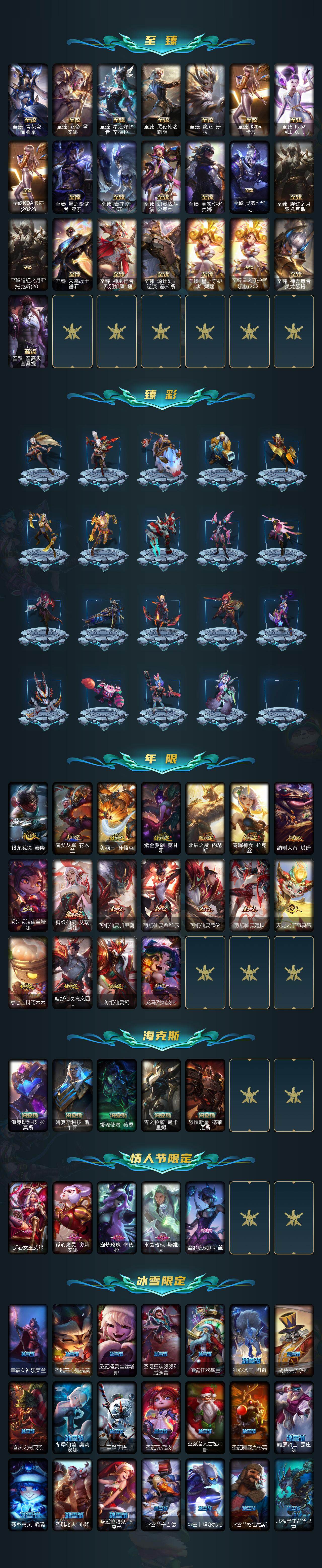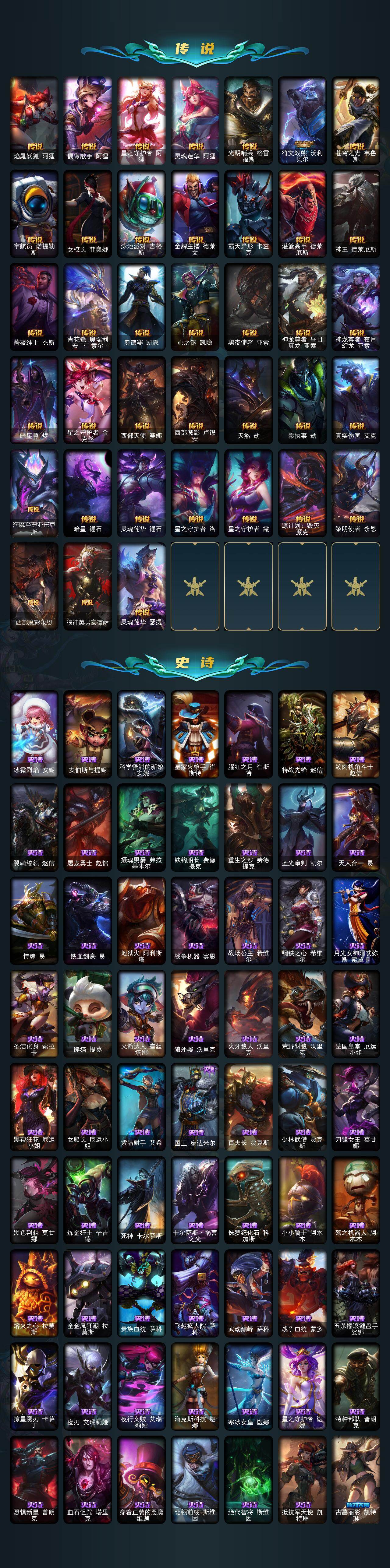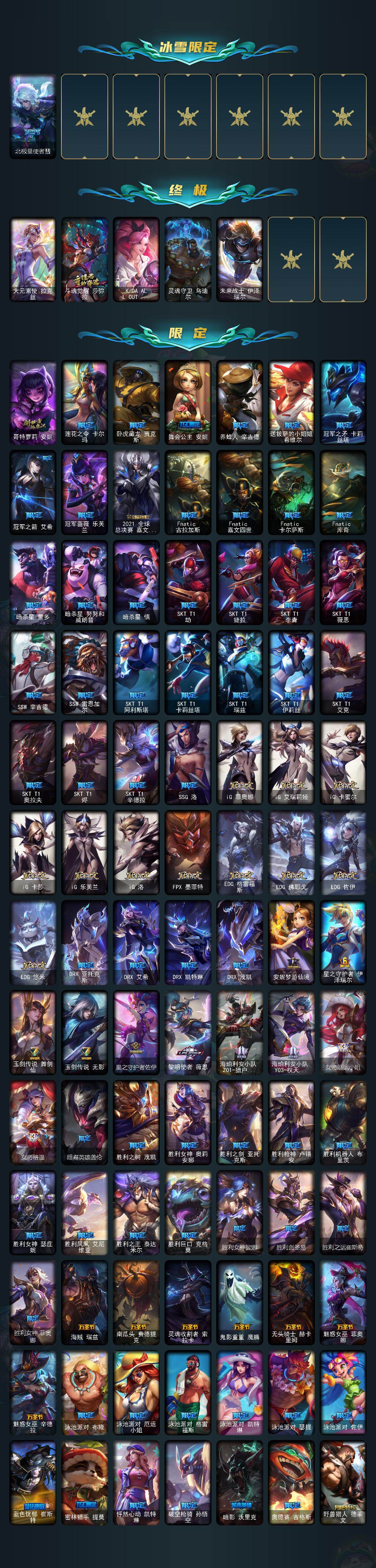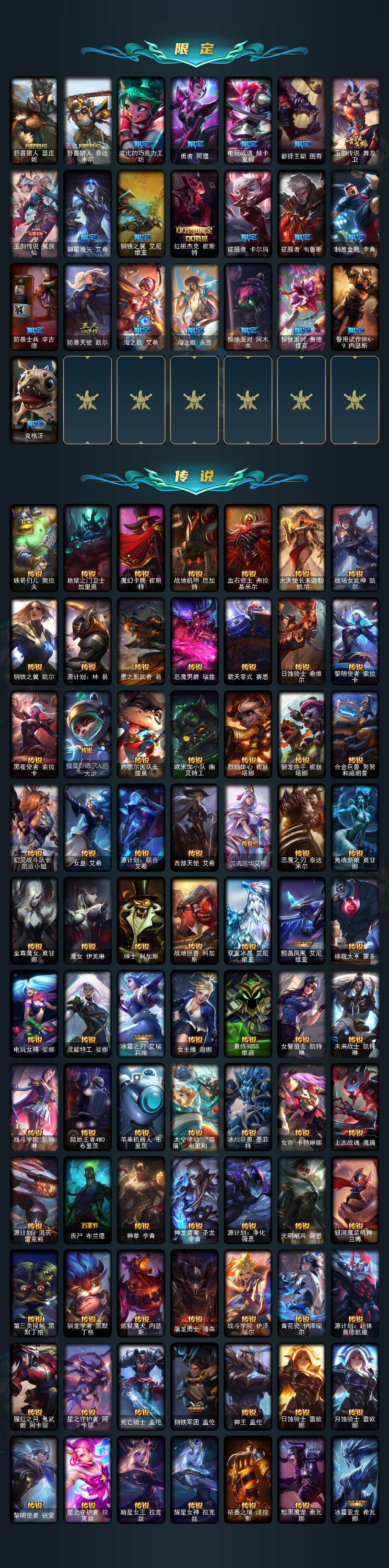 【神话皮肤】:十周年纪念安妮,源代码乐芙兰,殿堂传奇乐芙兰,十五周年纪念希维尔,水晶圣骑艾希,新卧虎藏龙贾克斯,暗星科加斯,神凰行者瑞羽圣凰艾尼维亚,黎明使者卡尔玛,殿堂传奇薇恩,灰烬骑士莫德凯撒,水晶圣骑蕾欧娜,水晶巫灵泽拉斯,水晶泰坦诺提勒斯,水晶掠夺者卡兹克,水晶圣骑塔莉娅,永恒之森奥恩,灰烬骑士派克,海克斯科技拉莫斯,海克斯科技斯维因,恐惧新星德莱厄斯,零之枪骑赫卡里姆,摄魂