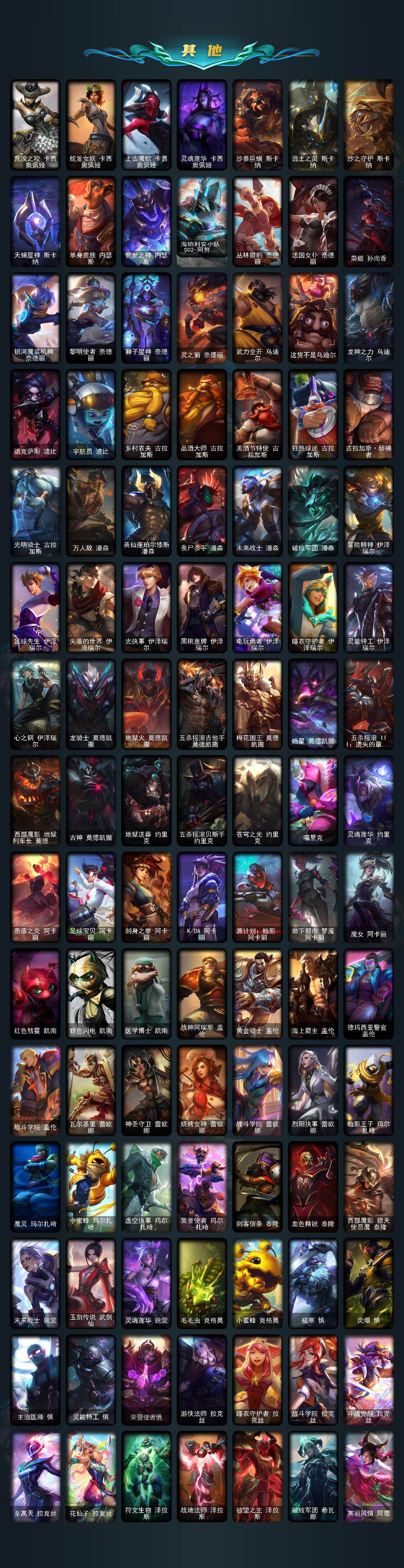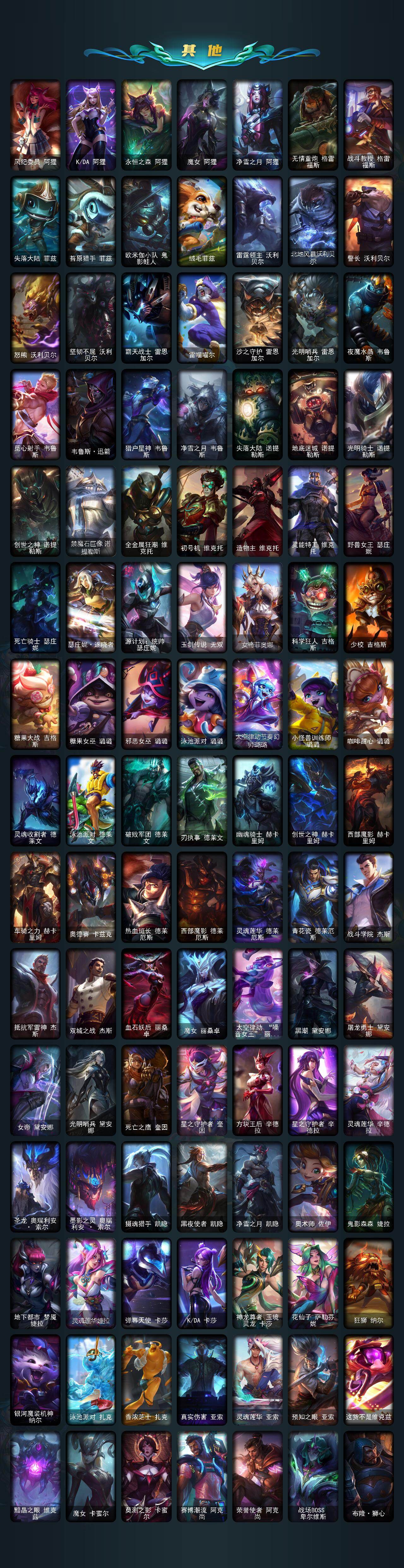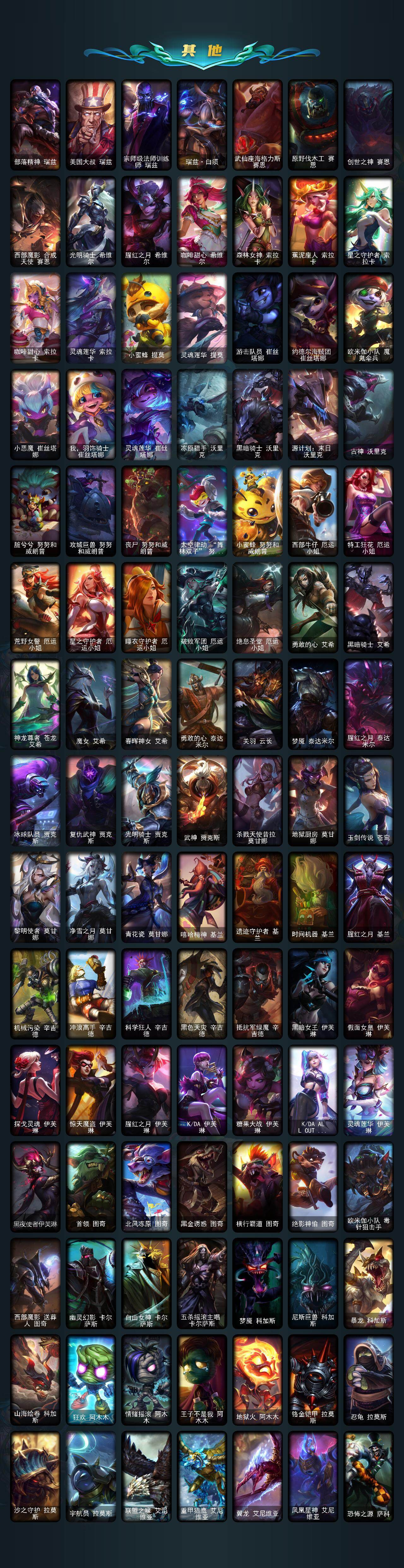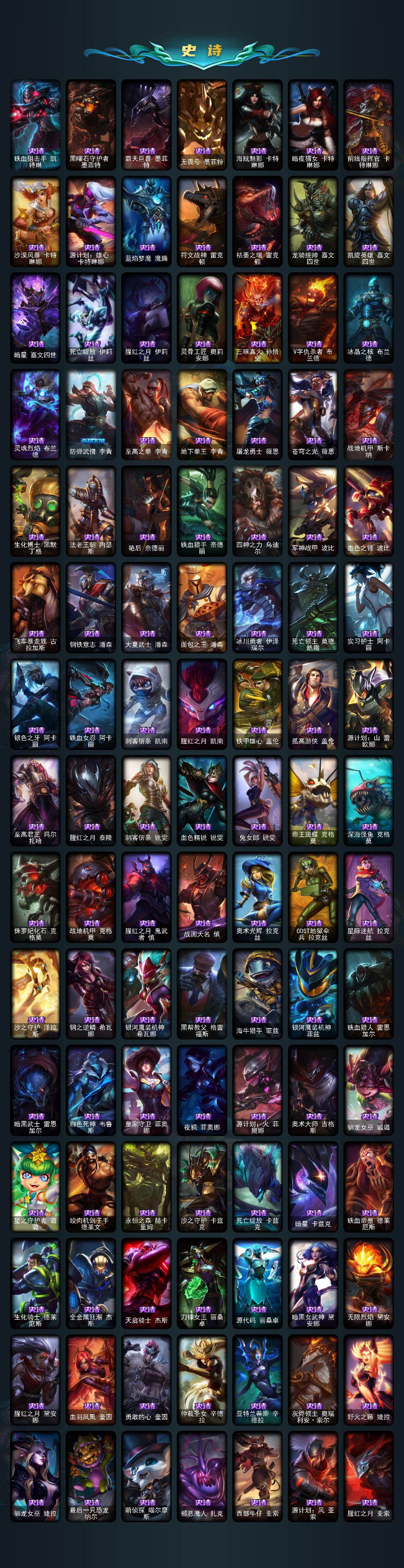 【神话皮肤】:十周年纪念安妮,源代码乐芙兰,殿堂传奇乐芙兰,十五周年纪念希维尔,水晶圣骑艾希,新卧虎藏龙贾克斯,暗星科加斯,神凰行者瑞羽圣凰艾尼维亚,黎明使者卡尔玛,殿堂传奇薇恩,灰烬骑士莫德凯撒,水晶圣骑蕾欧娜,水晶巫灵泽拉斯,水晶泰坦诺提勒斯,水晶掠夺者卡兹克,水晶圣骑塔莉娅,永恒之森奥恩,灰烬骑士派克,海克斯科技拉莫斯,海克斯科技斯维因,恐惧新星德莱厄斯,零之枪骑赫卡里姆,摄魂
