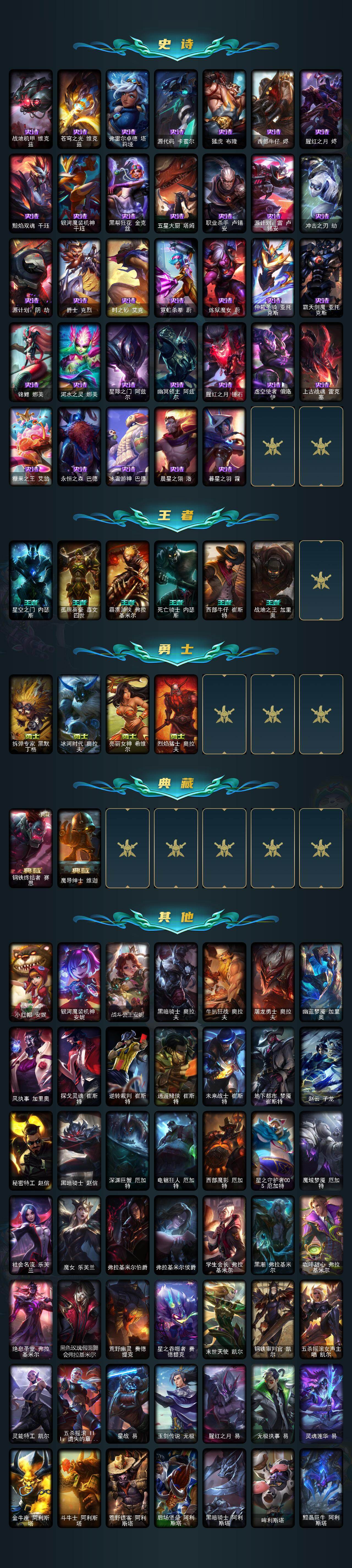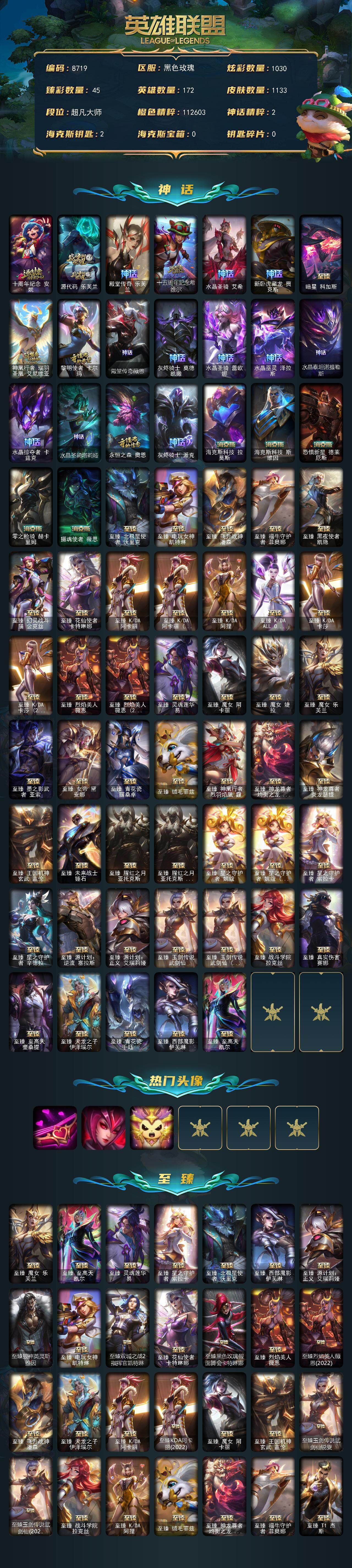 大师段位-172英雄-1133皮肤-1030炫彩-7终极-73神话
