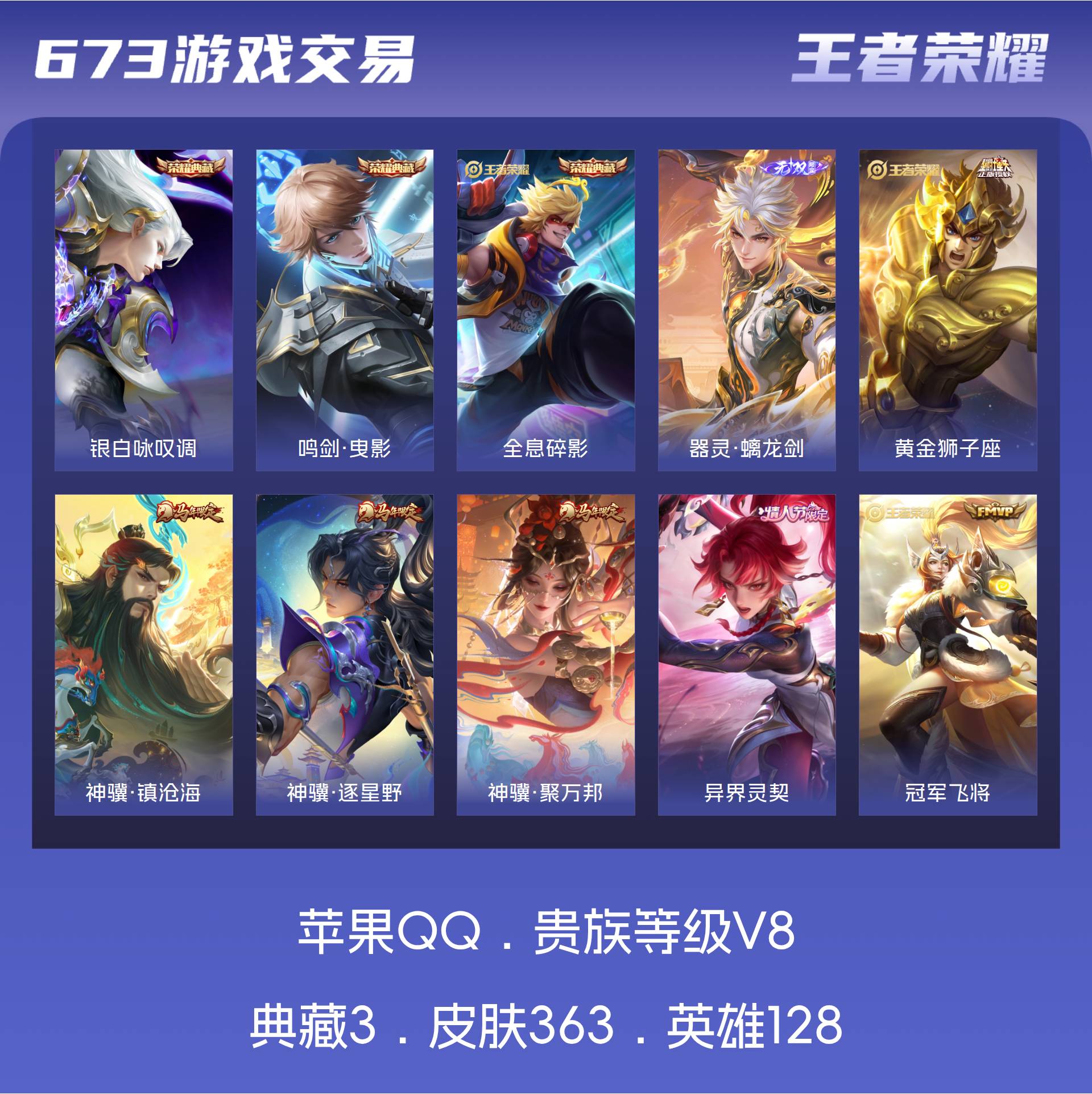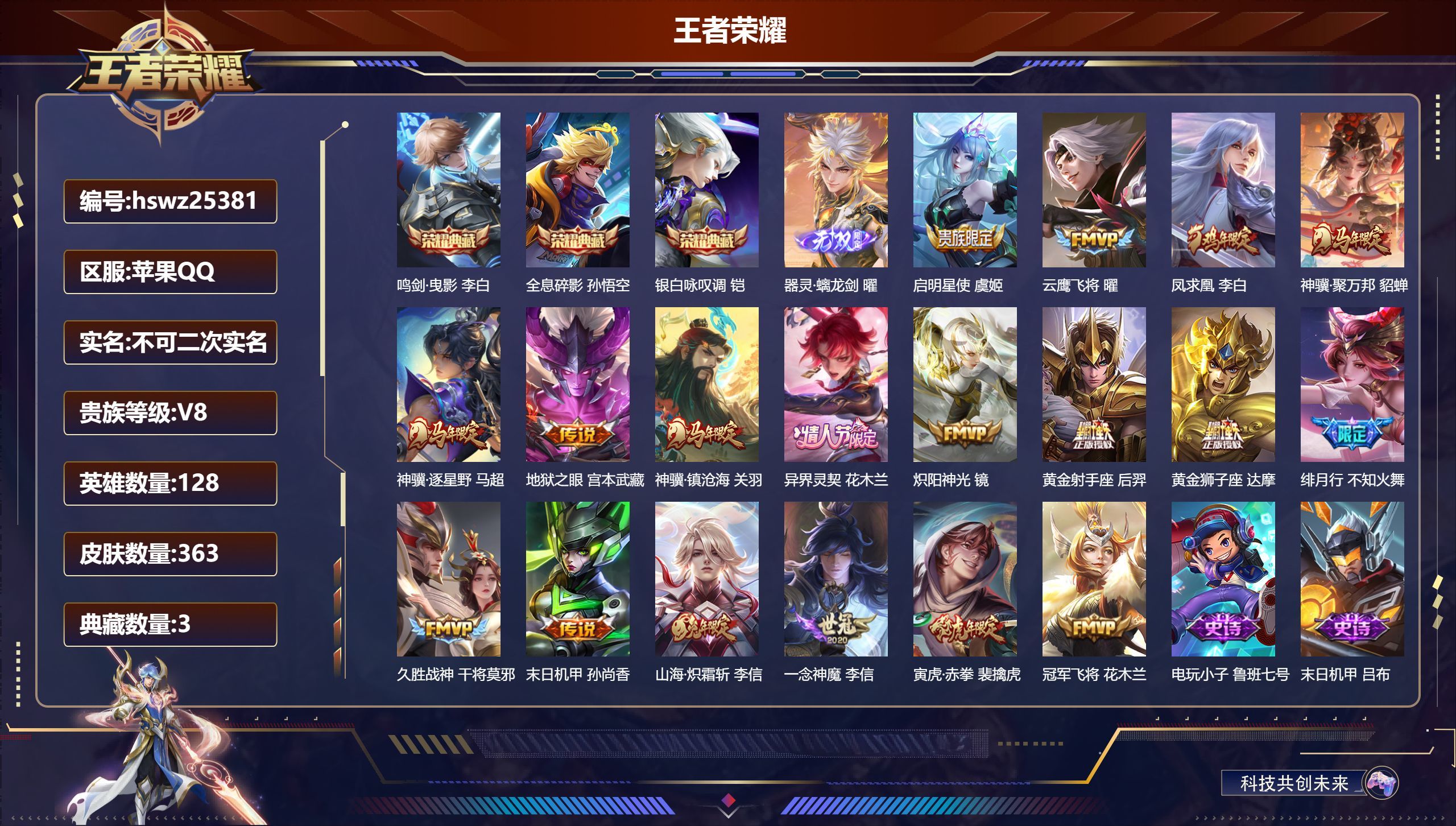 苹果QQ/至尊星耀/363皮肤/128英雄/3典藏/0珍品无双/1无双/0珍品传说/18传说/105
