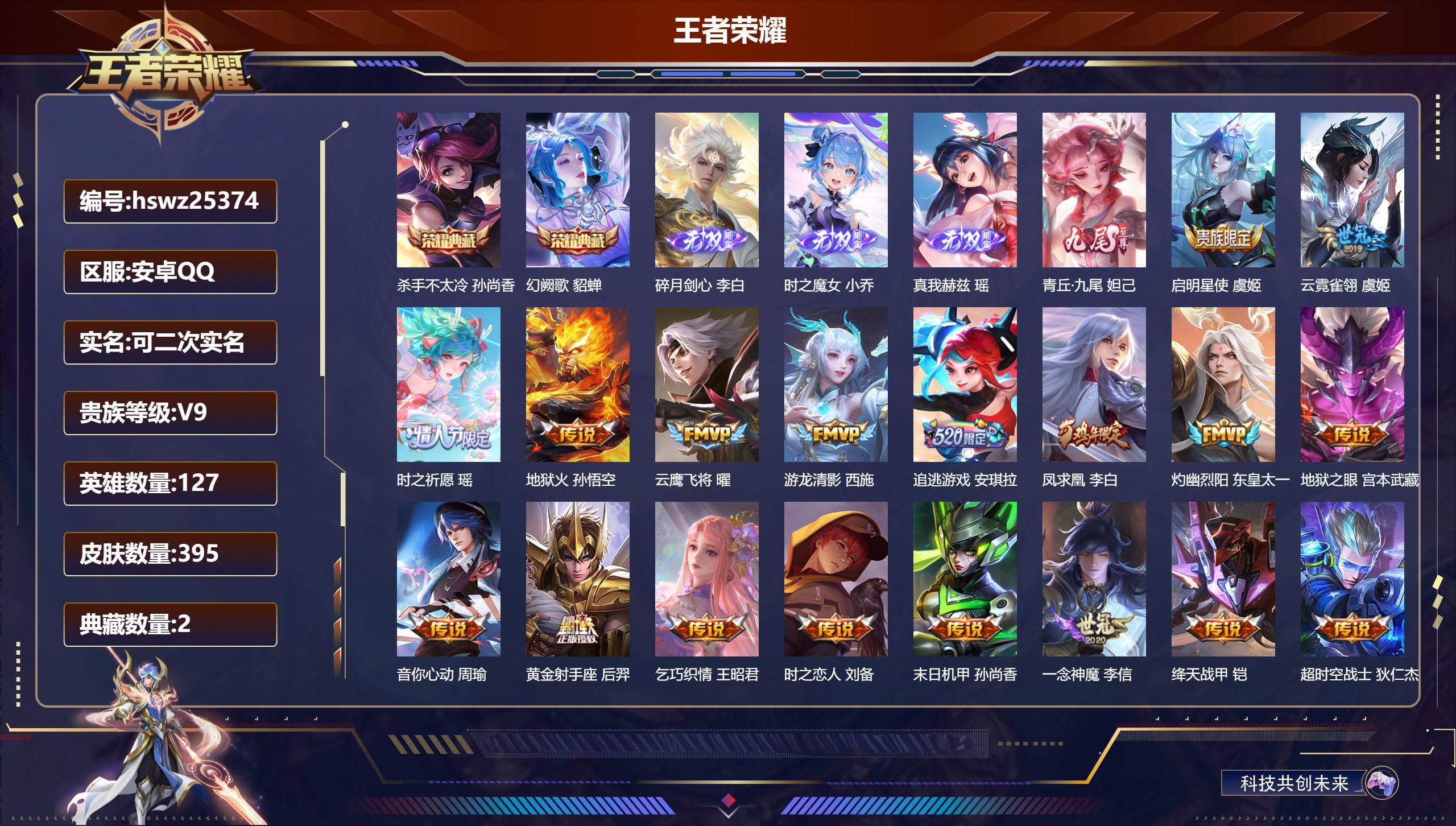 安卓QQ/非凡王者/395皮肤/127英雄/2典藏/0珍品无双/4无双/0珍品传说/25传说/124
