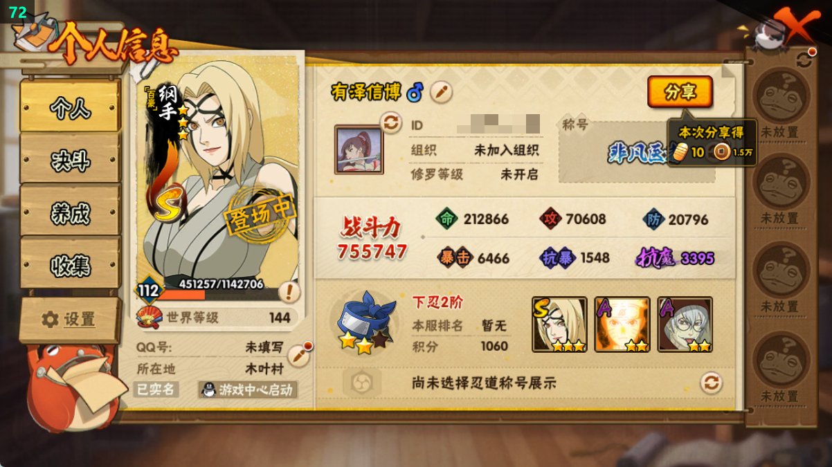 (可转苹果)百豪纲手2s+忍卡8A战力75账号等级112忍者