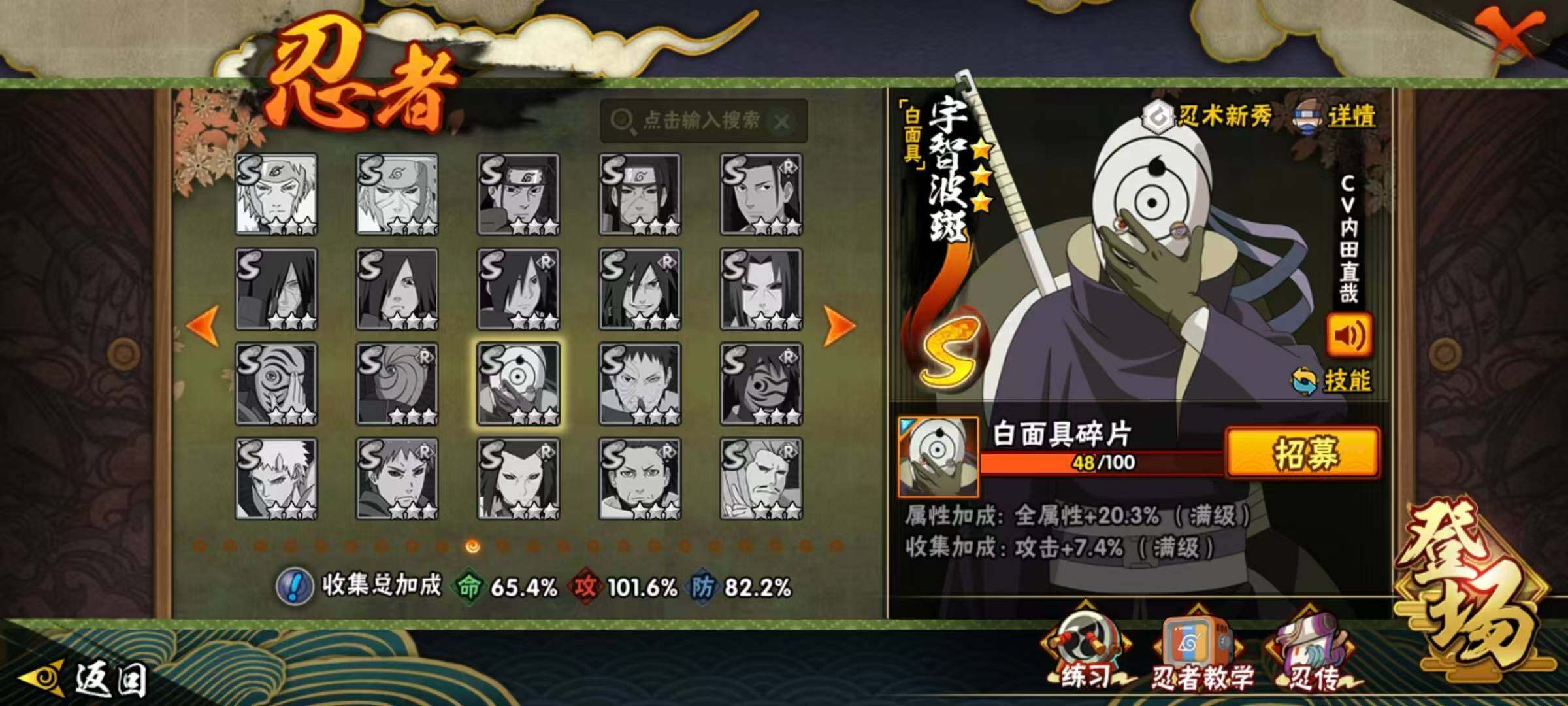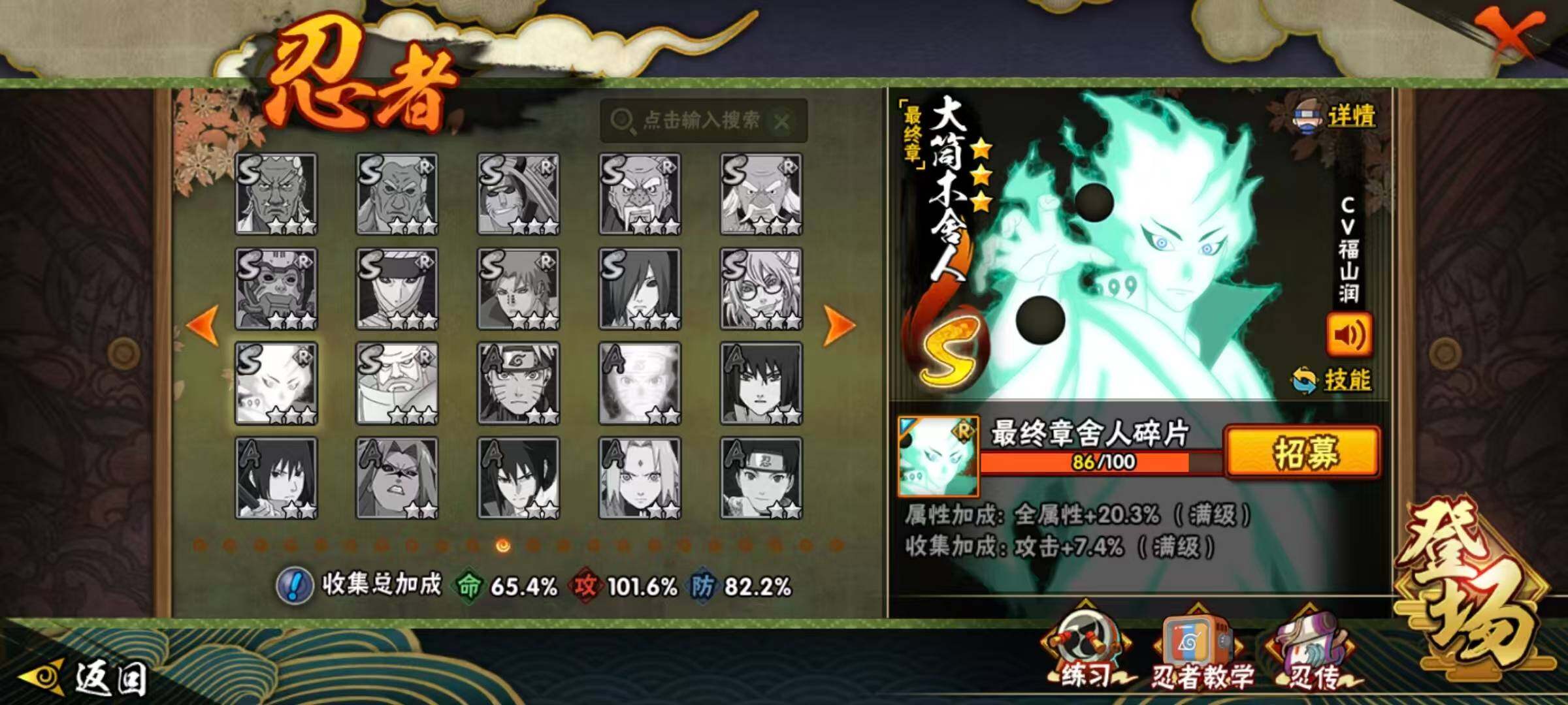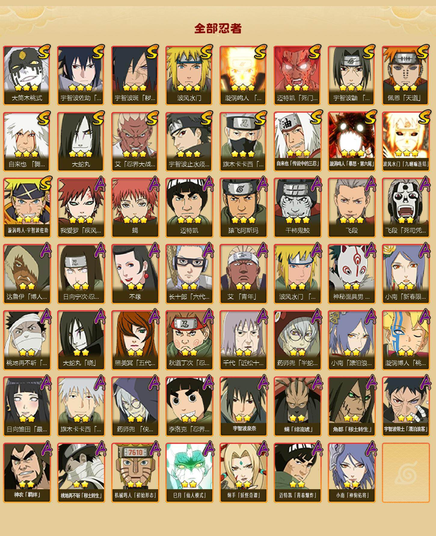 【S级忍者】:宇智波斑「秽土转生·解」(3星),艾「忍界大战」(3星),宇智波鼬「须佐能乎」(3星),宇智波止水「须佐能乎」(3星),旗木卡卡西「须佐能乎」(3星),自来也「舞之豪杰」(3星),大蛇丸(3星),自来也「传说中的三忍」(3星),波风水门(3星),漩涡鸣人「九喇嘛连结」(3星),迈特凯「死门」(3星),佩恩「天道」(3星),宇智波佐助「永恒万花筒」(3星),大筒木桃式(3星),漩涡鸣人「暴怒·第六尾」(3星),波风水门「九喇嘛连结」(3星),漩涡鸣人·