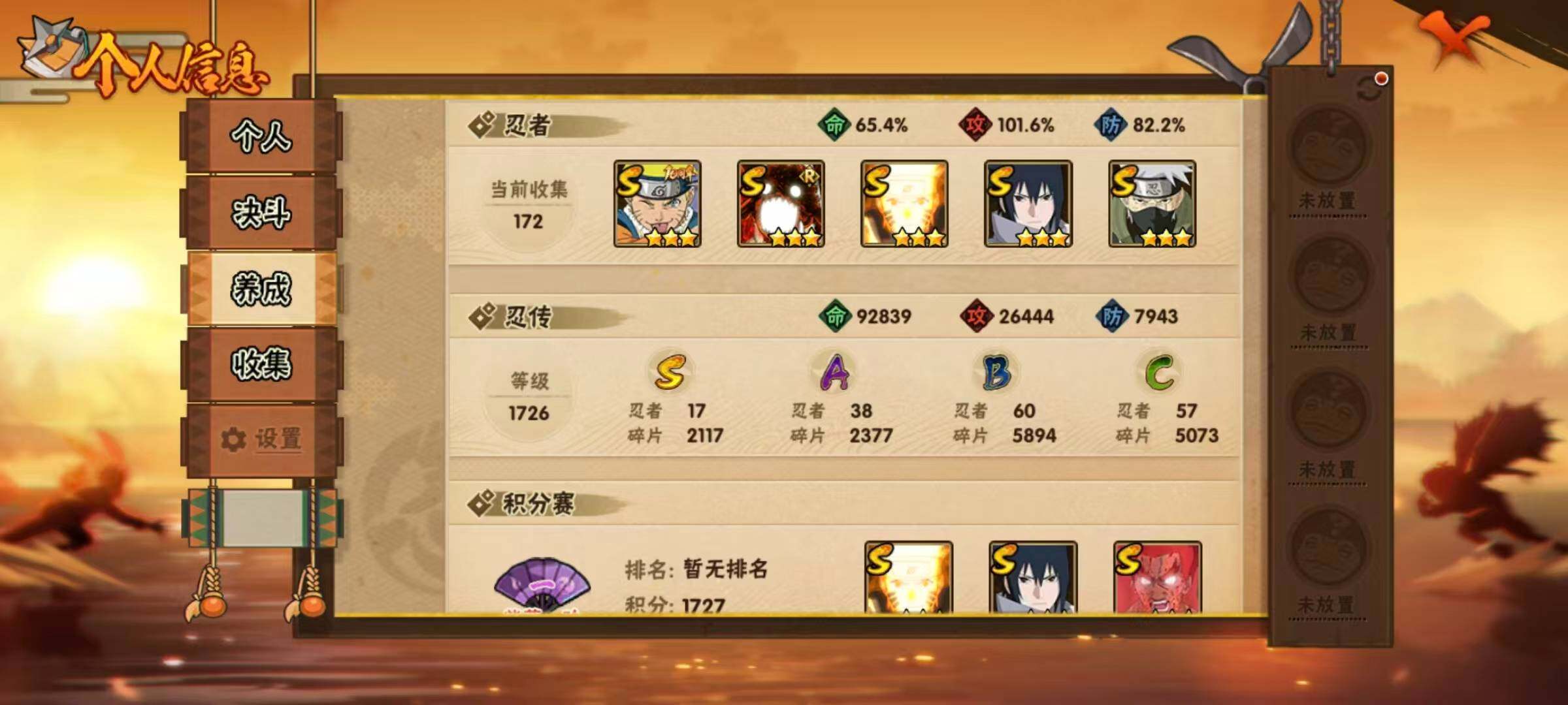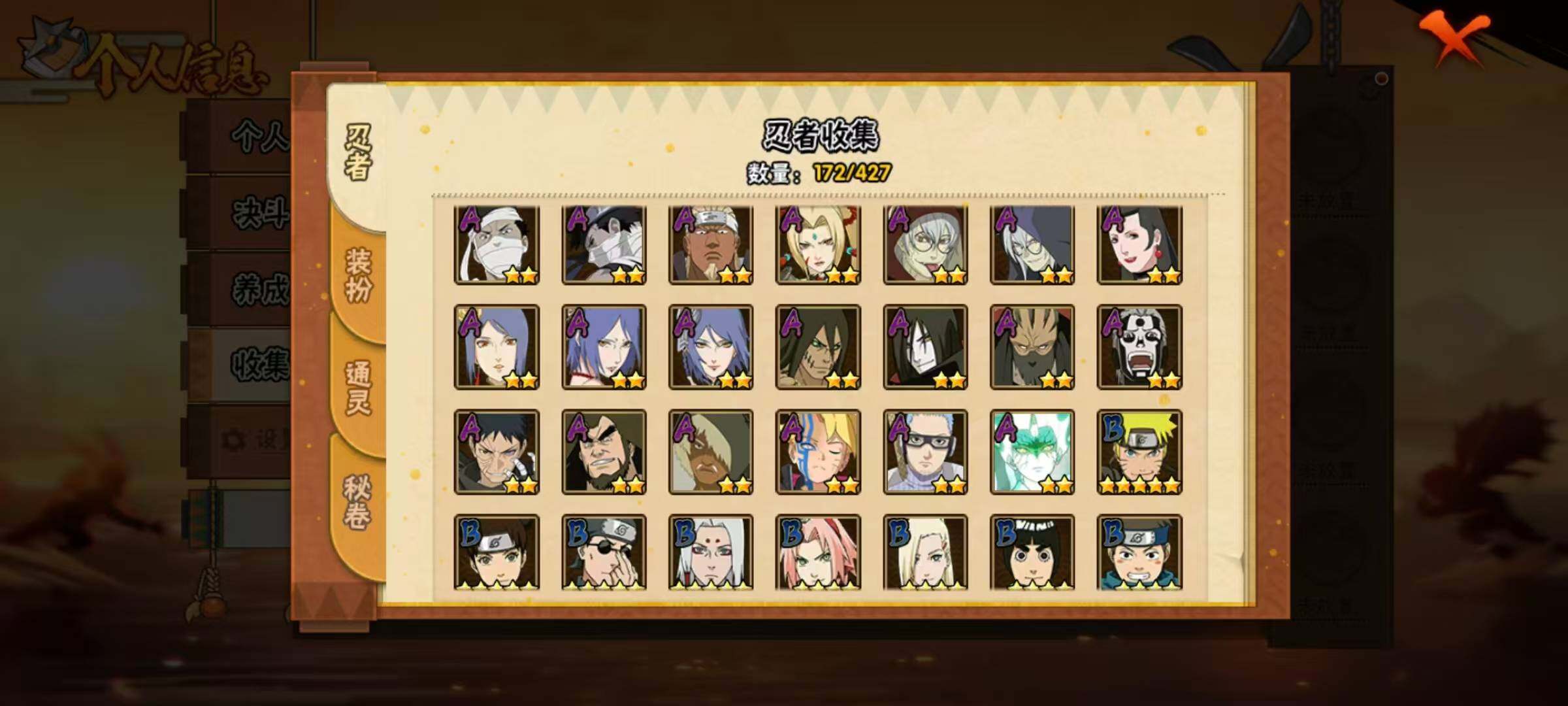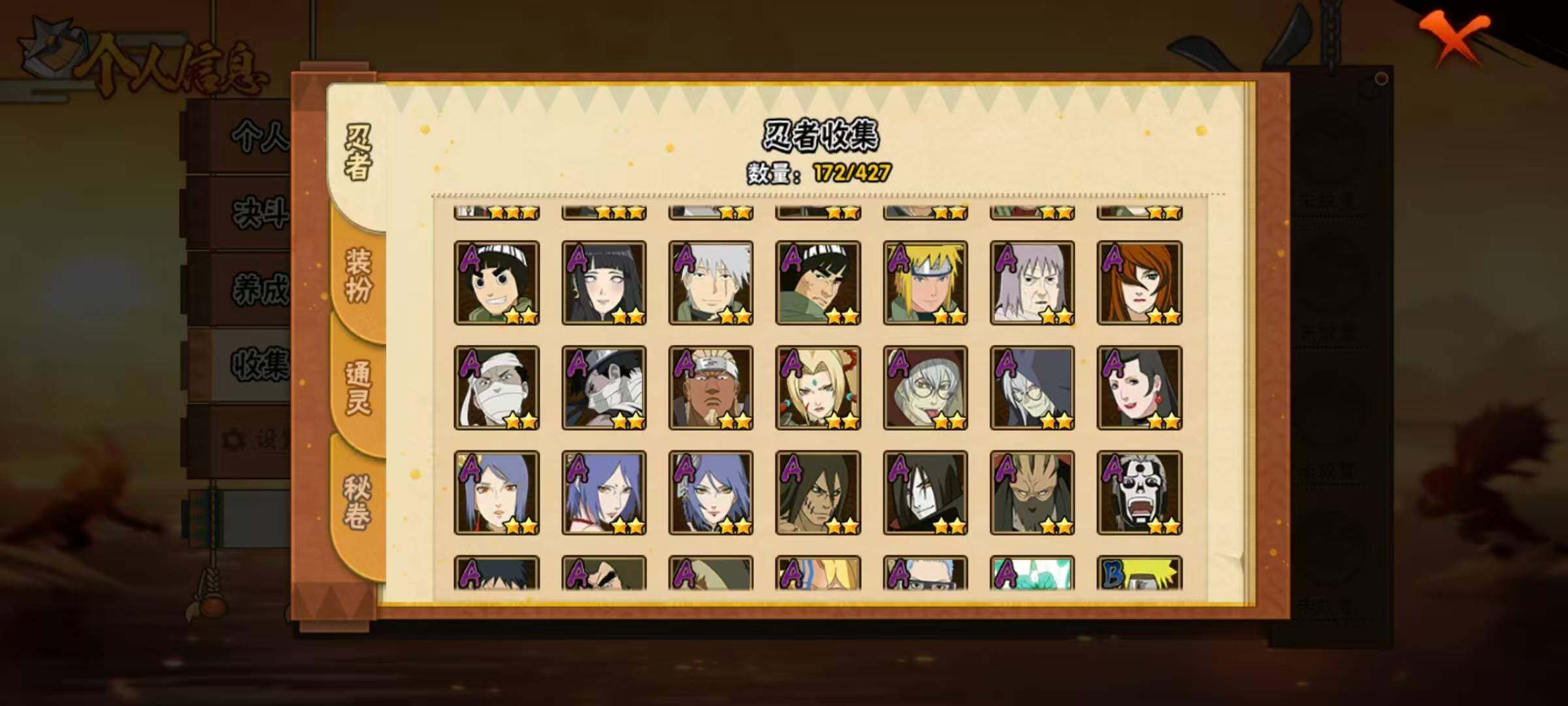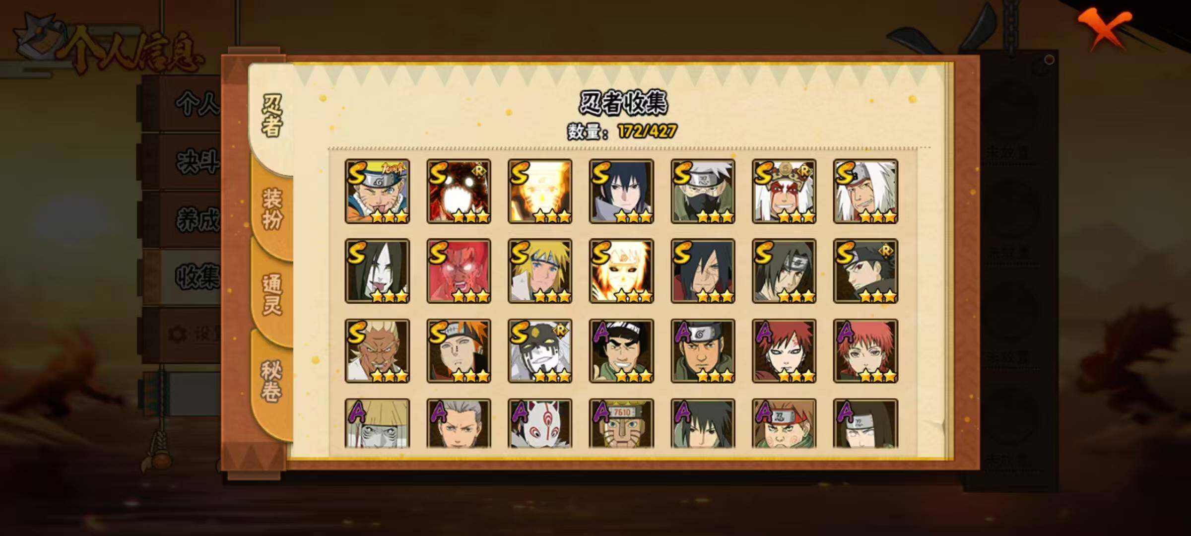 【S级忍者】:宇智波斑「秽土转生·解」(3星),艾「忍界大战」(3星),宇智波鼬「须佐能乎」(3星),宇智波止水「须佐能乎」(3星),旗木卡卡西「须佐能乎」(3星),自来也「舞之豪杰」(3星),大蛇丸(3星),自来也「传说中的三忍」(3星),波风水门(3星),漩涡鸣人「九喇嘛连结」(3星),迈特凯「死门」(3星),佩恩「天道」(3星),宇智波佐助「永恒万花筒」(3星),大筒木桃式(3星),漩涡鸣人「暴怒·第六尾」(3星),波风水门「九喇嘛连结」(3星),漩涡鸣人·