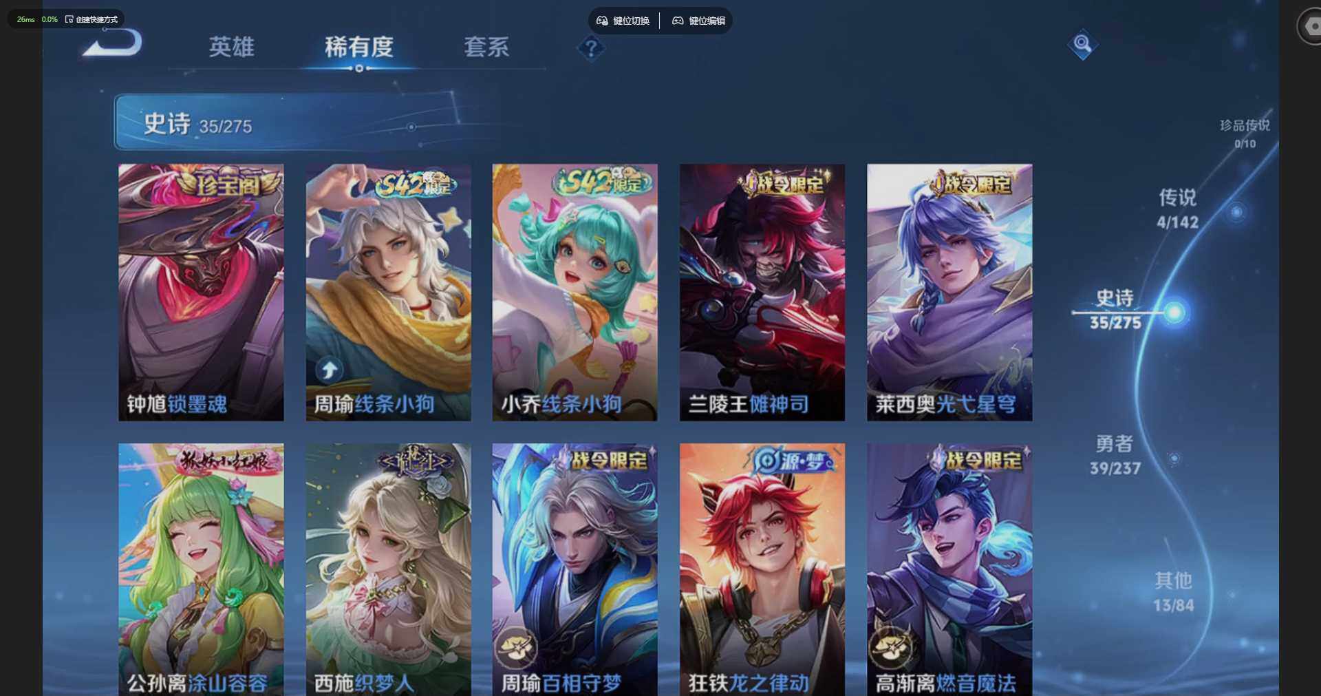 贵族等级: V5 英雄数: 106 皮肤数: 91 传说皮: 地狱之眼,澜逐花