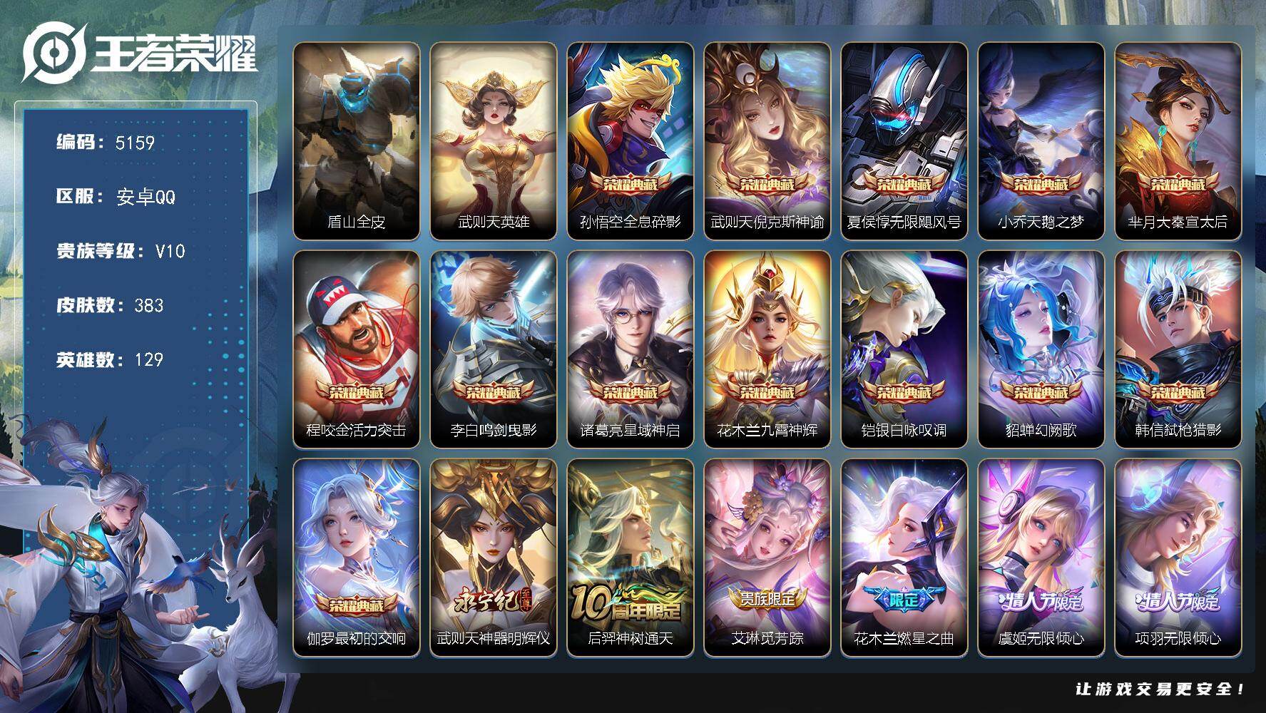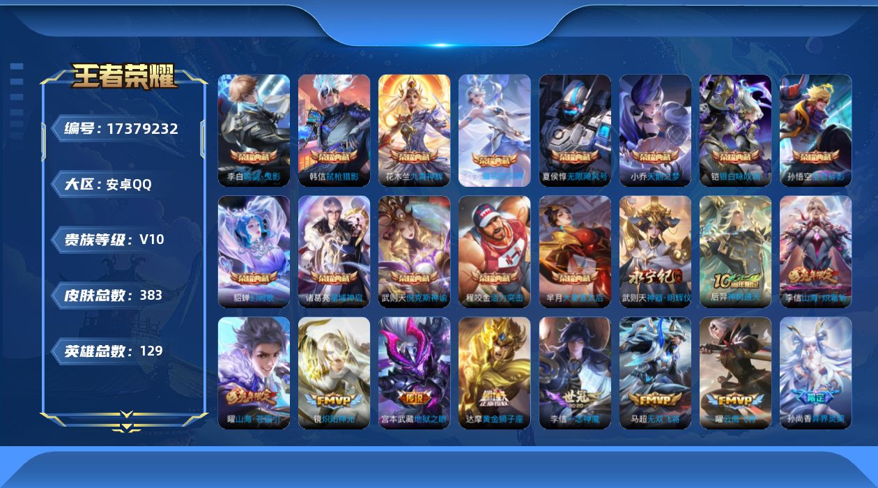 353-[17379232]4个天幕 贵族10-流光积分5805-贵族积分319102-383皮13典藏44传说1无双 安卓手Q263区383皮13典藏44传说1无双V10 营地ID1734794275至尊星耀II【无双皮肤】:神器·明辉仪【荣耀典藏】:倪克斯神谕,最初的交响,弑枪猎影,天鹅之梦,幻阙歌,银白咏叹调,鸣剑·曳影,大秦宣太后,全息碎影,活力突击,九霄神辉,星域神启,无限飓风号【优质限定皮肤】:神威,山海·琳琅生,山海·苍雷引,山海·炽霜斩,无双飞将,至尊宝【传说皮肤】:神