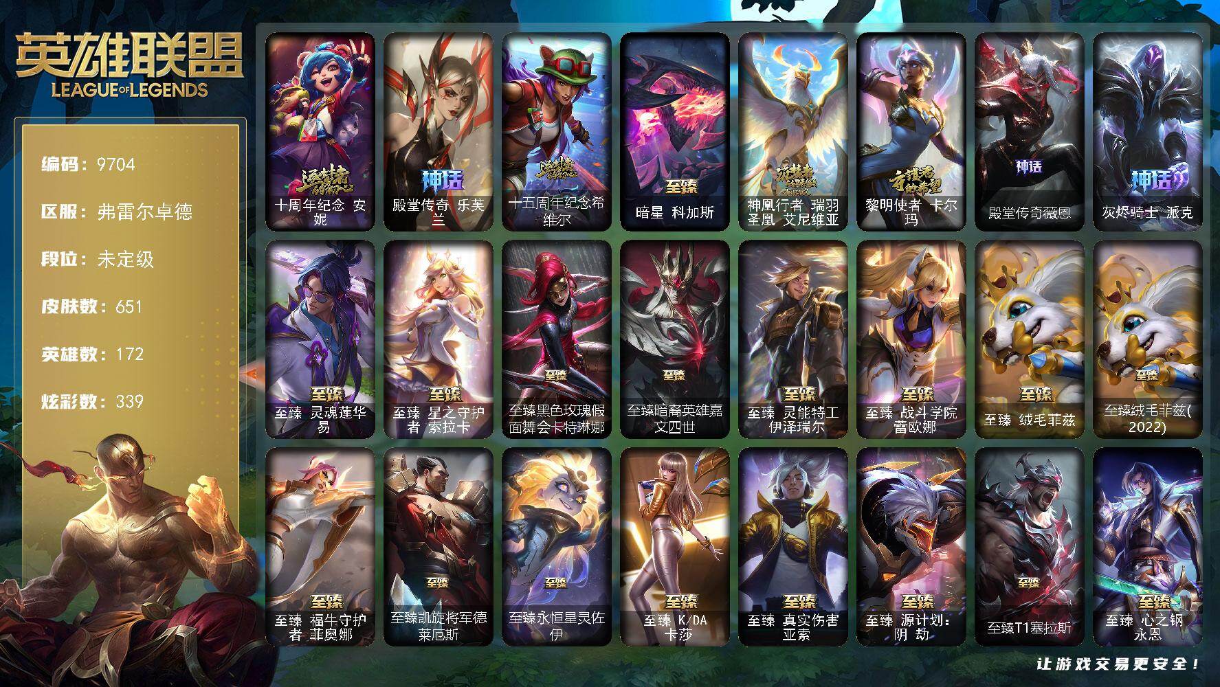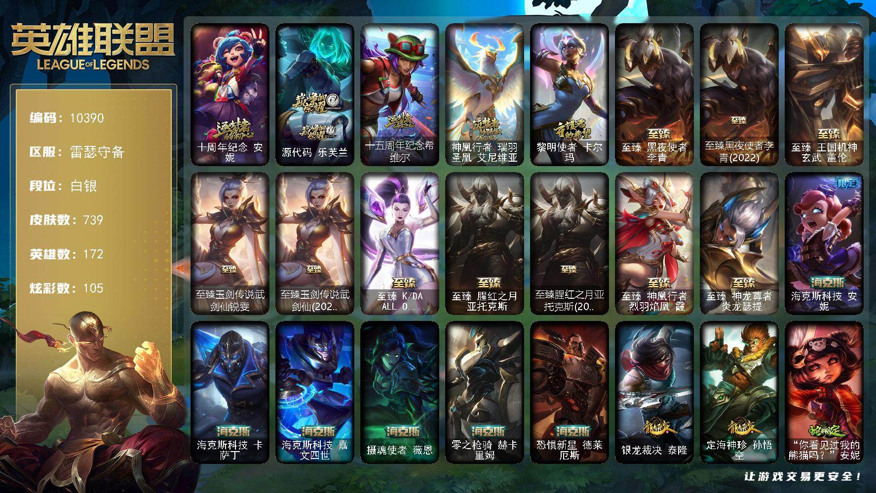 铂金段位-172英雄-446皮肤-237炫彩-0终极-38神话-50限定-50传说-88史诗