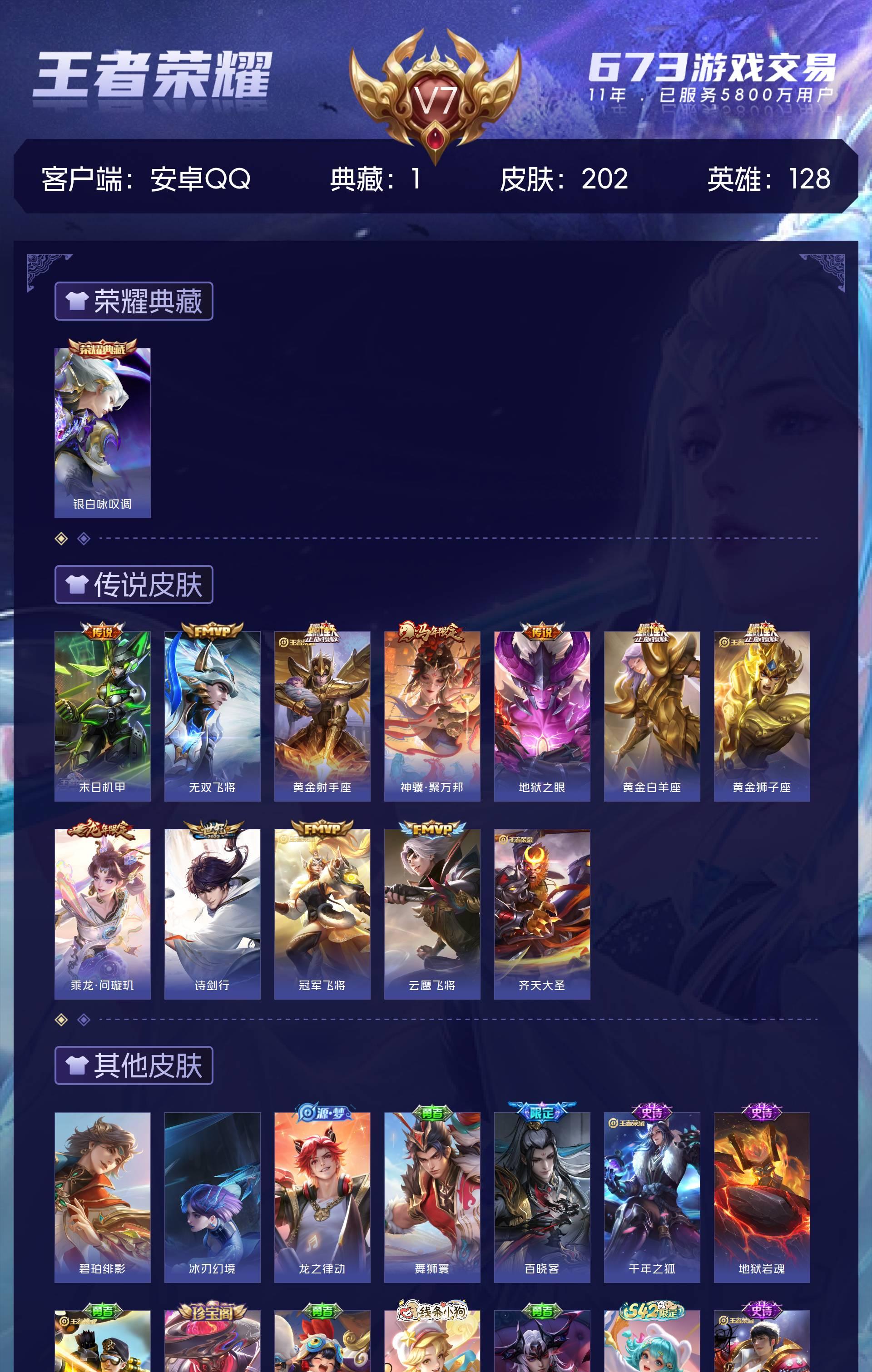 V7 皮肤202 英雄128 无双王者 荣耀典藏1 星传说1 传说12 其他皮肤196