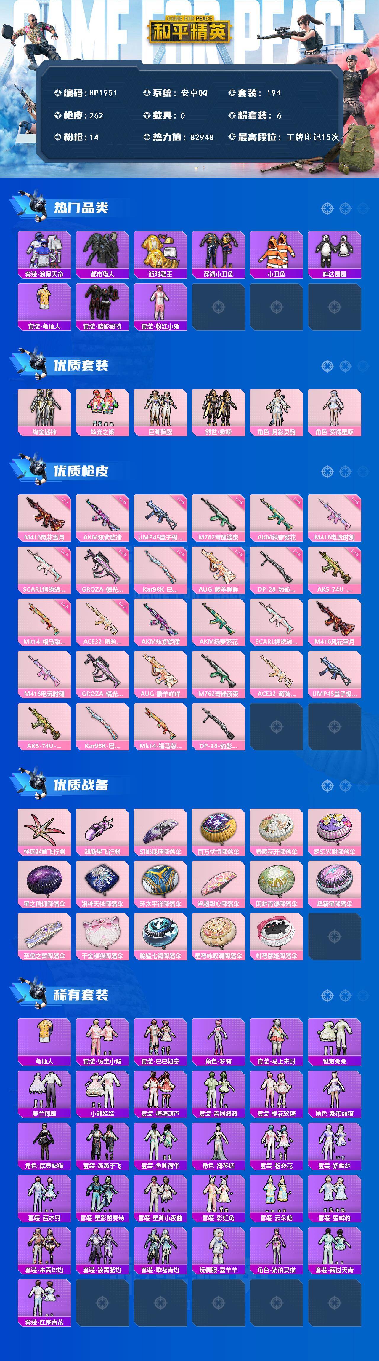 【HP1951】194套装/枪械14/装备300/战备212/王牌印记15/热力值82948/六级AKM-炫紫旋律/五级AKM-绿萝繁花/五级SCAR-L-锦绣绵绵/七级M416-风花雪月/五级M416-电玩时刻/五级GROZA-镜光银凌/五级AUG-暖羊咩咩/五级M762-青锋波束/二级ACE32-萌骑漫游/五级UMP45-量子极限/五级AKS-74U-森灵之息/五级Kar98K-巳巳如意/五级Mk14-福马献瑞/五级DP-28-豹影疾电/套装-浪漫天命/套装-都市猎人/套装-派对舞王/套装-
