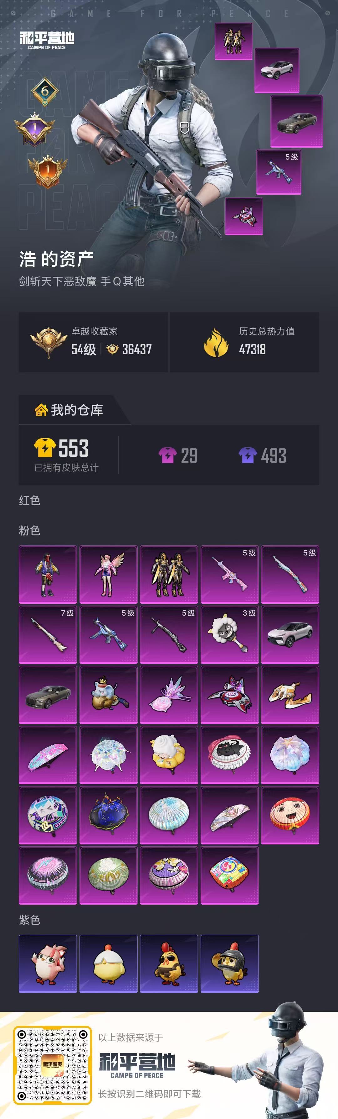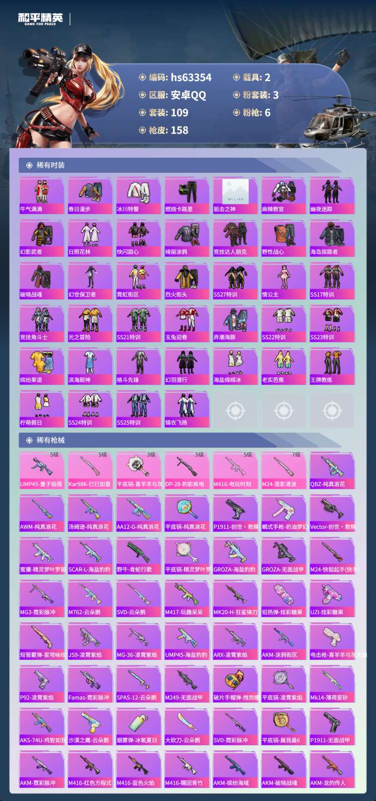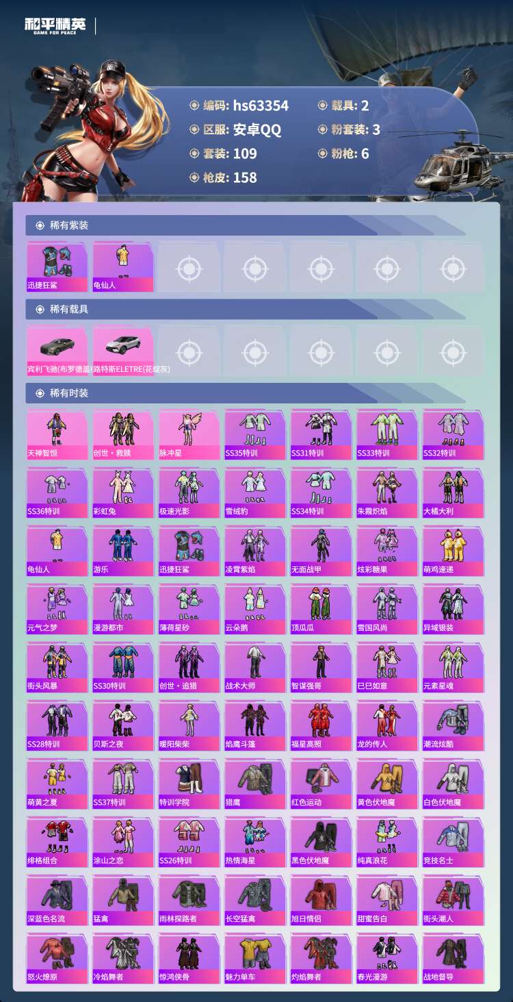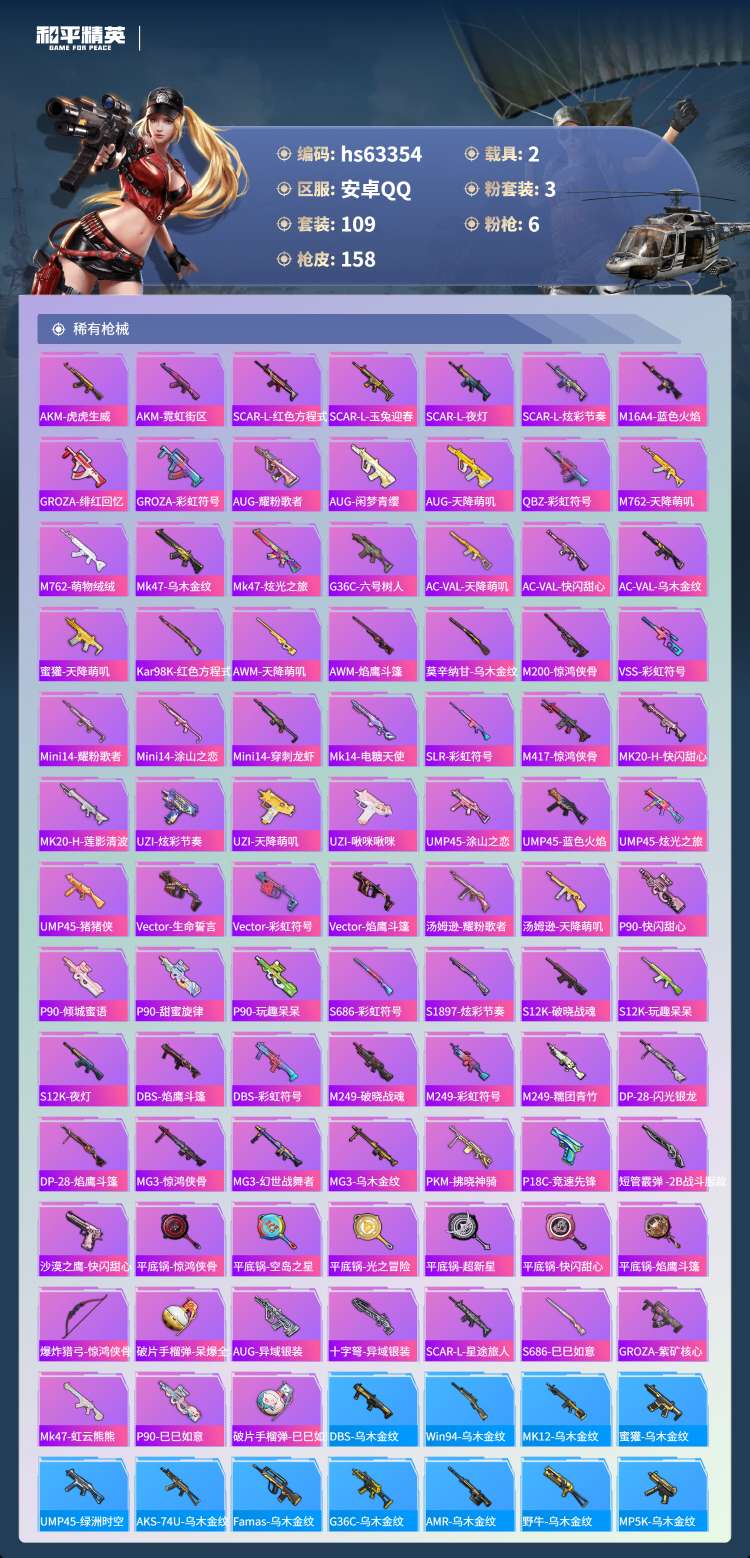 hs63354 安卓手Q-6王牌印记-3粉装-6特效枪-2载具-47318热力值-109套装-158