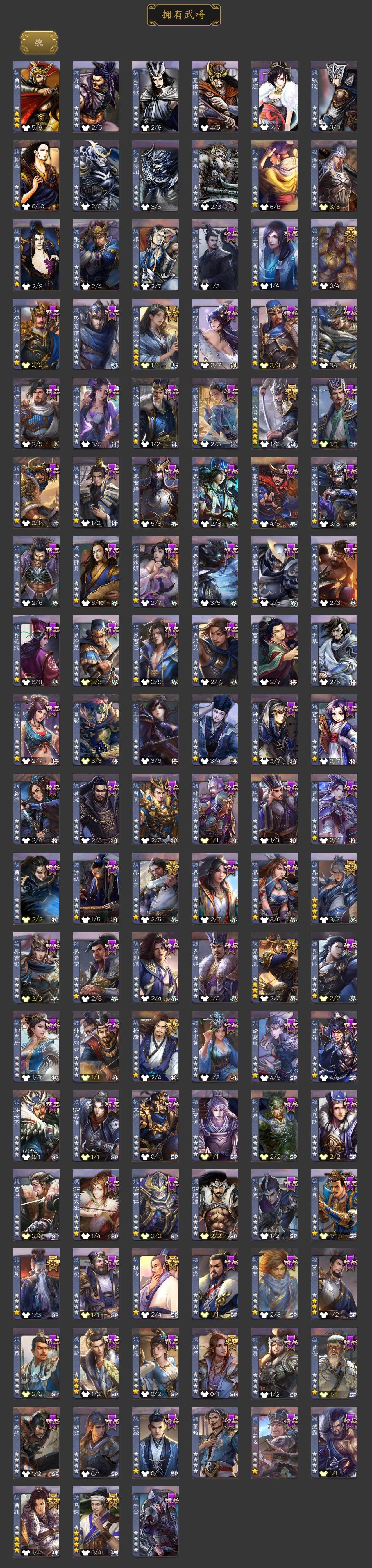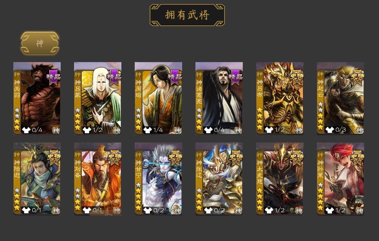 神吕布,神赵云,神陆逊,神刘备,神甘宁,神张辽,神太史慈,神孙策,神诸葛亮,杨修,马钧,界钟会,界于禁,界曹真,嵇康,郝昭,曹纯,刘晔,势辛宪英,程昱,谋诸葛亮,马