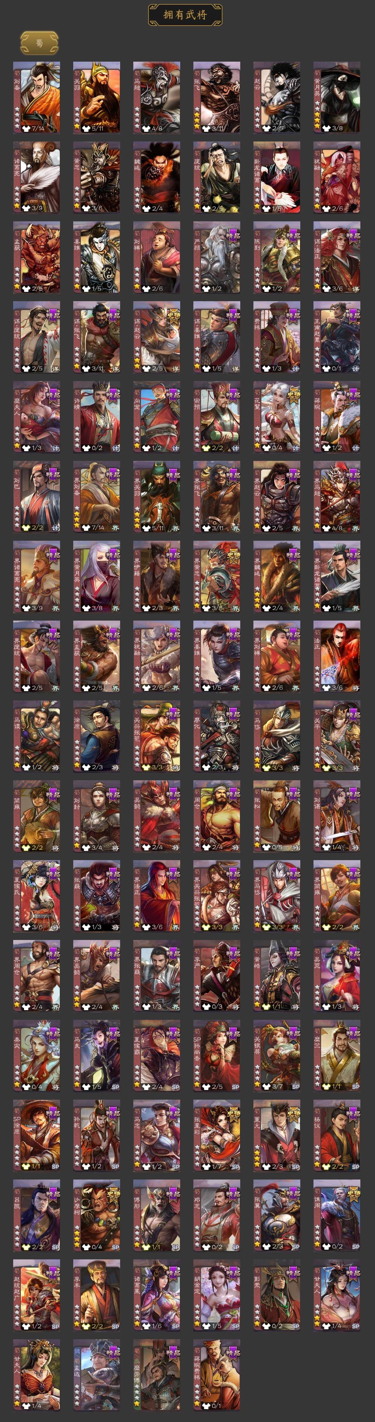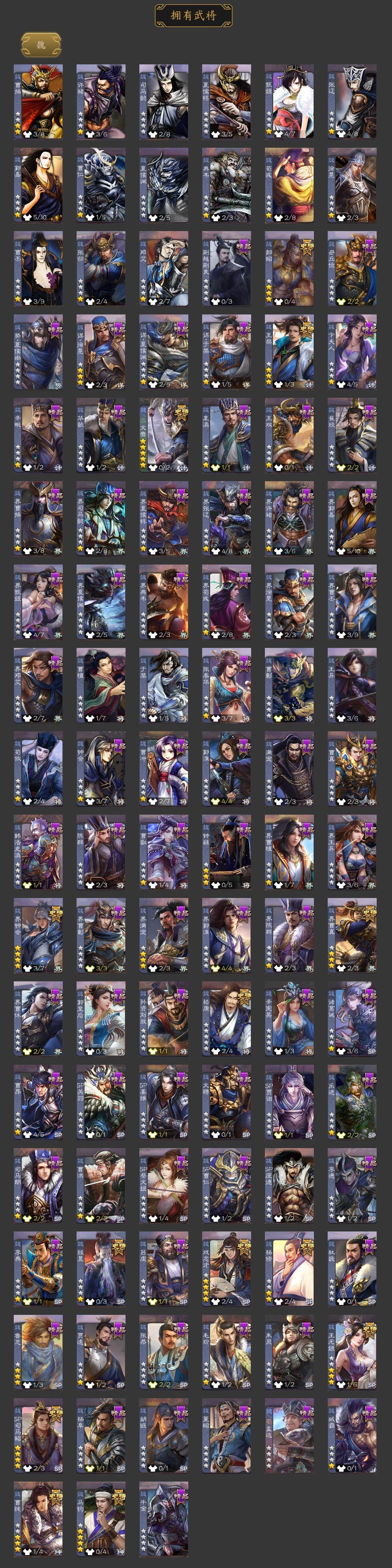 【1538】官阶:大将军;VIP等级:VIP11;史诗武将数量:55;动态皮肤数量:40;武将总数:418;史诗宝珠数量:0;将魂数量:65;神将:7;魏国史诗武将:20;蜀国史诗武将:7;吴国史诗武将:9;群史诗武将:21