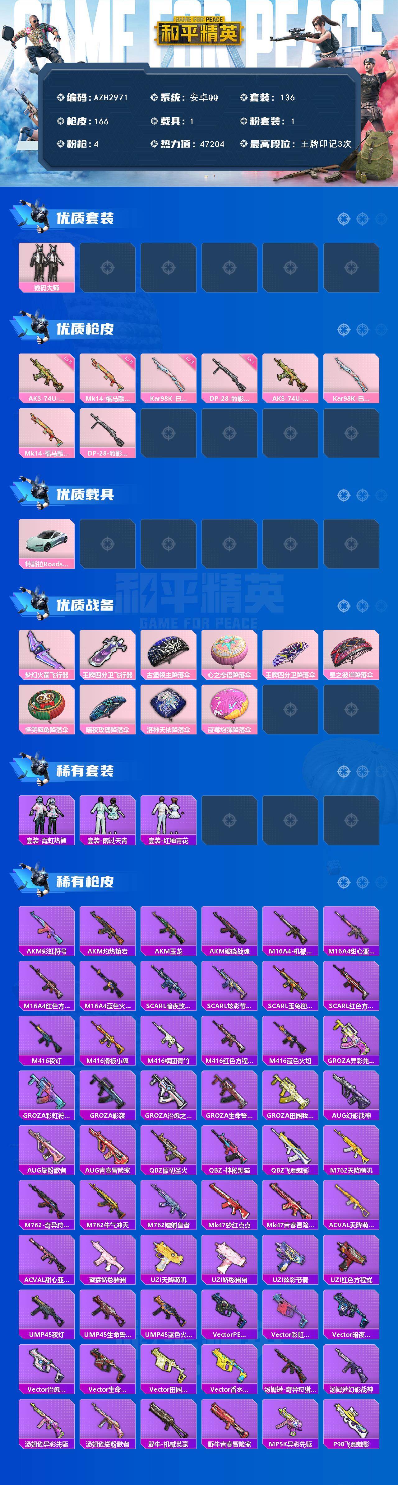 【AZH2971】安卓 手Q【数码大师 1载具】1粉装-4特效枪-1载具-2粉色飞行器-47204热力值-3王牌印记-136套装-166枪皮