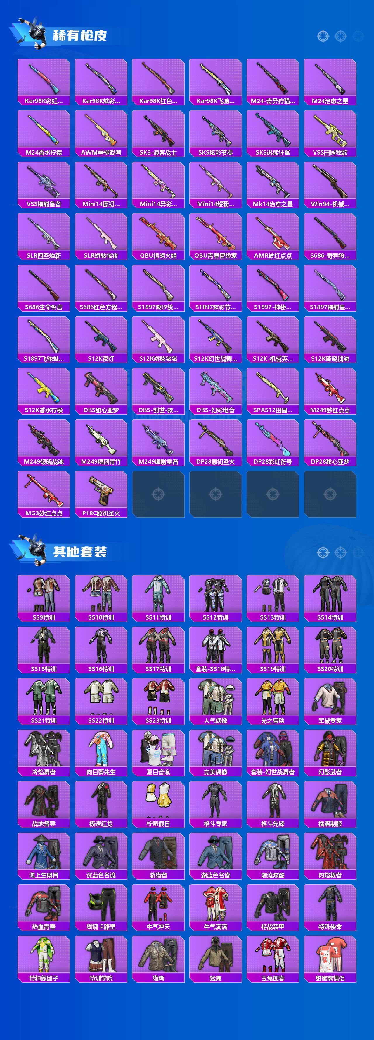 【粉色枪皮等级】:AKS-74U-森灵之息(五级),Kar98K-巳巳如意(三级),Mk14-福马献瑞(五级),DP-28-豹影疾电(一级)