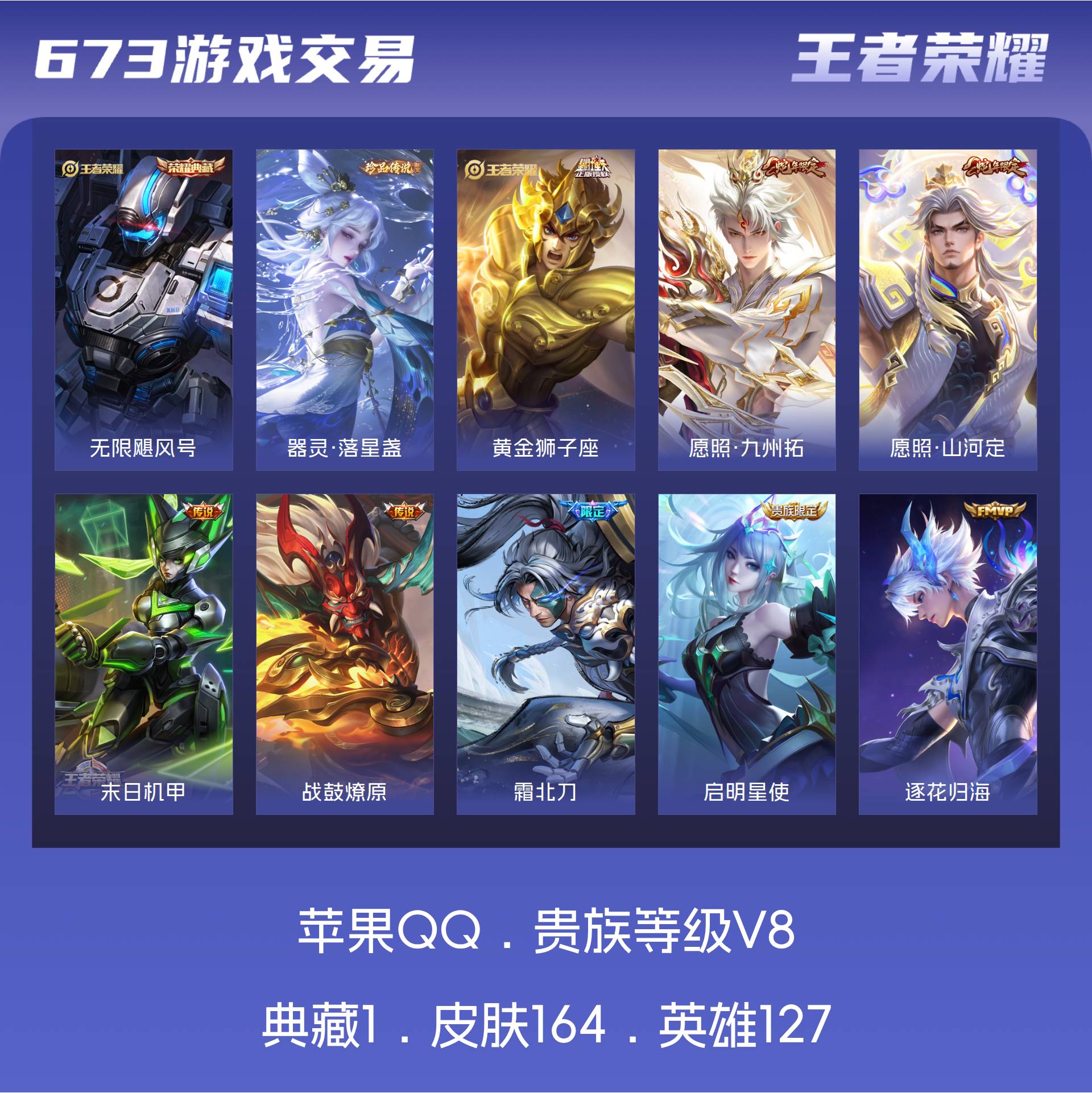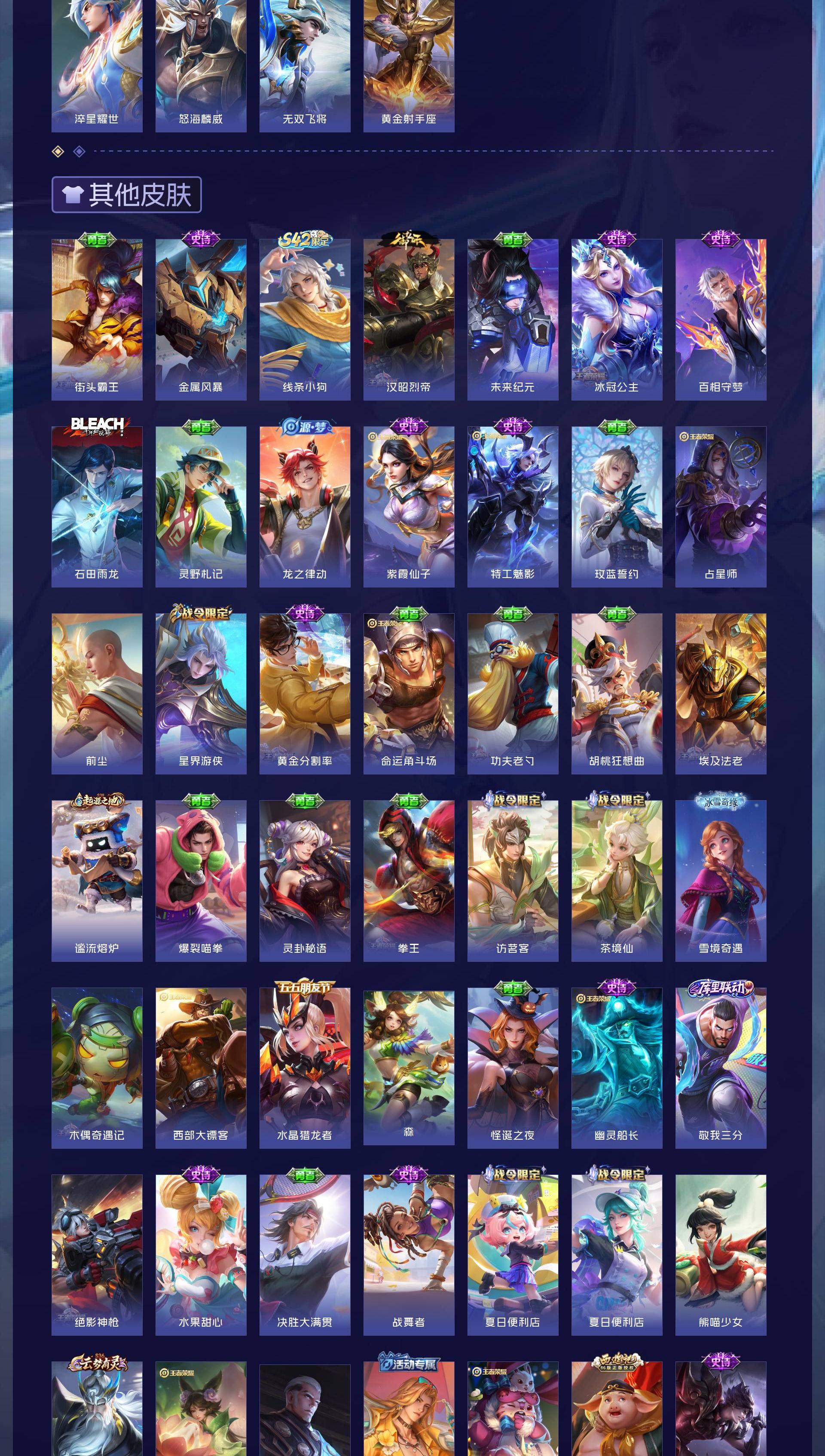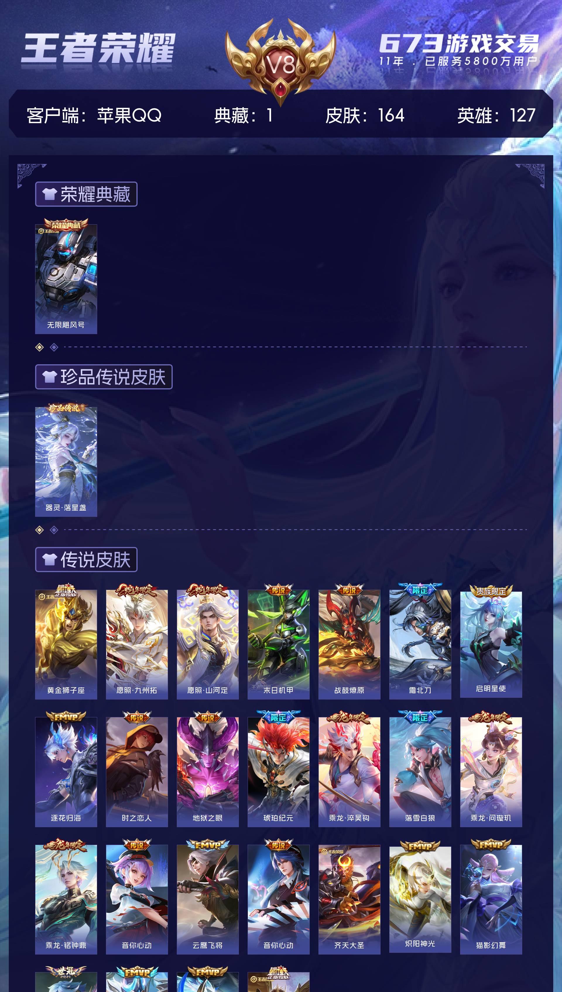 V8 皮肤164 英雄127 永恒钻石 荣耀典藏1 珍品传说1 星传说1 传说25 其他皮肤144