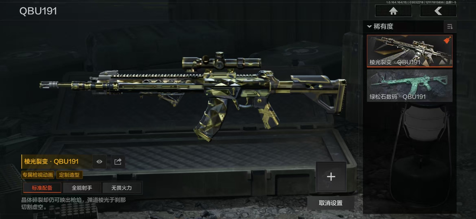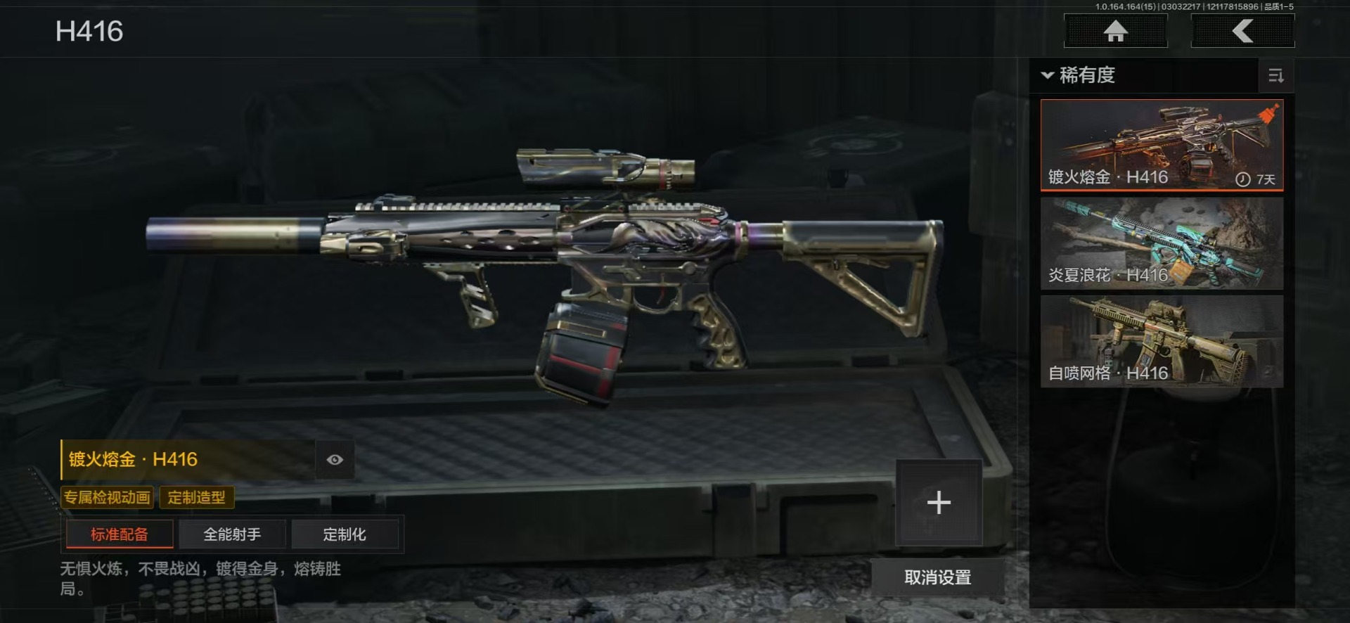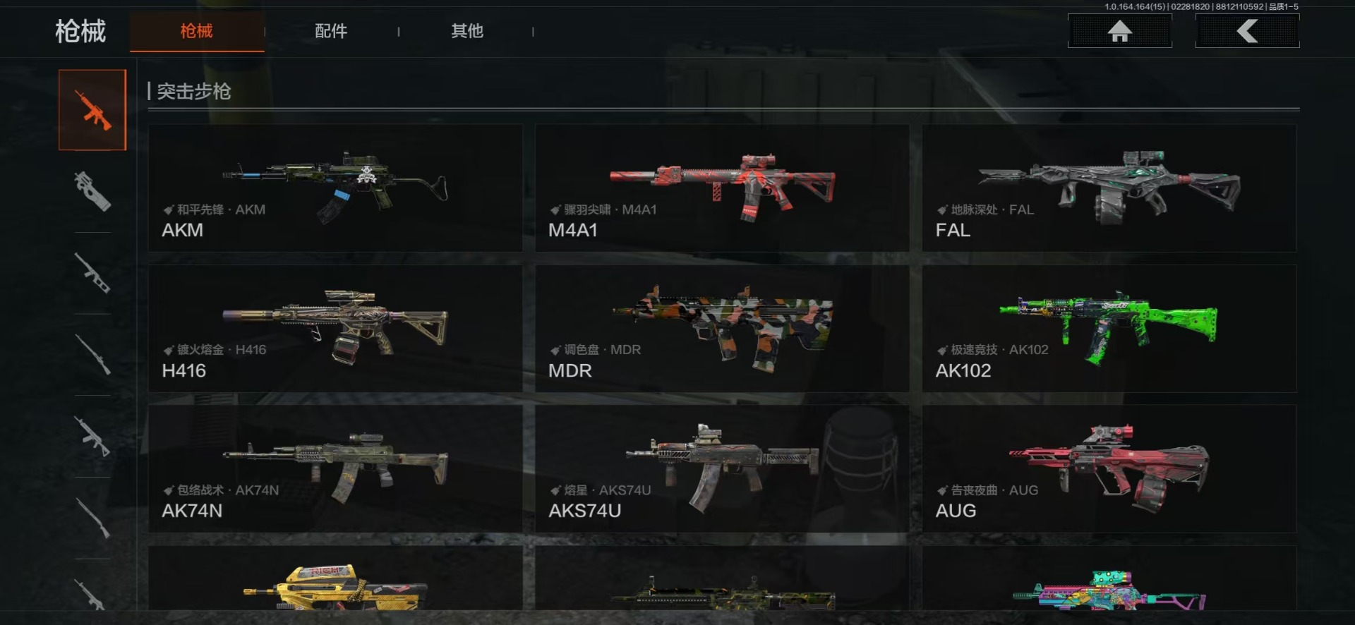 【金色枪皮】近卫荣誉·RPK16,包络战术·AKM,战术大师·AEK,地脉深处·FAL,旧王圣谕·VSS,千炼铁阵·MK14,百锻铁骑·AEK,镀火熔金·H416,战术大师·AK102,利齿风暴·MPX,告丧夜曲·AUG,棱光裂变·QBU191